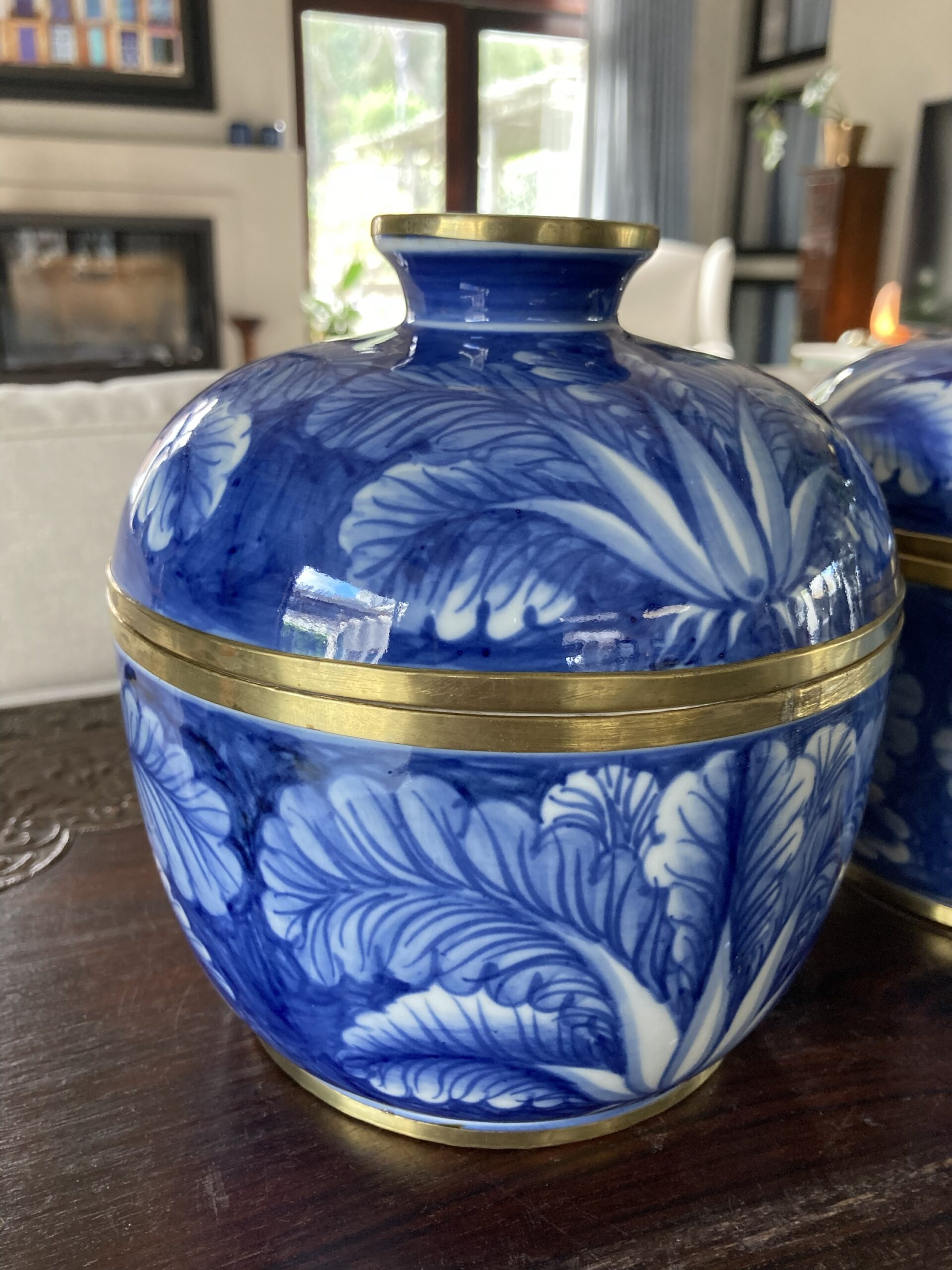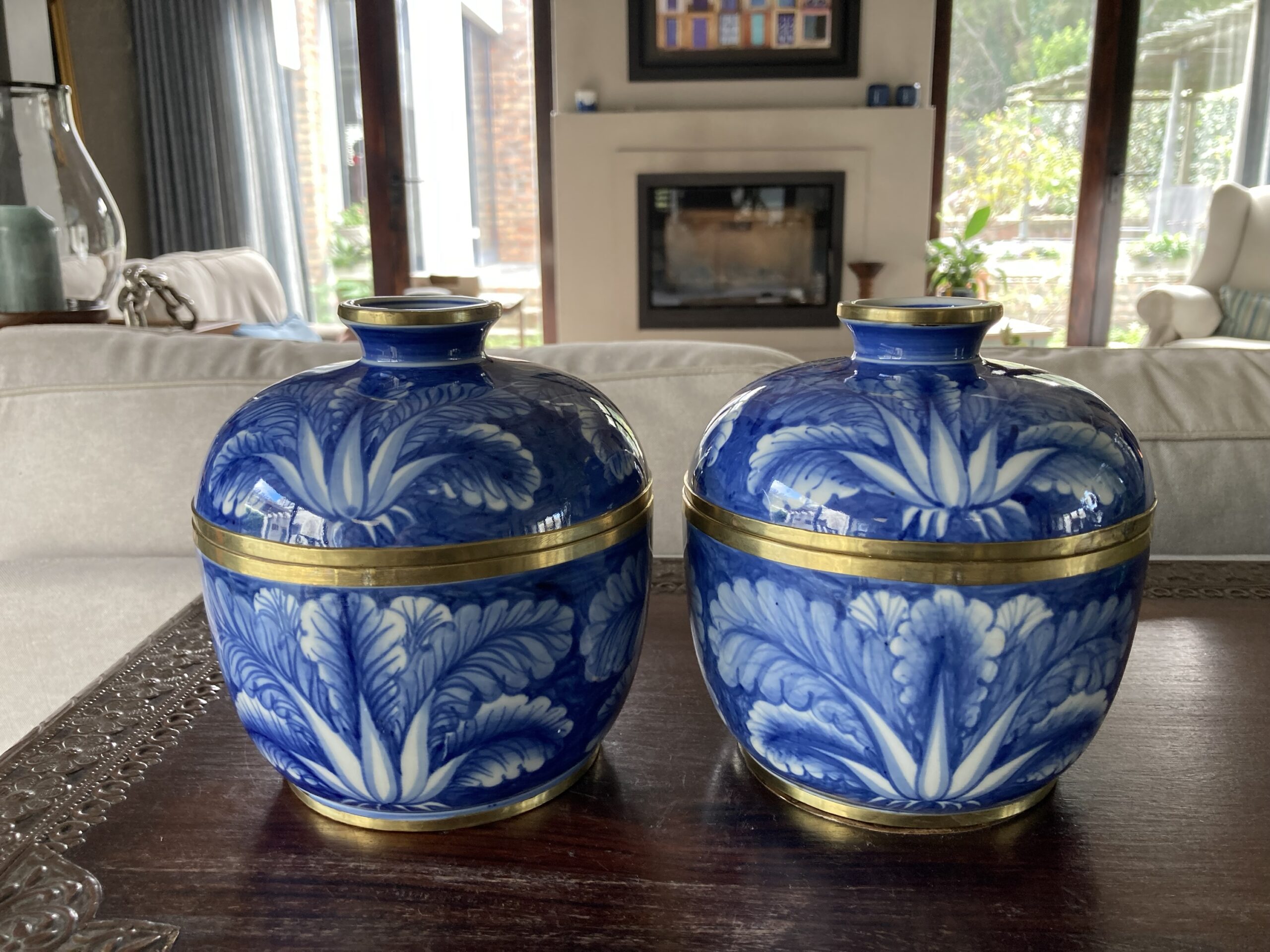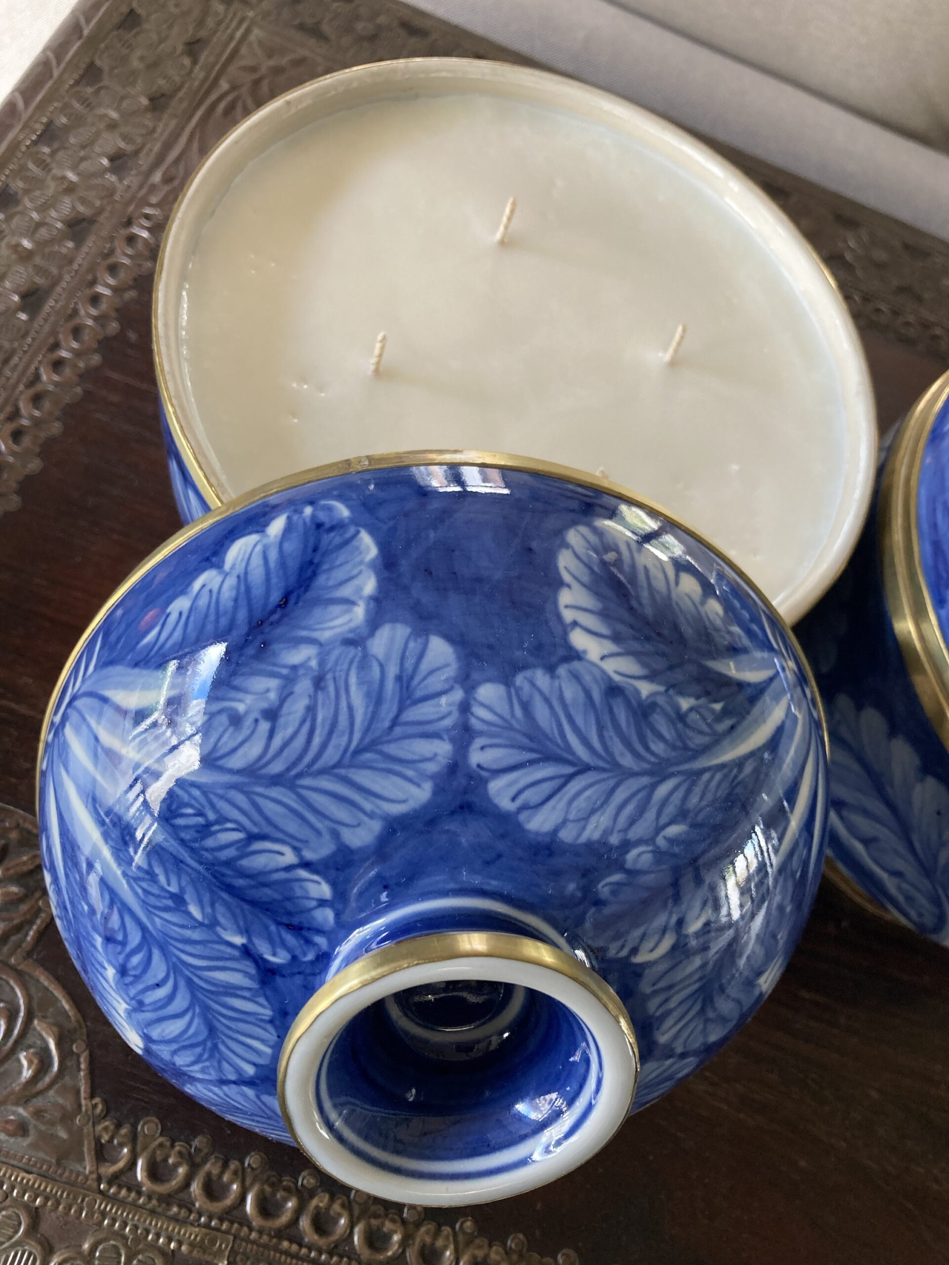 960g pure soy wax hand poured into one of our exclusive range of handmade ceramics. This jar has a blue and white design with a metal trim and is 160mm high and 155mm wide.