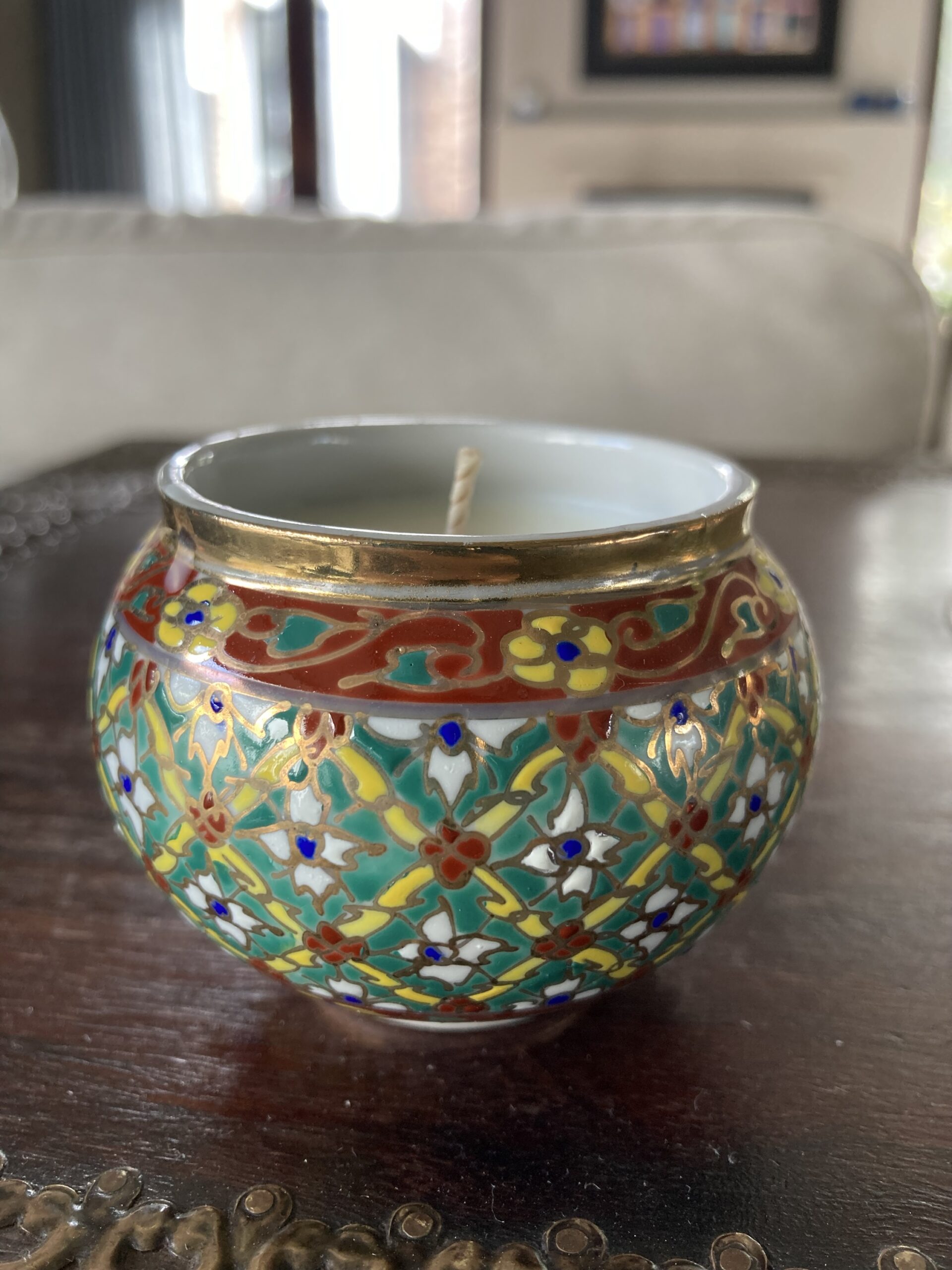 80gms pure soy wax hand poured into one of our exclusive range of handmade ceramics. This gorgeous small trinket bowl is in the Benjarong style.