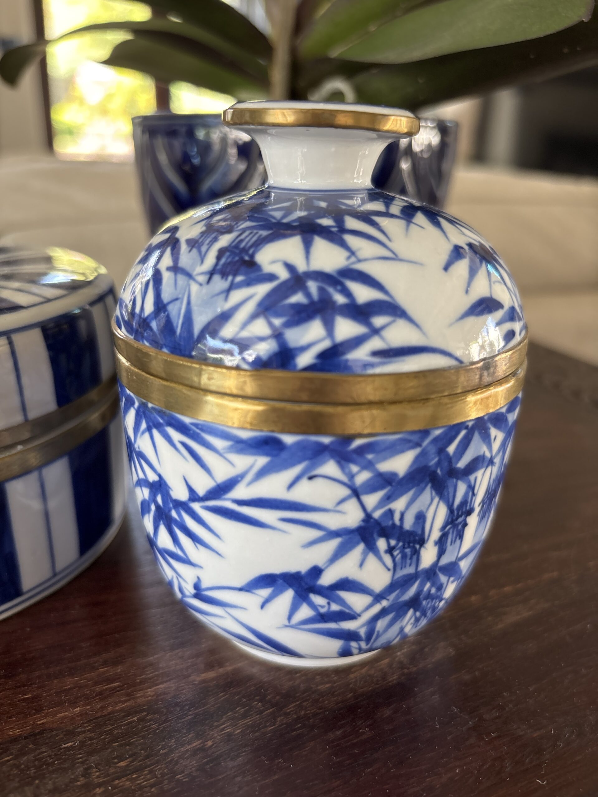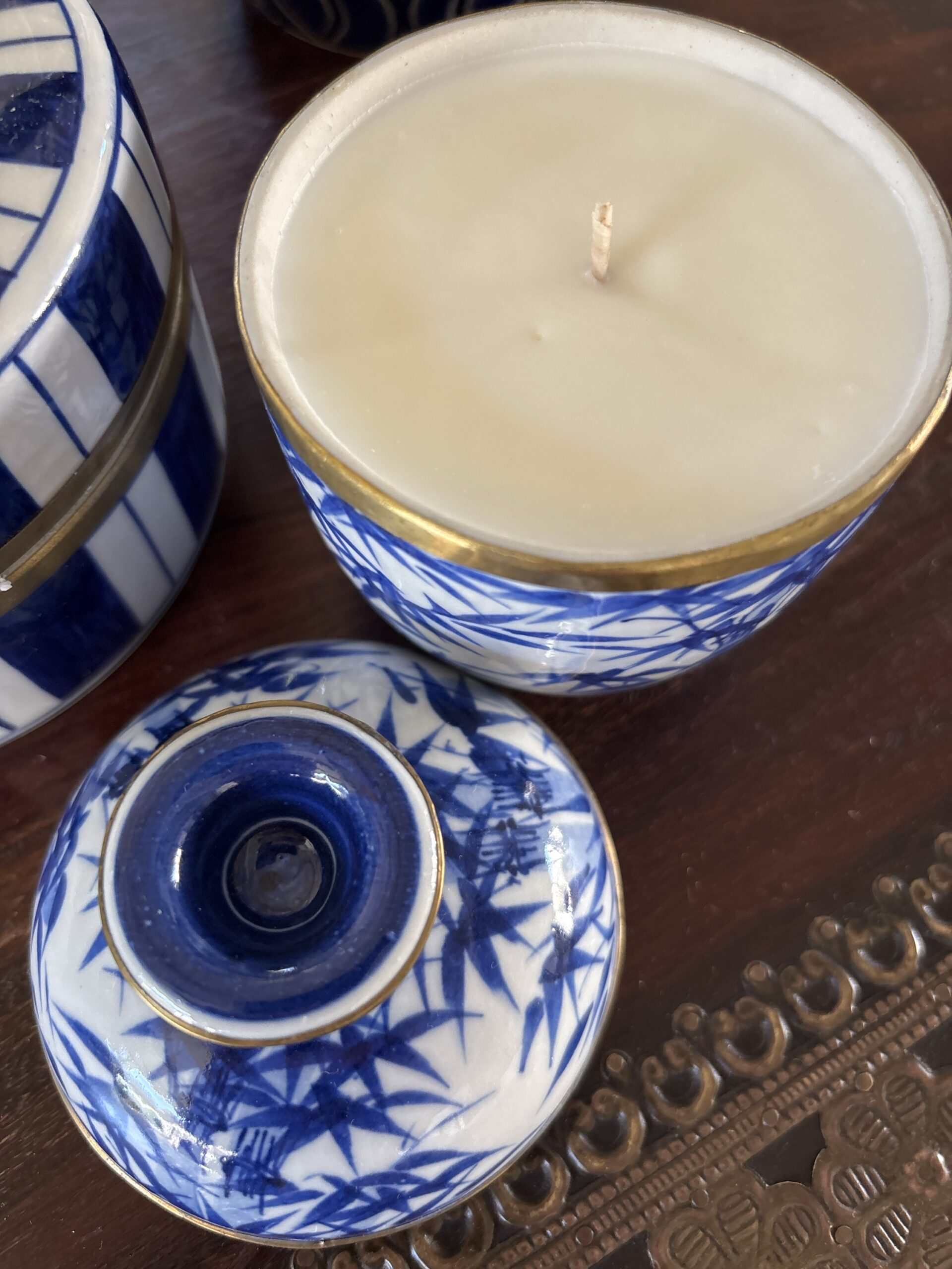 190gms pure soy wax hand poured into one of our exclusive range of handmade ceramics. This jar is blue and white with a metal trim and is 110mm high and 85mm wide.