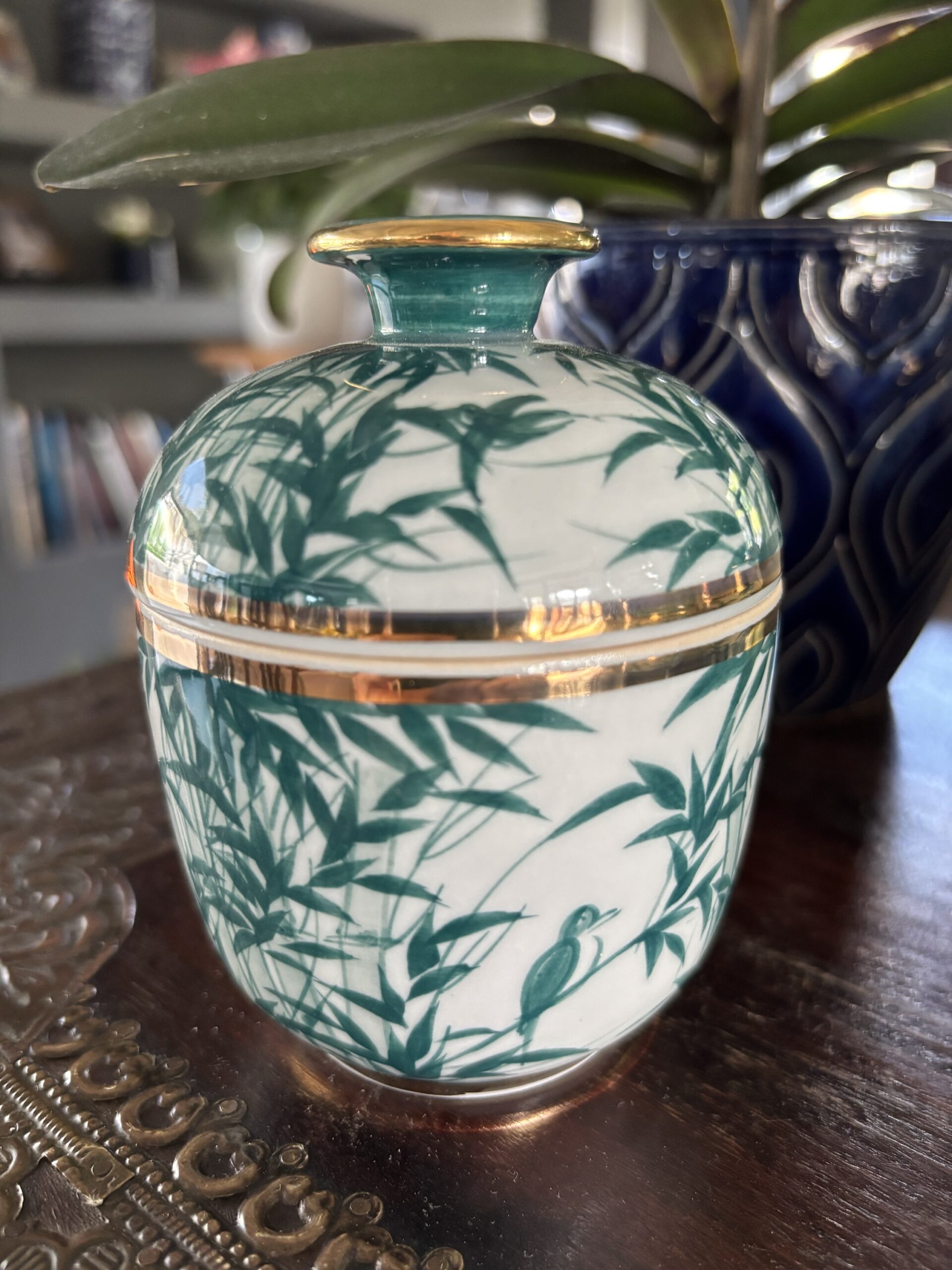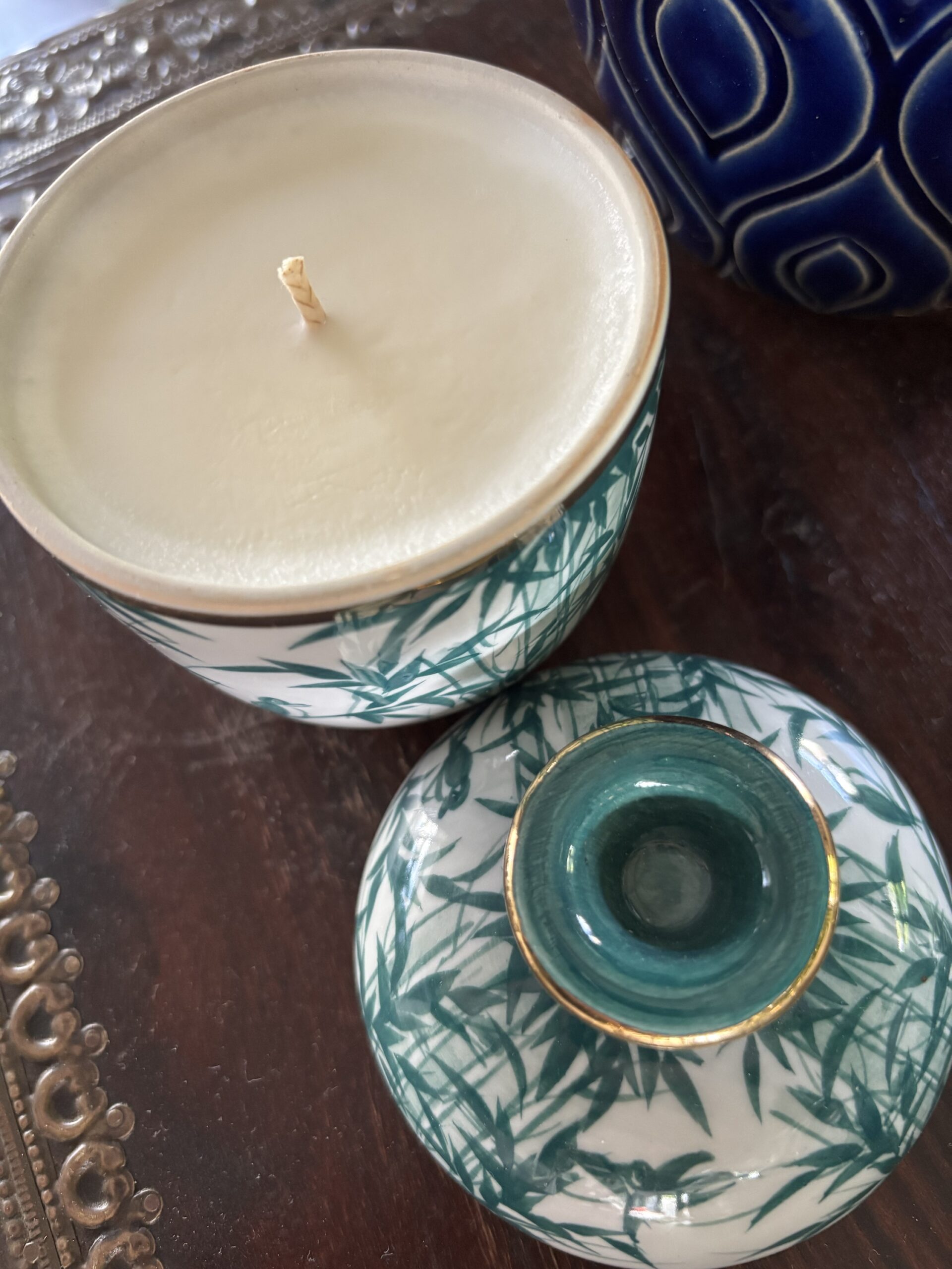 195gms pure soy wax hand poured into one of our exclusive range of handmade ceramics. This stunning jar is teal and white with a gold rim and is 110mm high and 85mm wide.