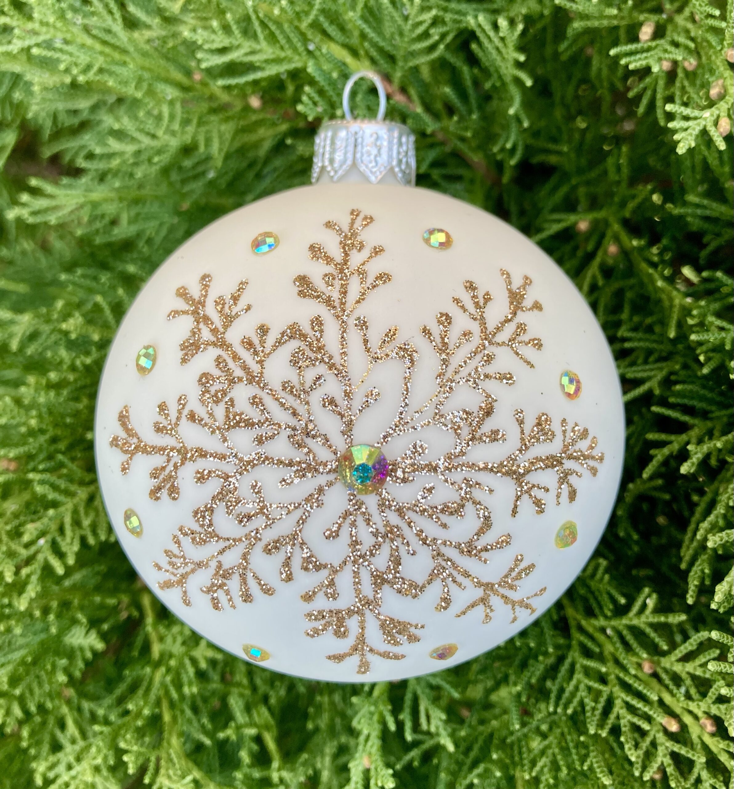 - Matte cream ornament with gold glitter snowflake and embellished with crystals