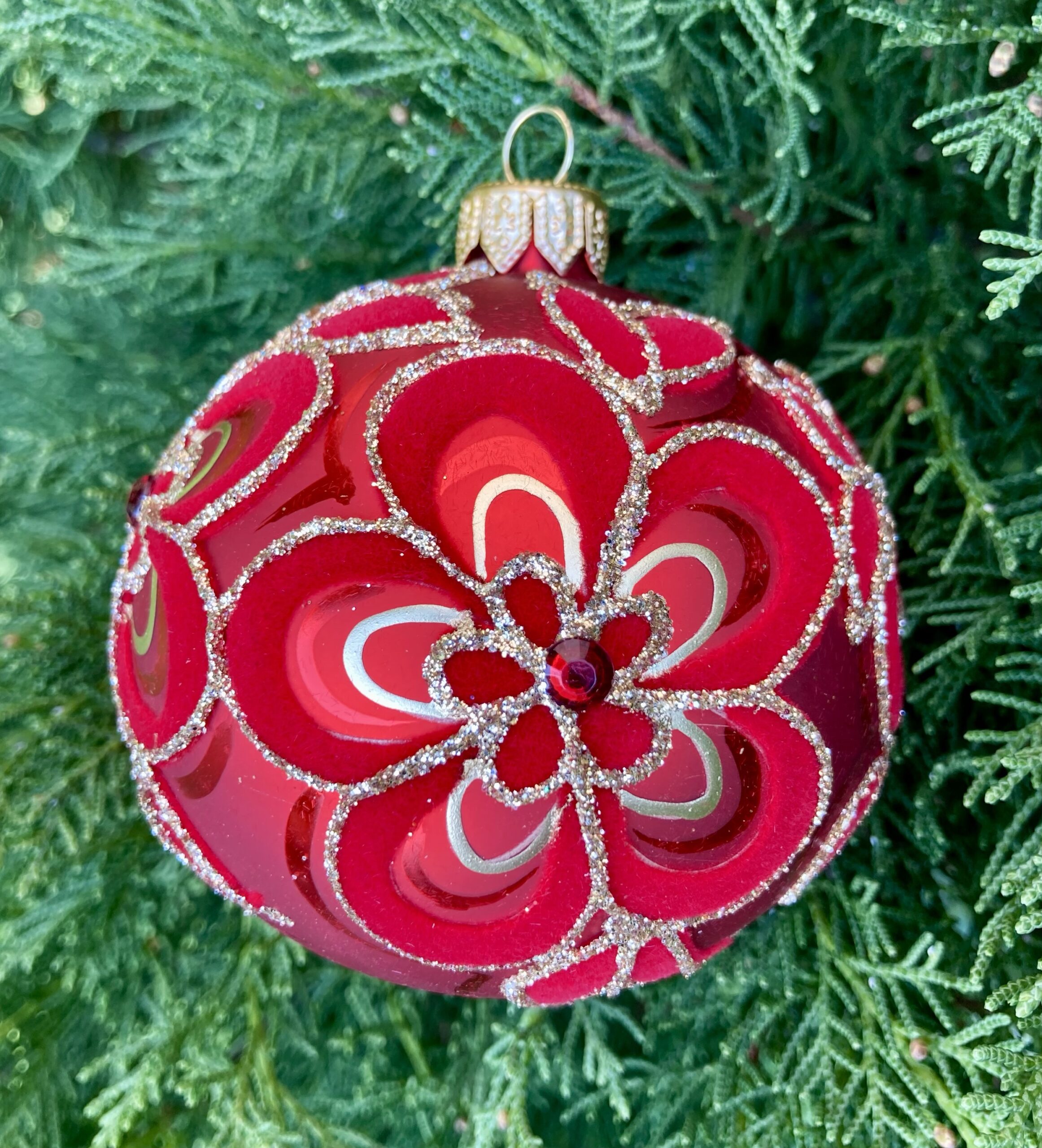- Matte red ornament embellished with red flocking, gold glitter and red crystals
