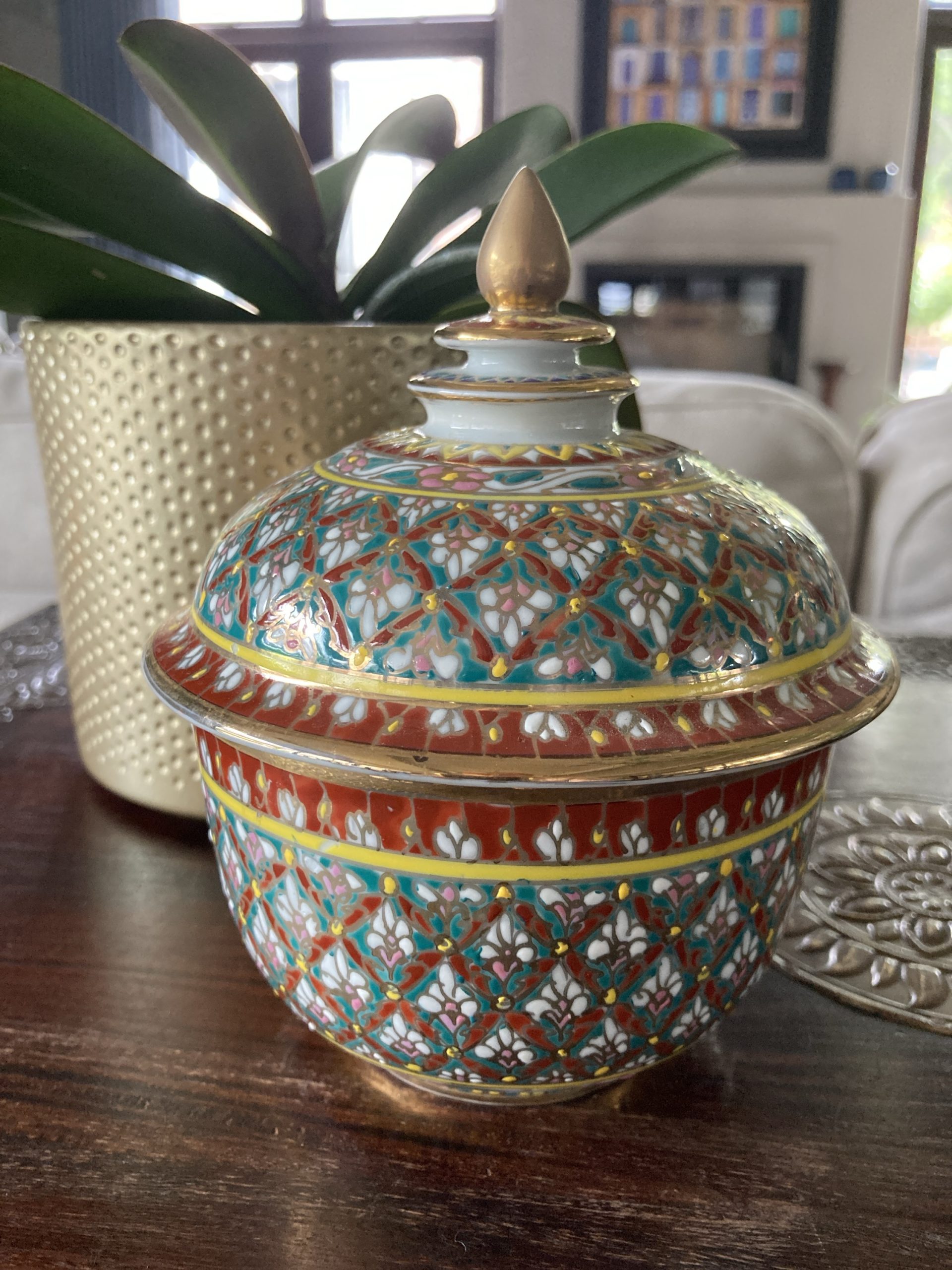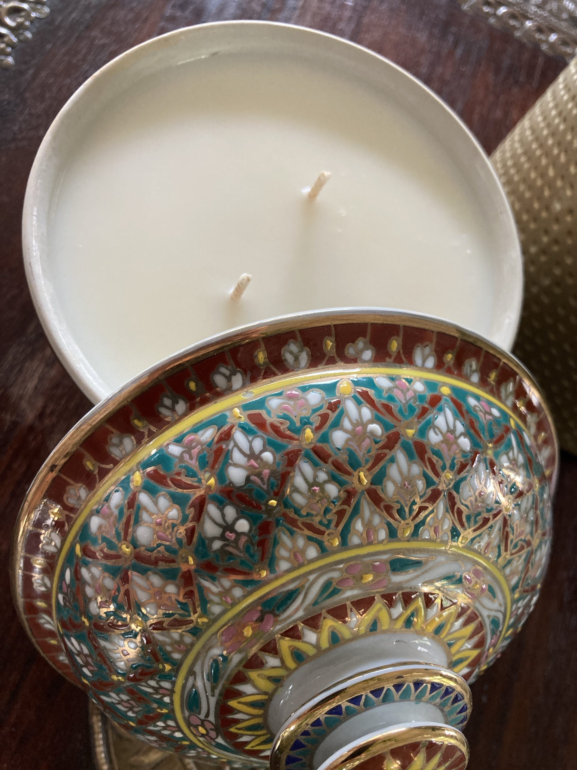 360gms pure soy wax hand poured into one of our exclusive range of handmade ceramics.  This Benjarong pot is green with white, pink, rust and gold accents and is 155mm high and 125mm wide.