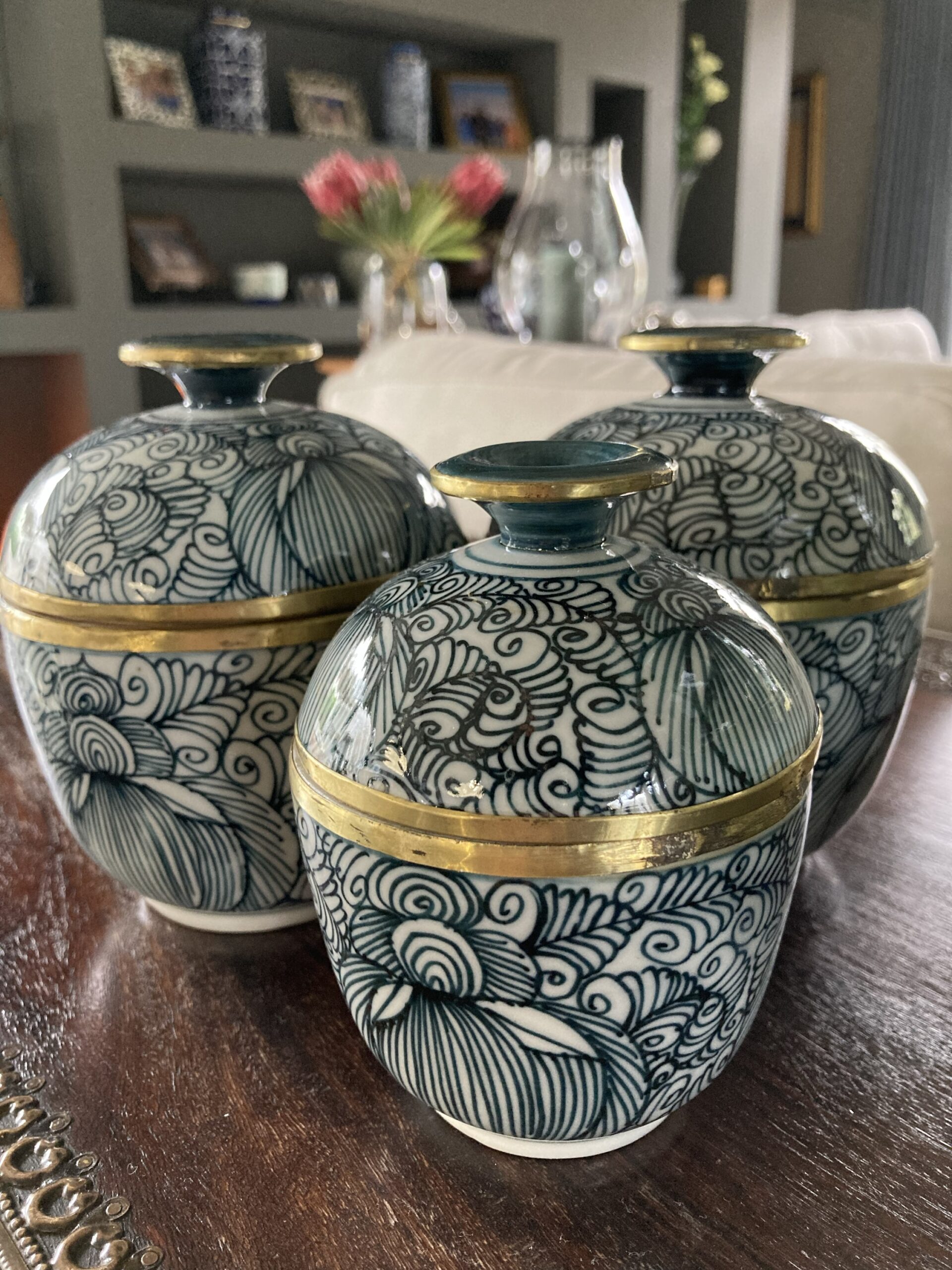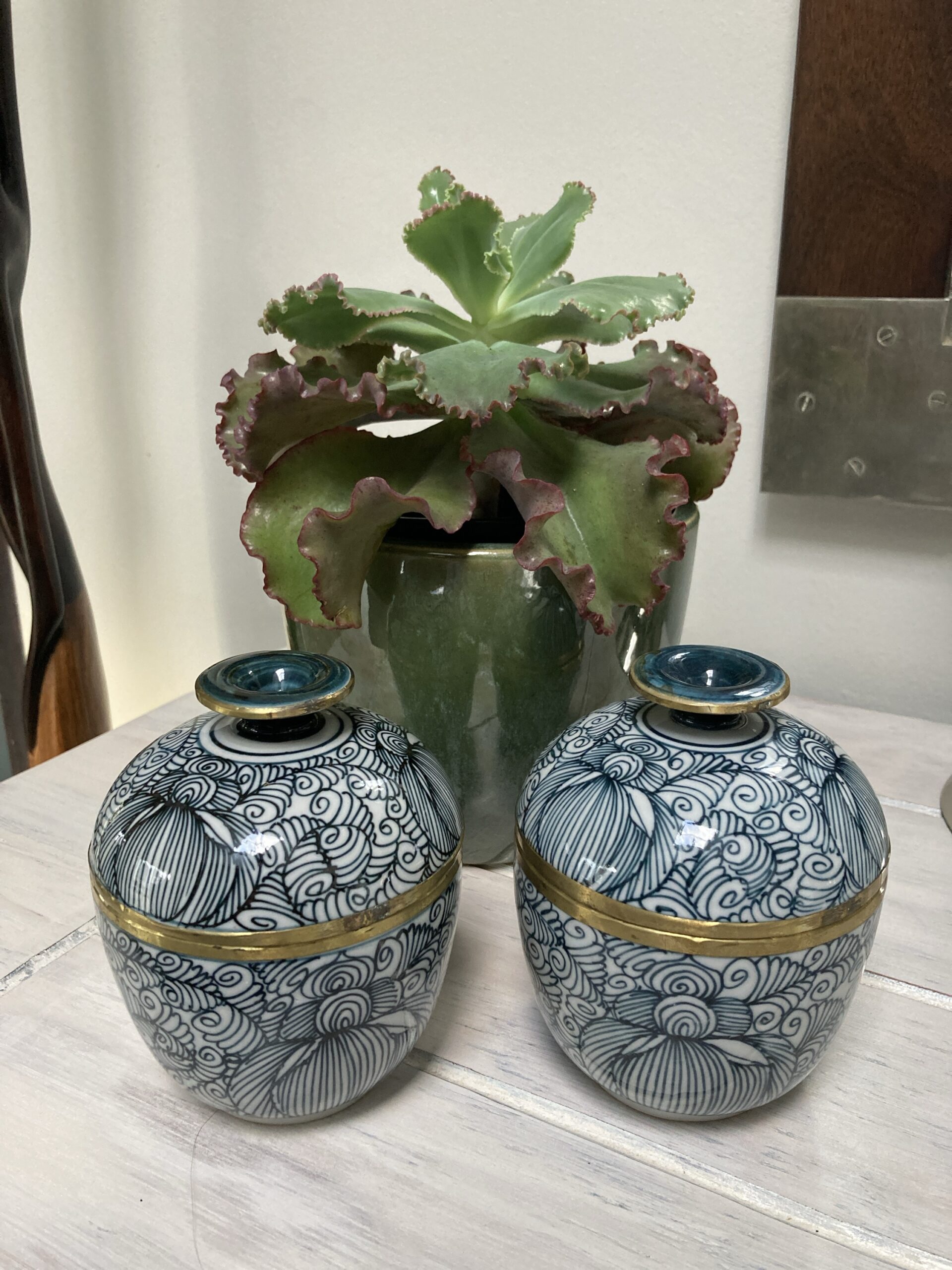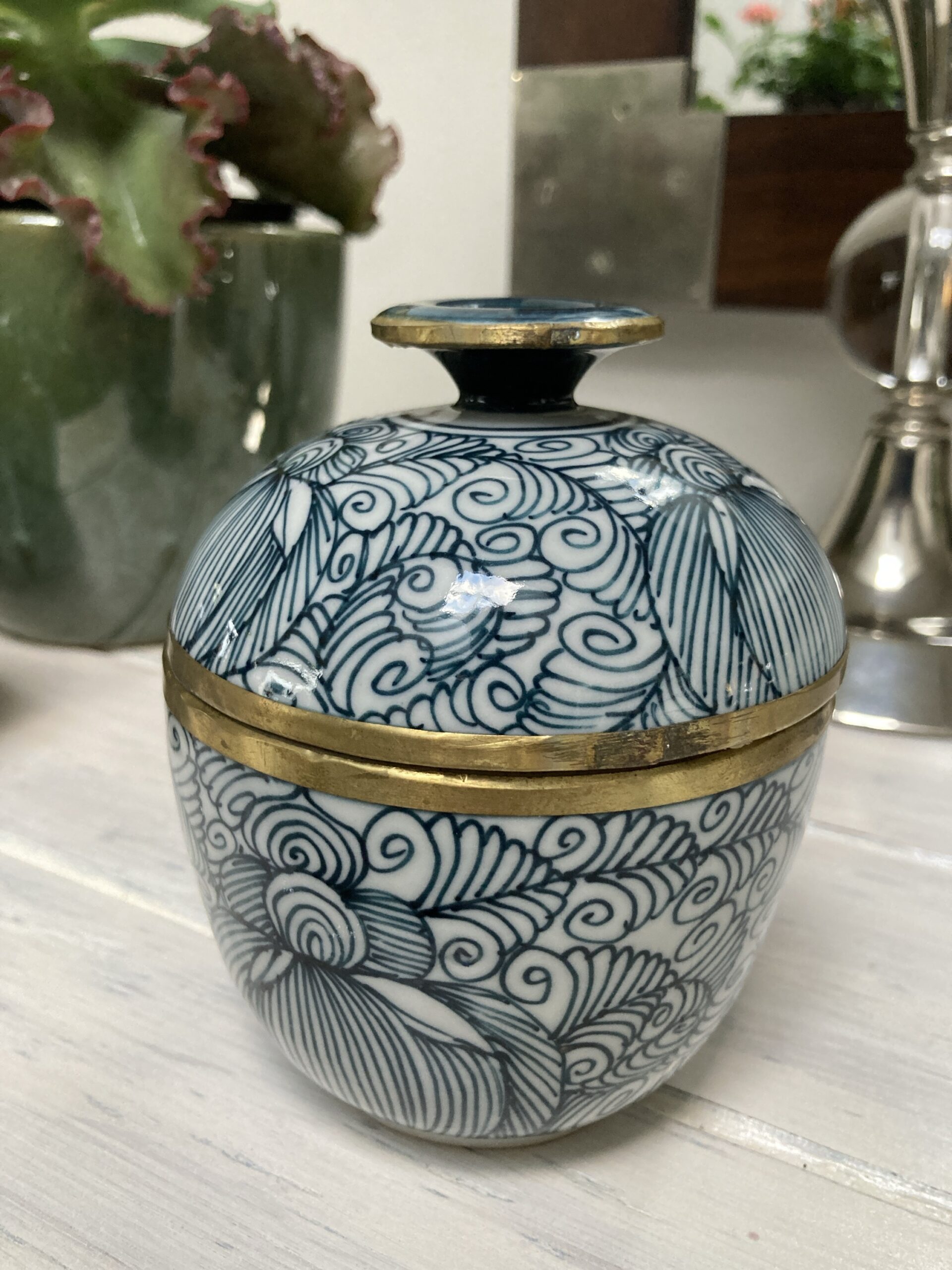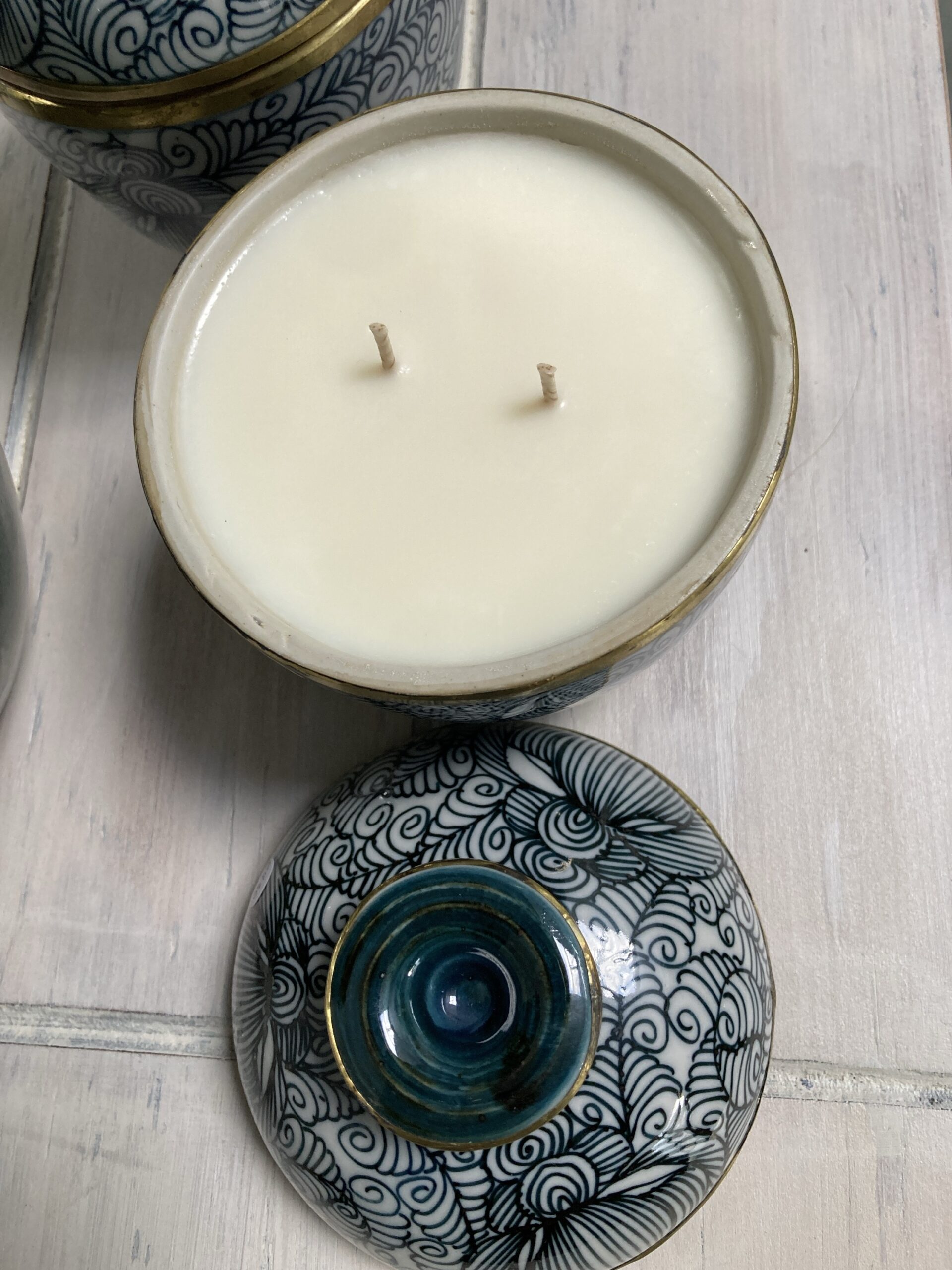 315gms pure soy wax hand poured into one of our exclusive range of handmade ceramics. This stunning jar is dark charcoal green and white with a metal trim and is 125mm high and 100mm wide.