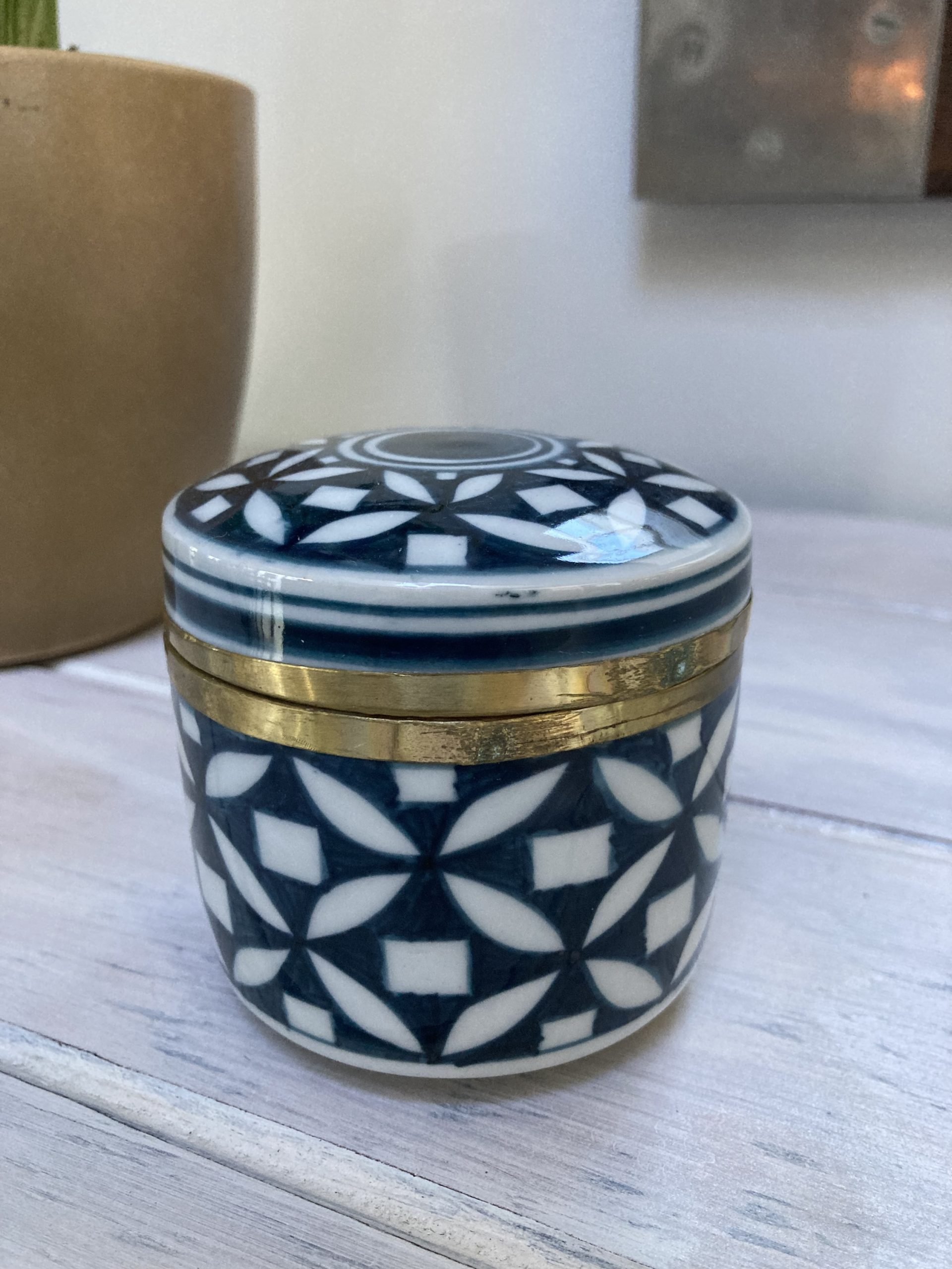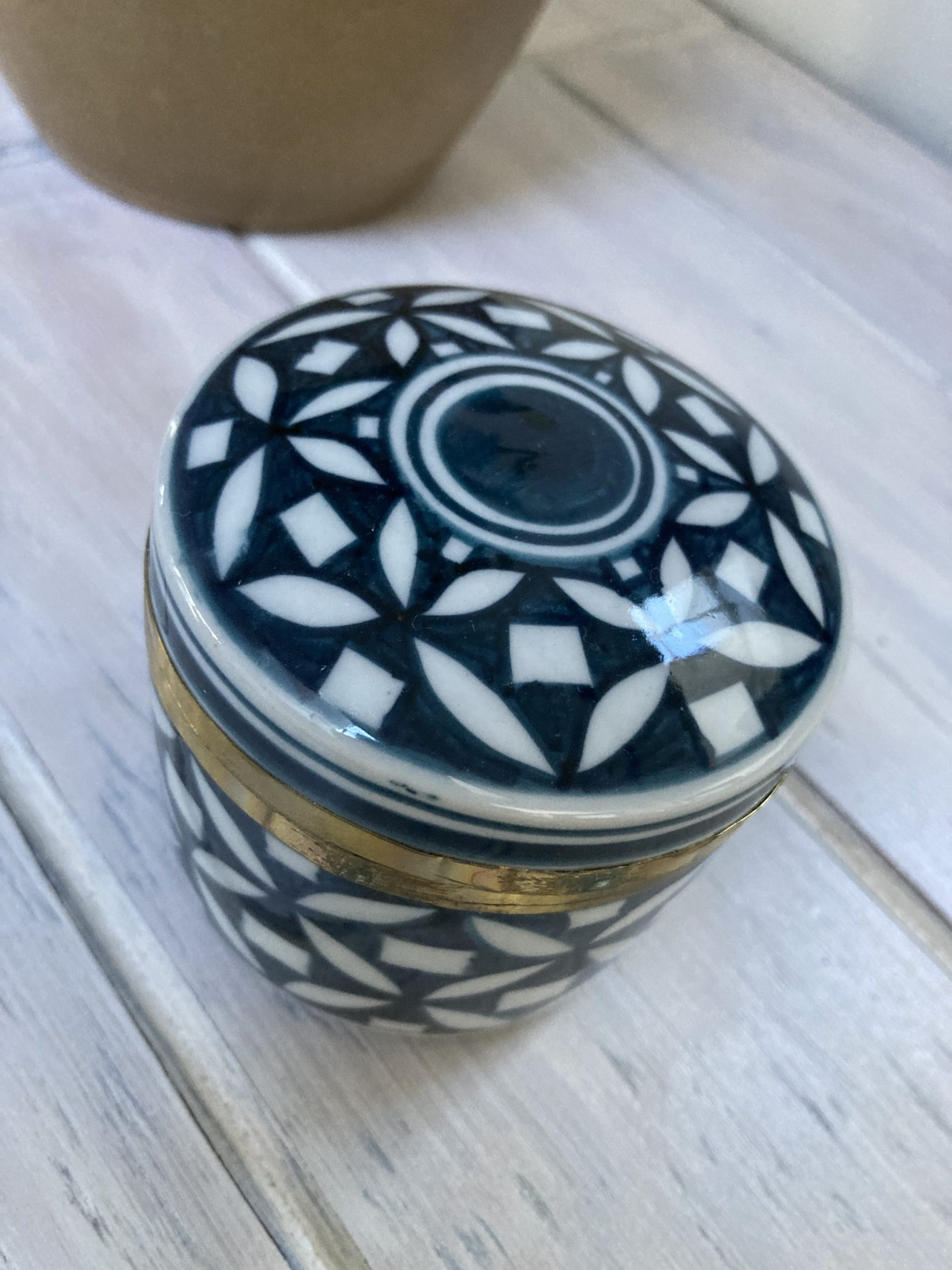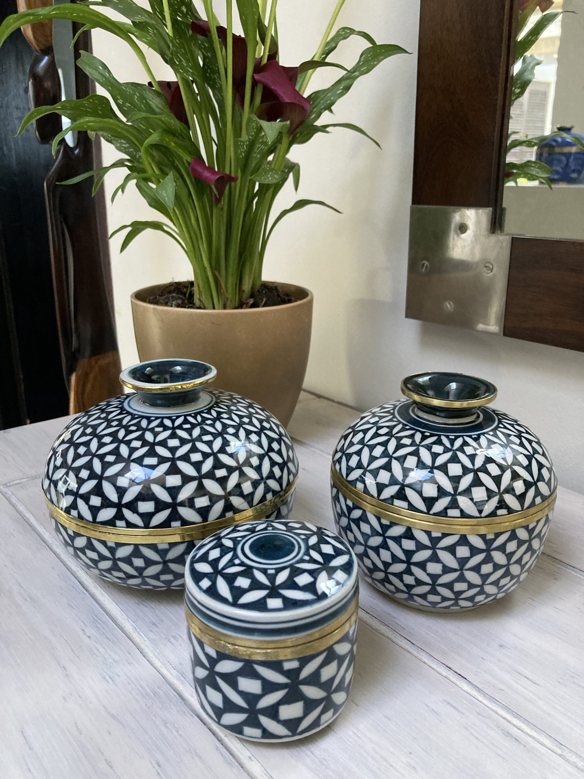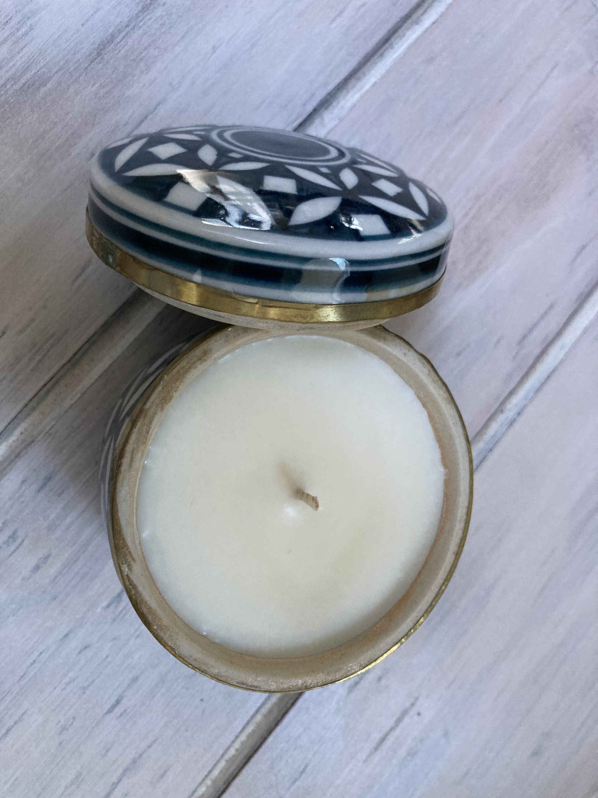 145gms pure soy wax hand poured into one of our exclusive range of handmade ceramics. This stunning jar is dark charcoal green and white with a metal trim and is 80mm high and 80mm wide.