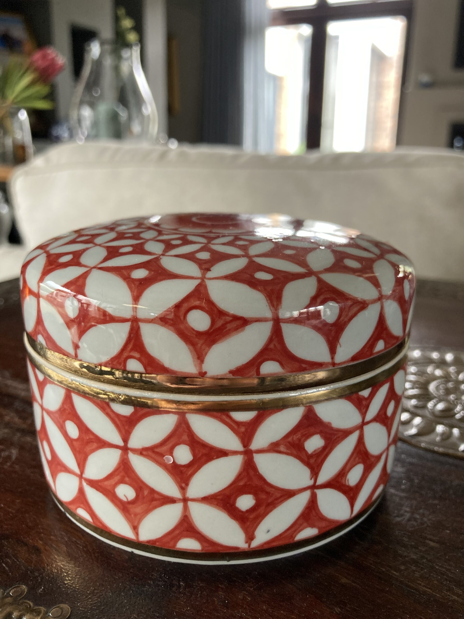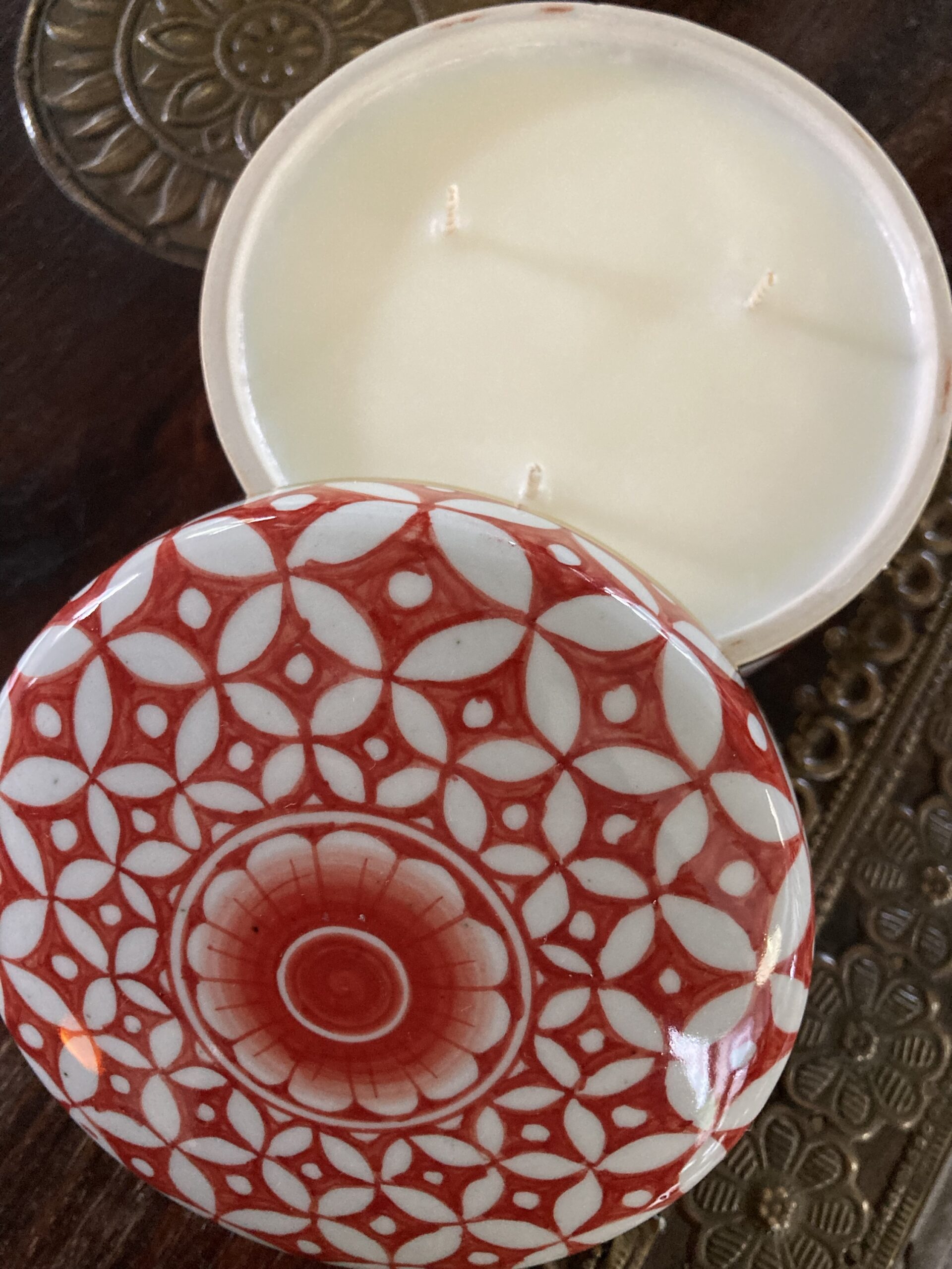 255gms pure soy wax hand poured into one of our exclusive range of handmade ceramics. This stunning box is coral and white with a gold rim and is 75mm high and 110 wide.