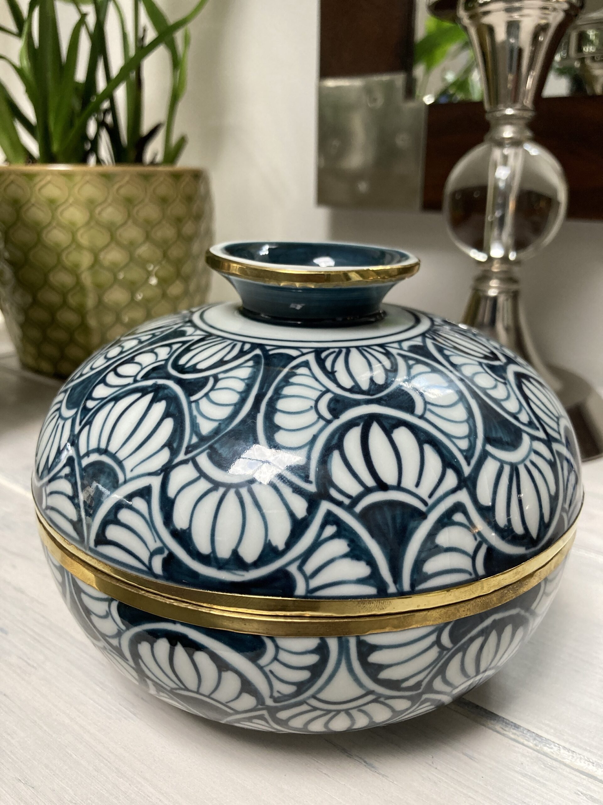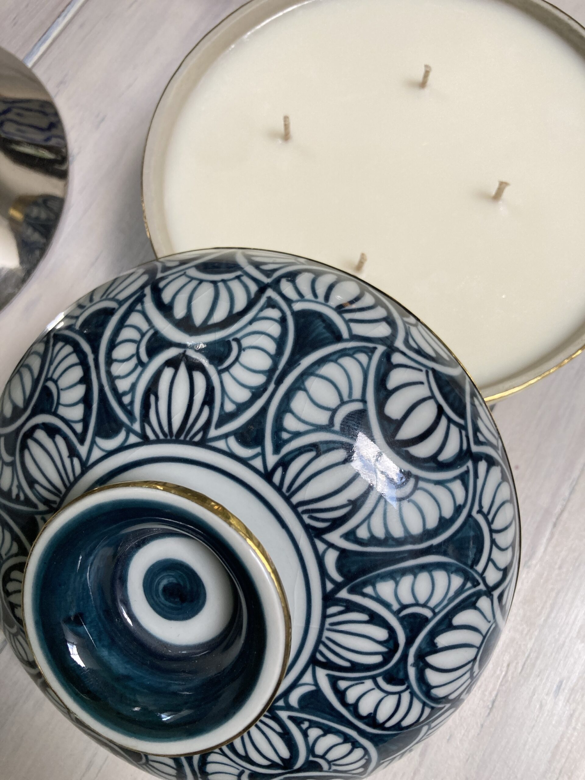 460gms pure soy wax hand poured into one of our exclusive range of handmade ceramics. This stunning jar is dark charcoal green and white with a metal trim and is 125mm high and 155mm wide.