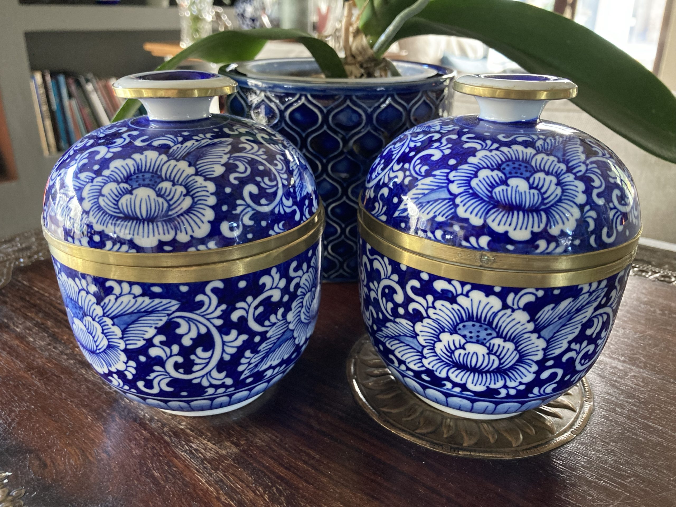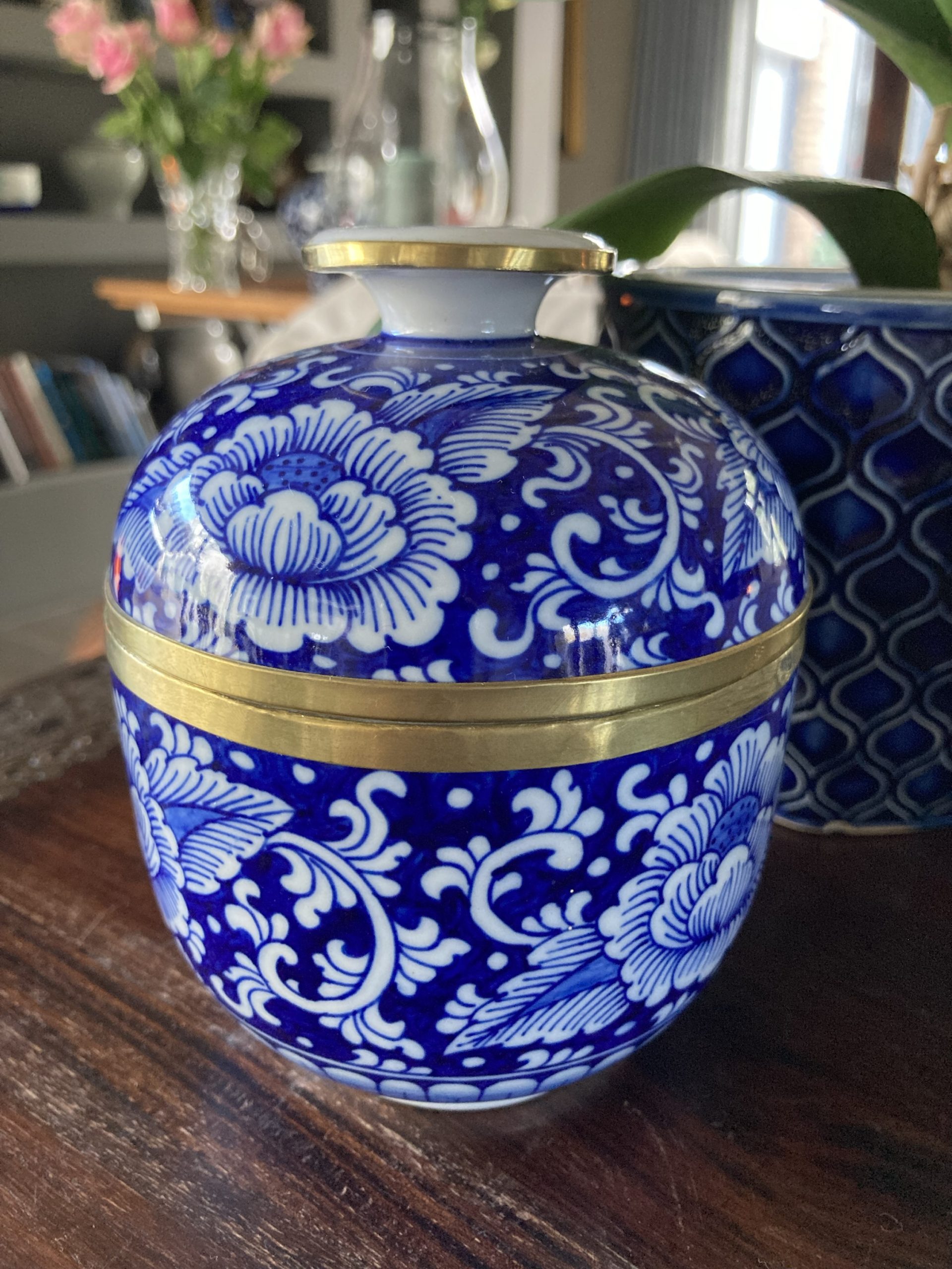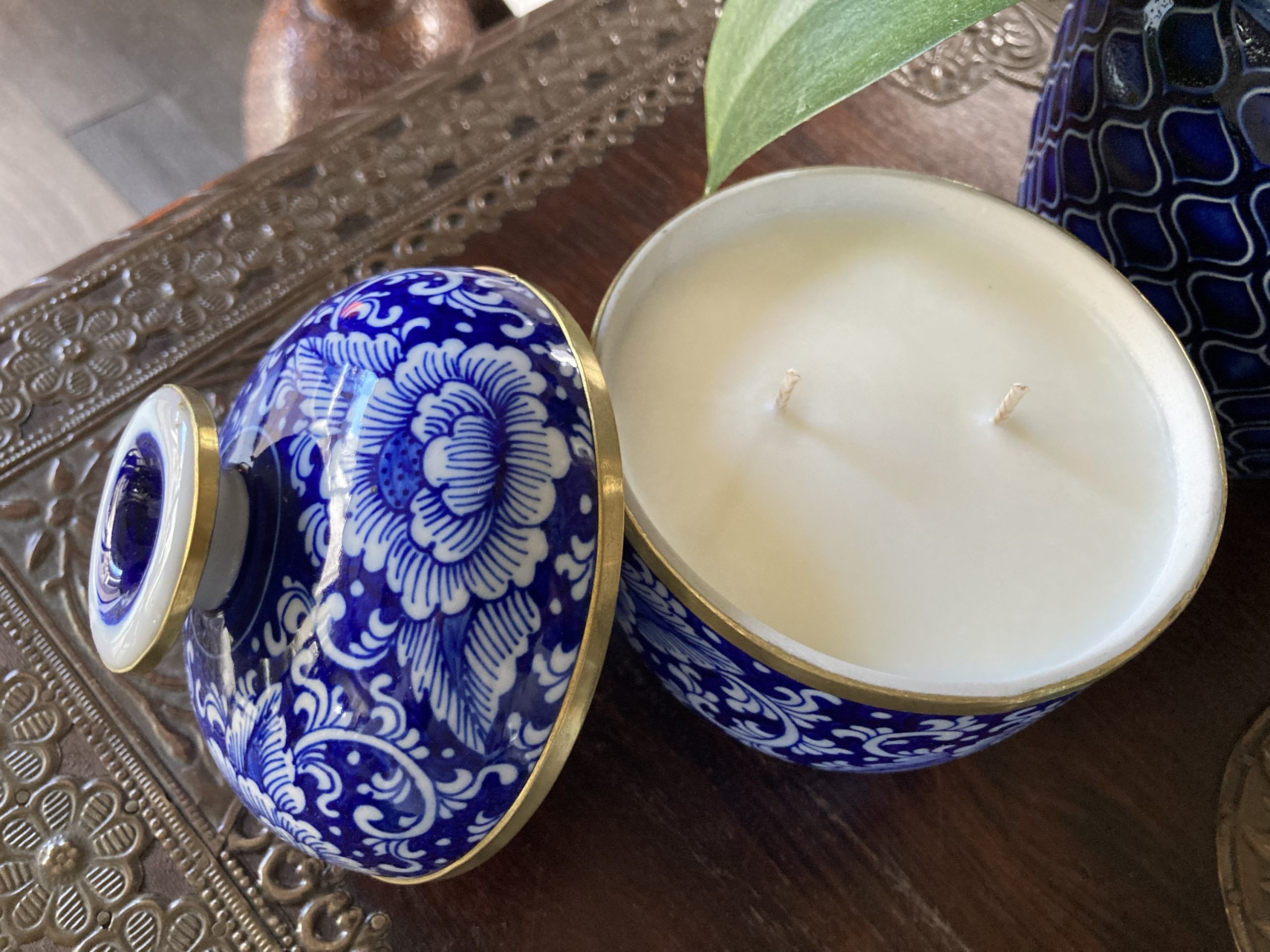 330gms pure soy wax hand poured into one of our exclusive range of handmade ceramics. This beautiful royal blue and white jar has a metal trim and is 130mm high and 105mm wide.