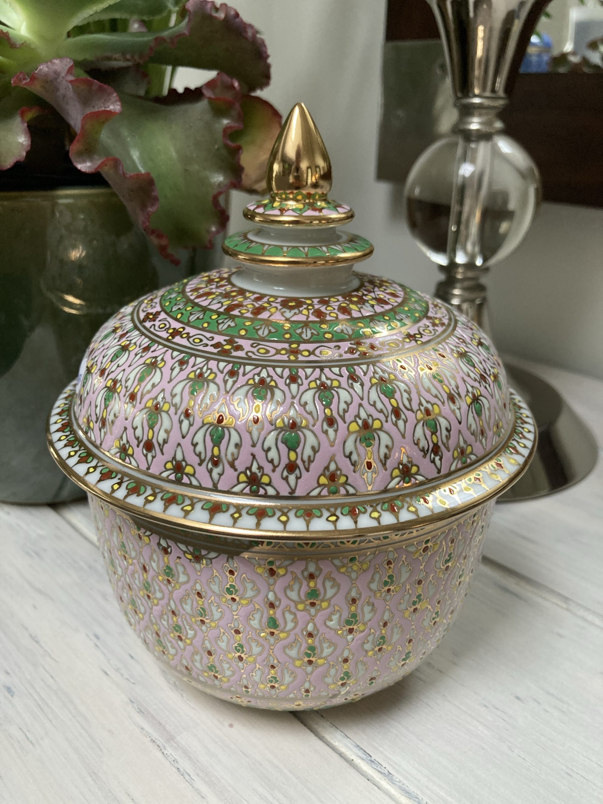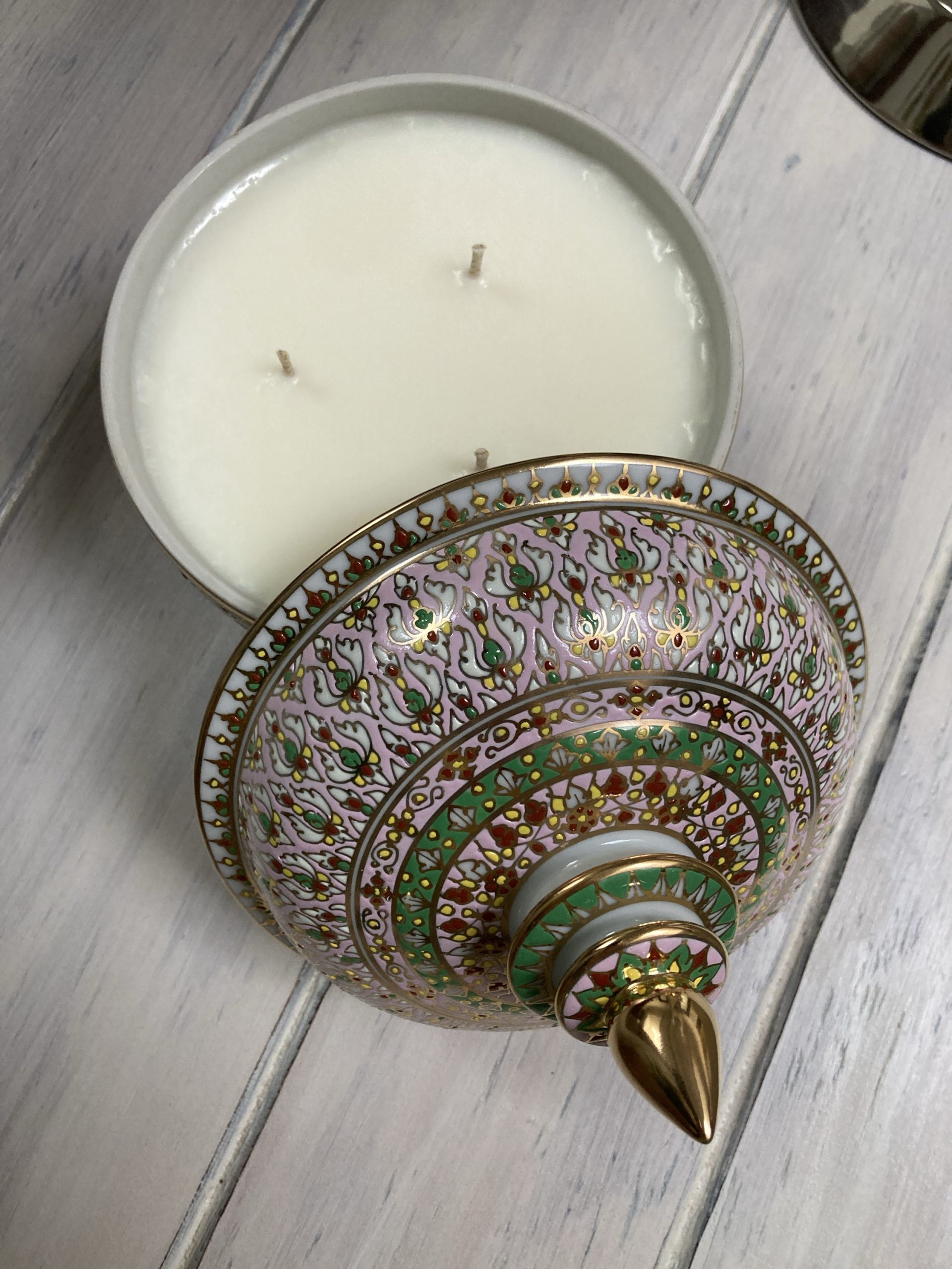 630gms pure soy wax hand poured into one of our exclusive range of handmade ceramics. This Benjarong pot is pale pink with green, white and gold accents and is 180mm high and 145mm wide.