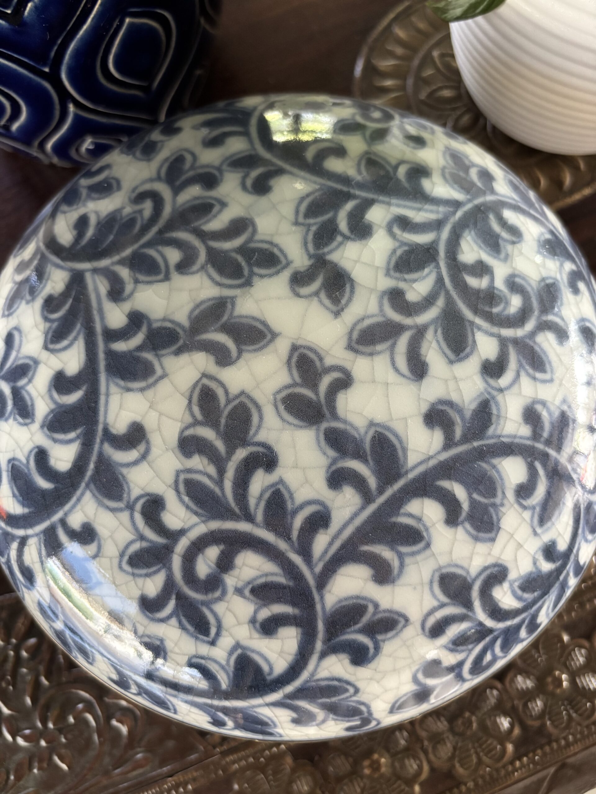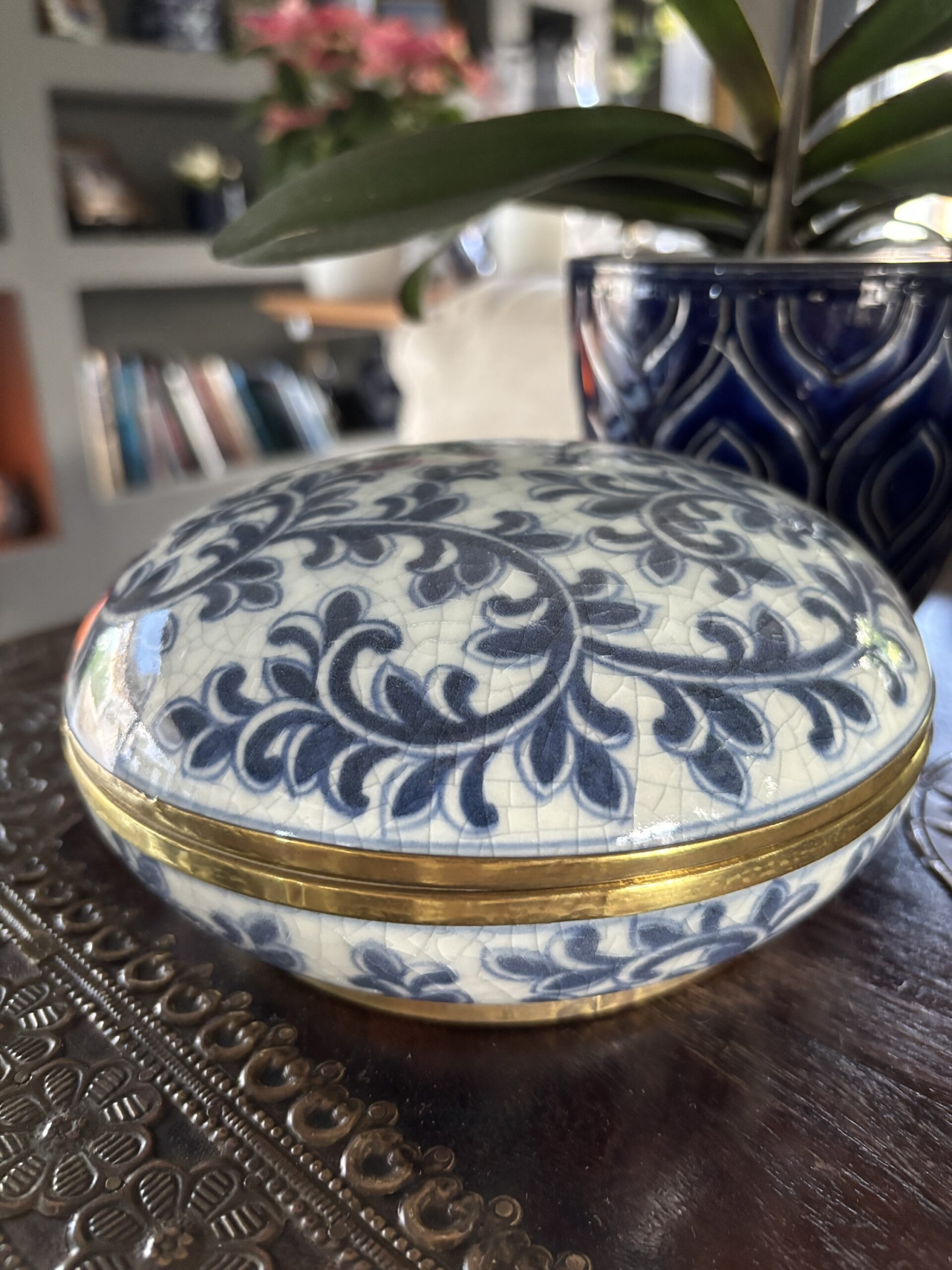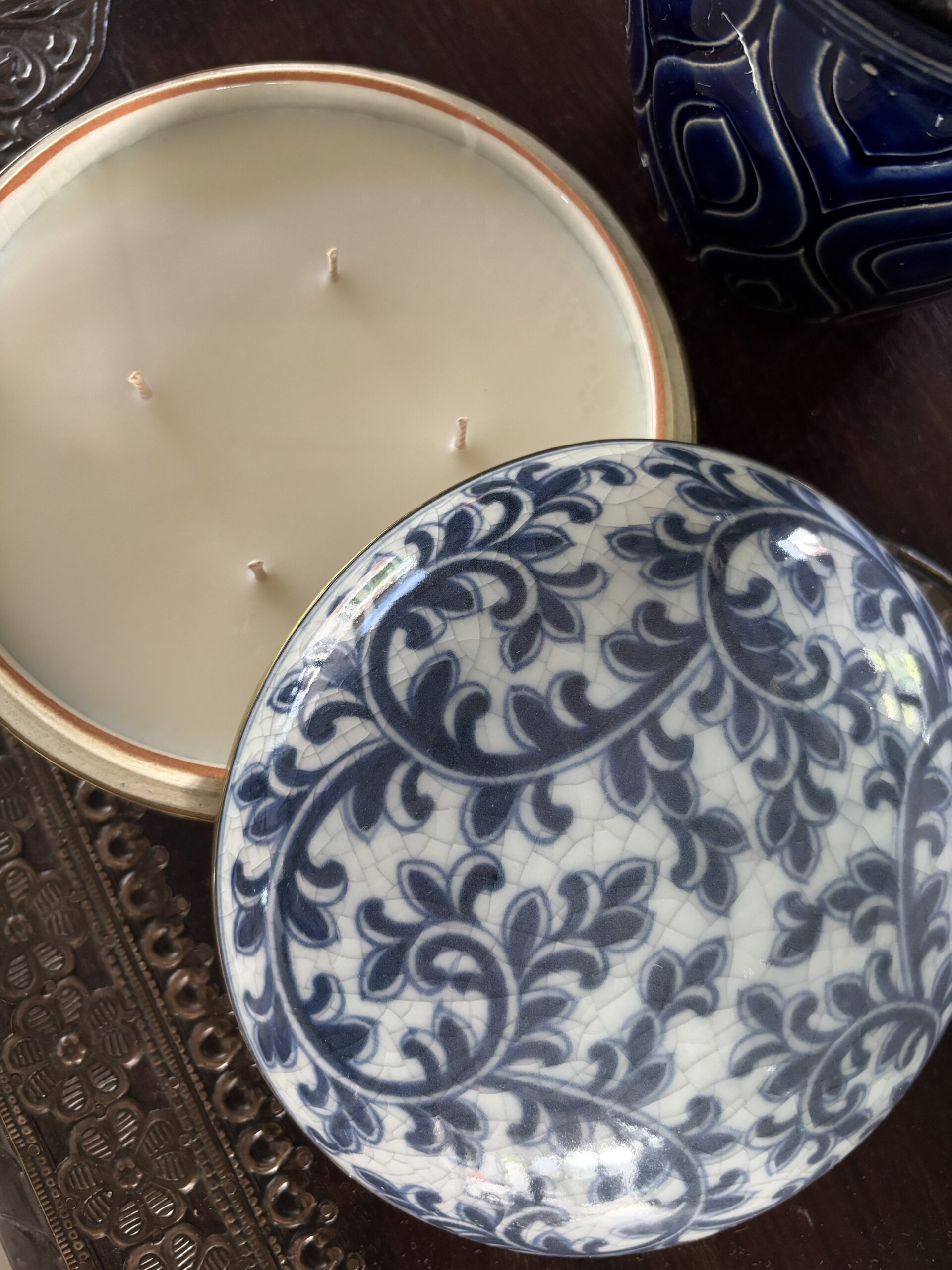 400gms pure soy wax hand poured into one of our exclusive range of handmade ceramics. This stunning round bowl has a blue and white design with metal trim and is 80mm high and 165mm wide.