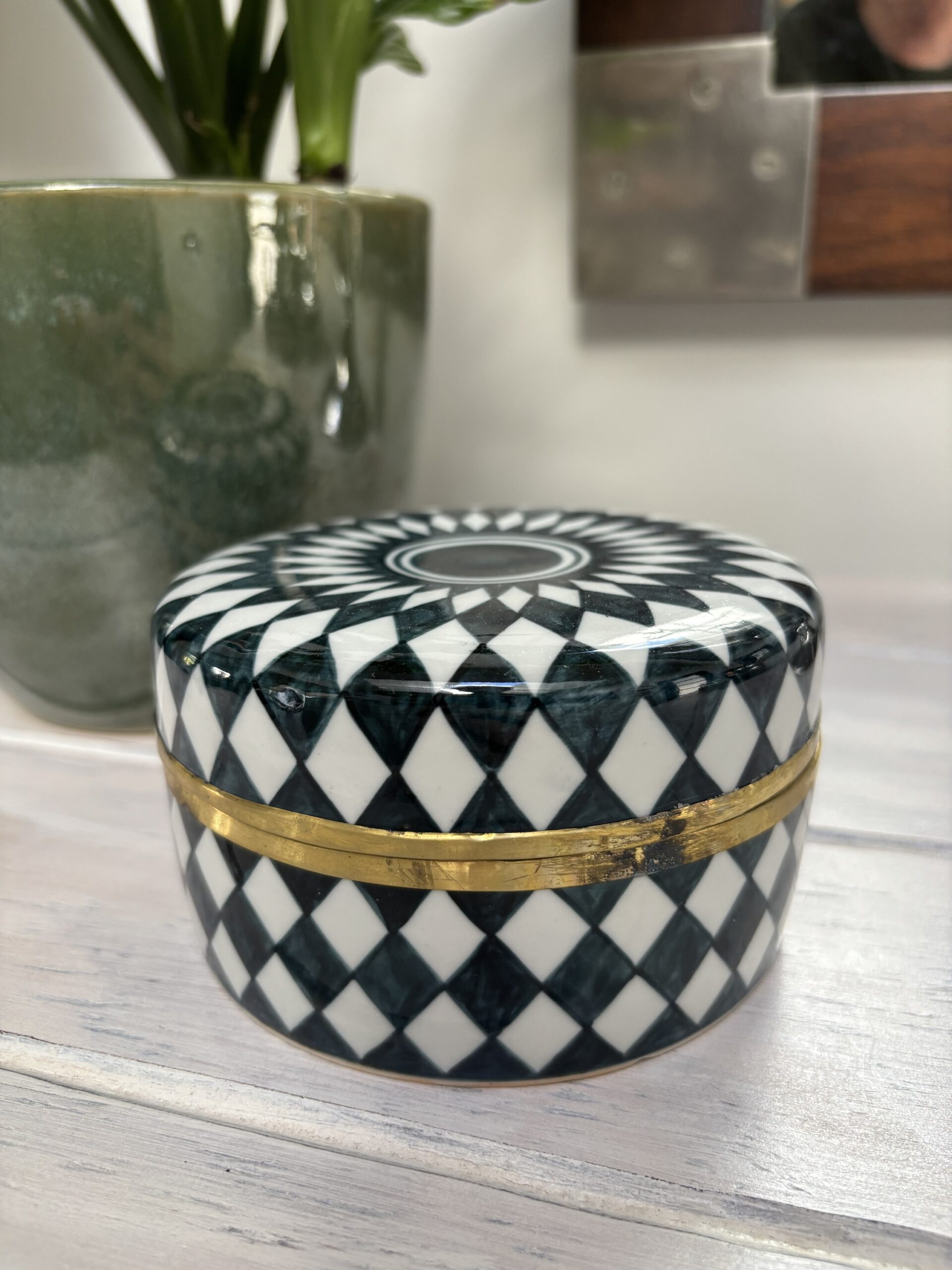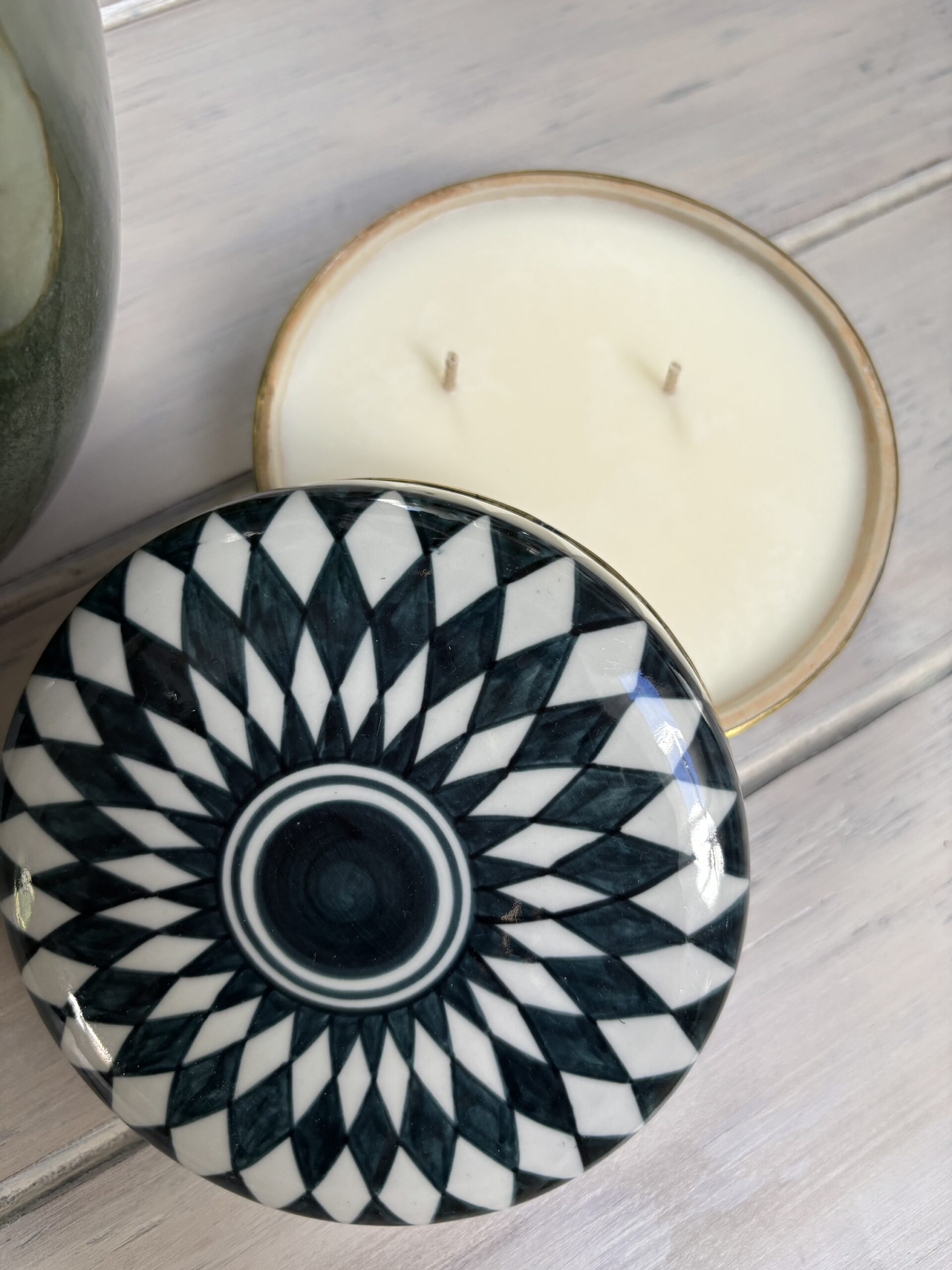 230gms pure soy wax hand poured into one of our exclusive range of handmade ceramics.  This stunning box is dark charcoal green and white with a metal trim and is 70mm high and 125mm wide.