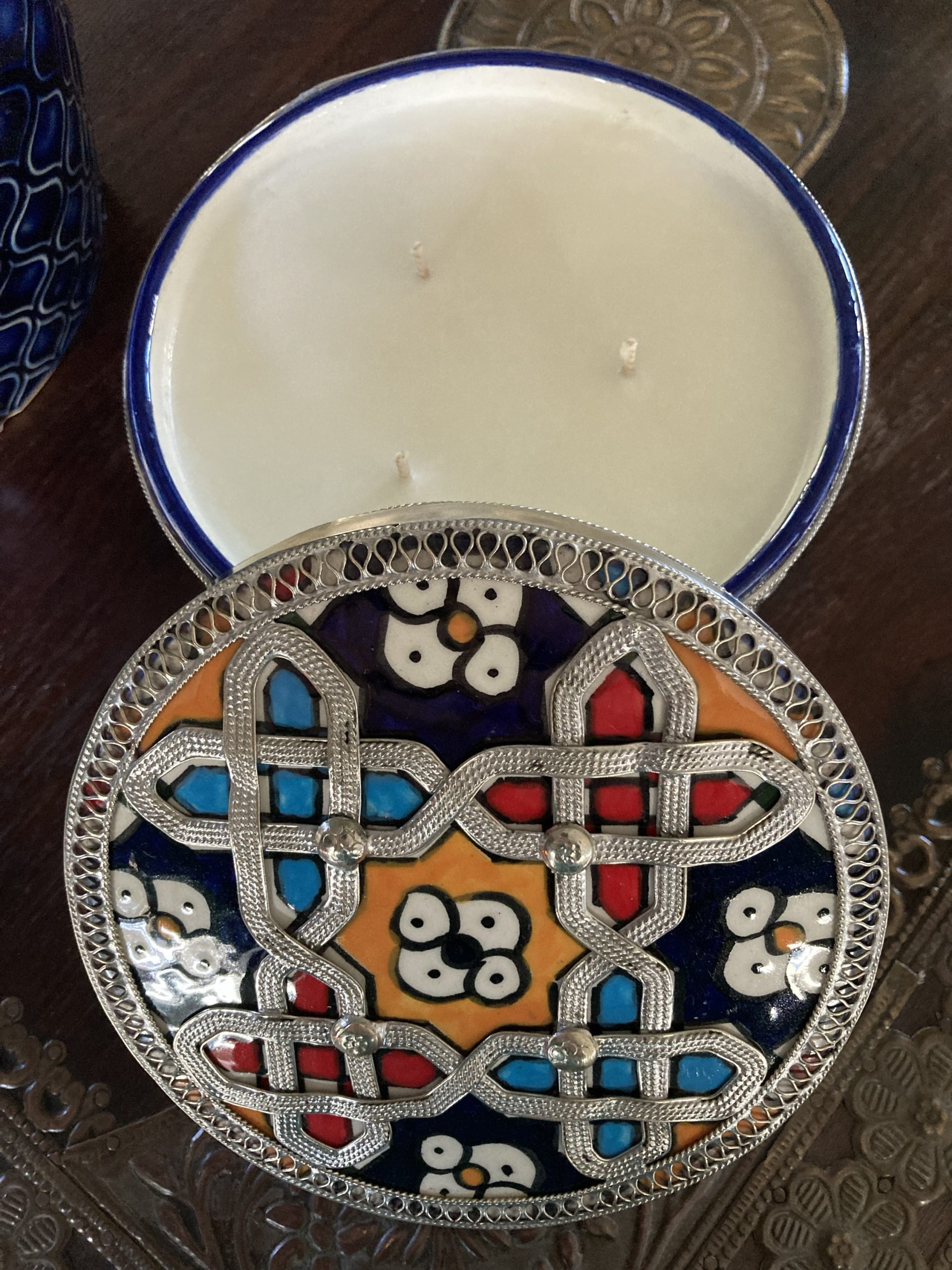 375gms pure soy wax hand poured into one of our new range of handmade ceramics from Morocco. This box is royal blue with colourful accents with intricate metal work and is 70mm high and 130mm wide.