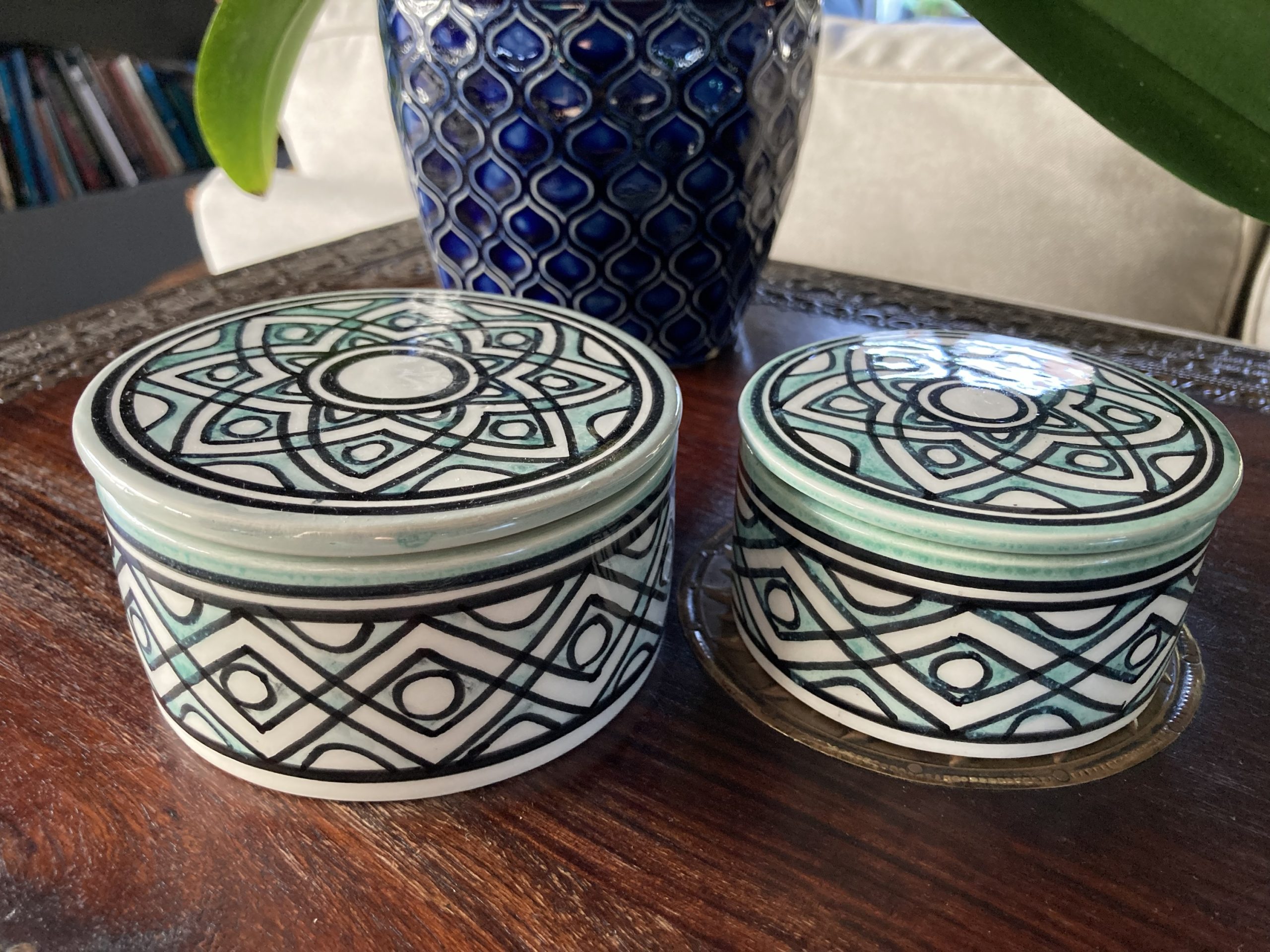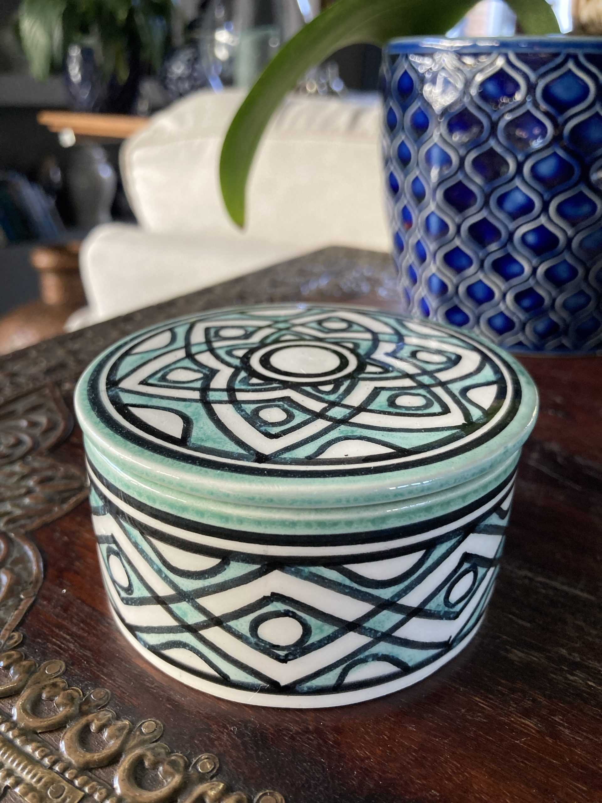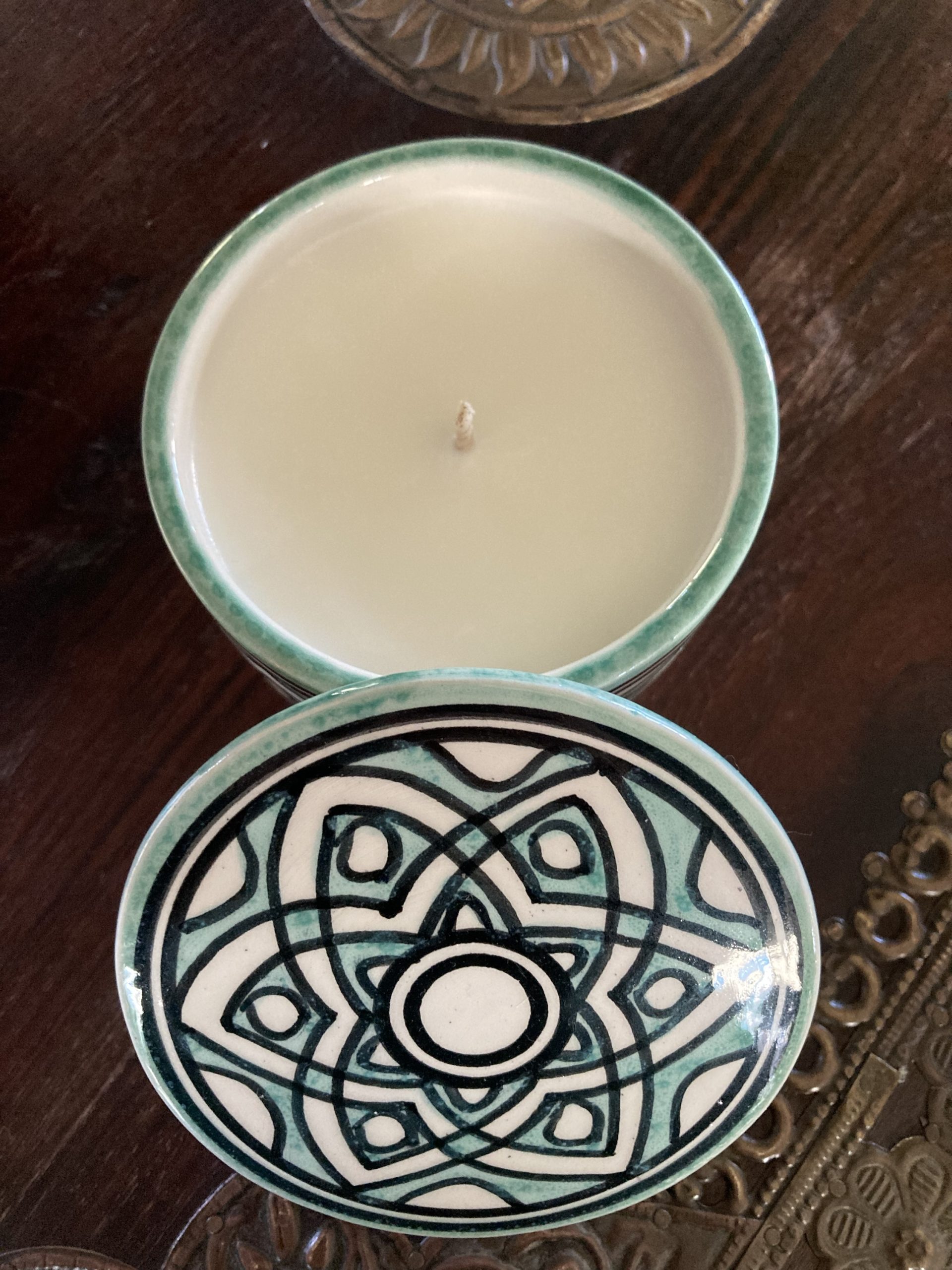 100gms pure soy wax hand poured into one of our new range of handmade ceramics from Morocco. This box is soft green and is 50mm high and 90mm wide.