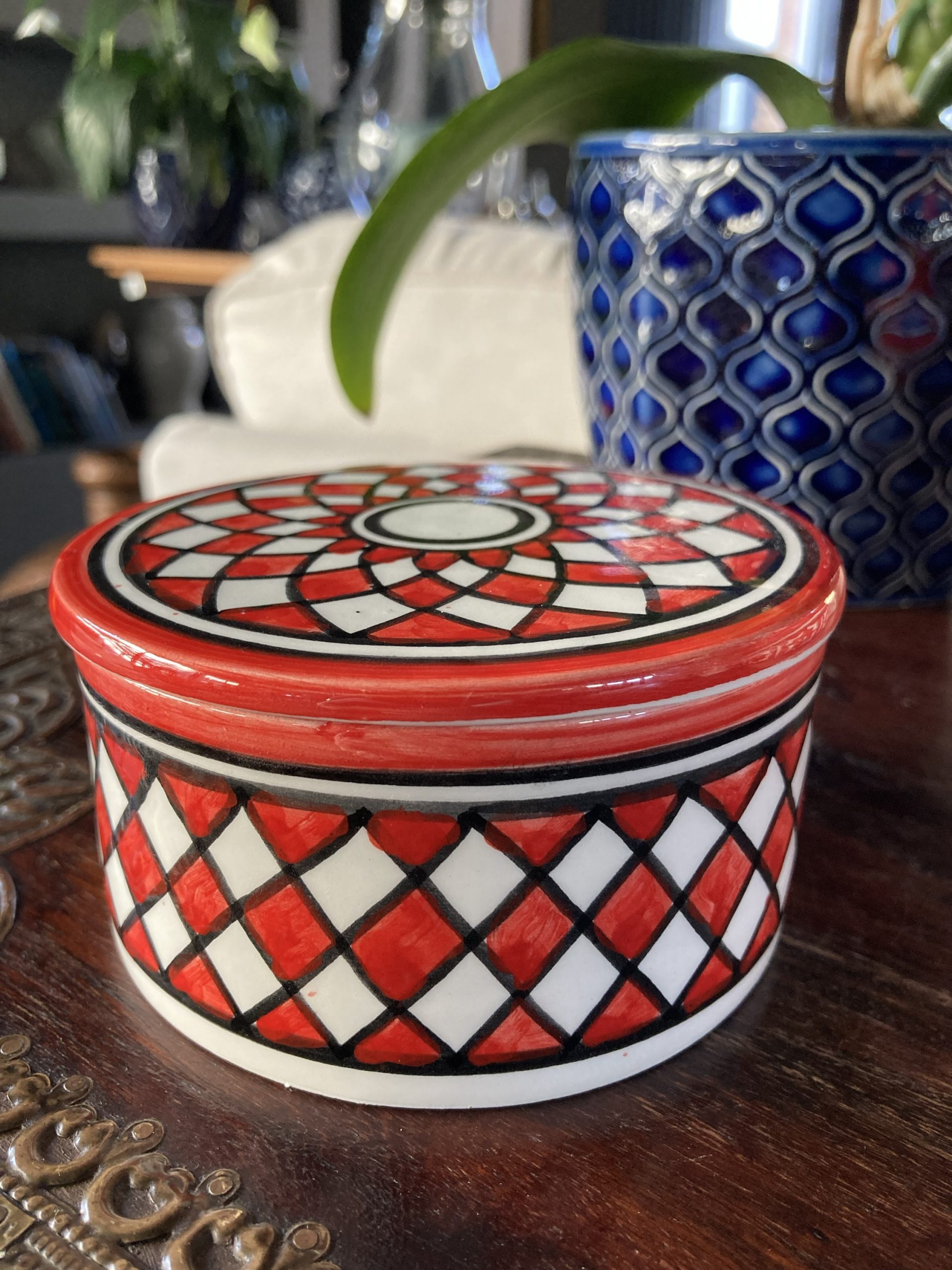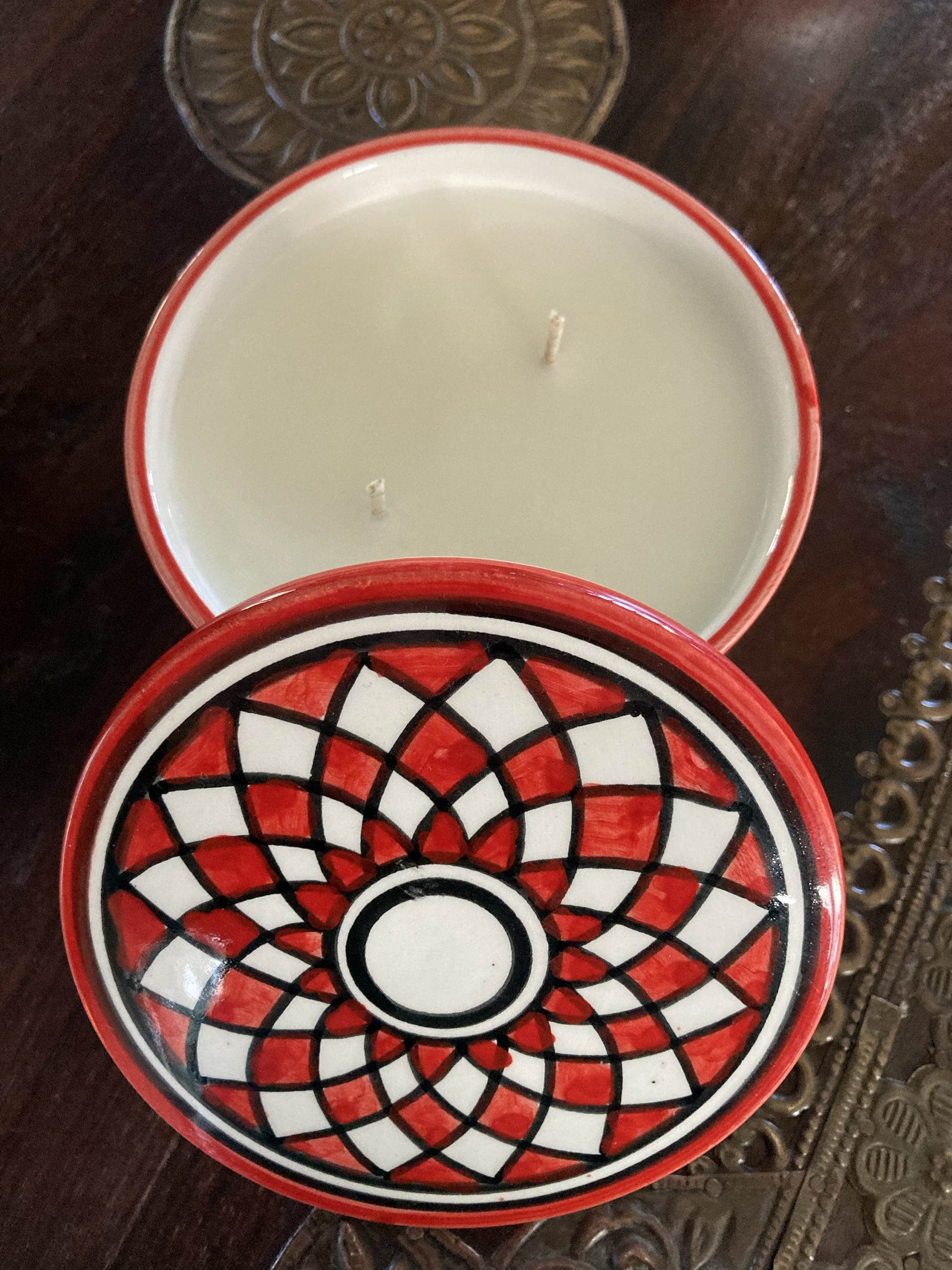 180gms pure soy wax hand poured into one of our new range of handmade ceramics from Morocco. This box is coral red and is 55mm high and 110mm wide.