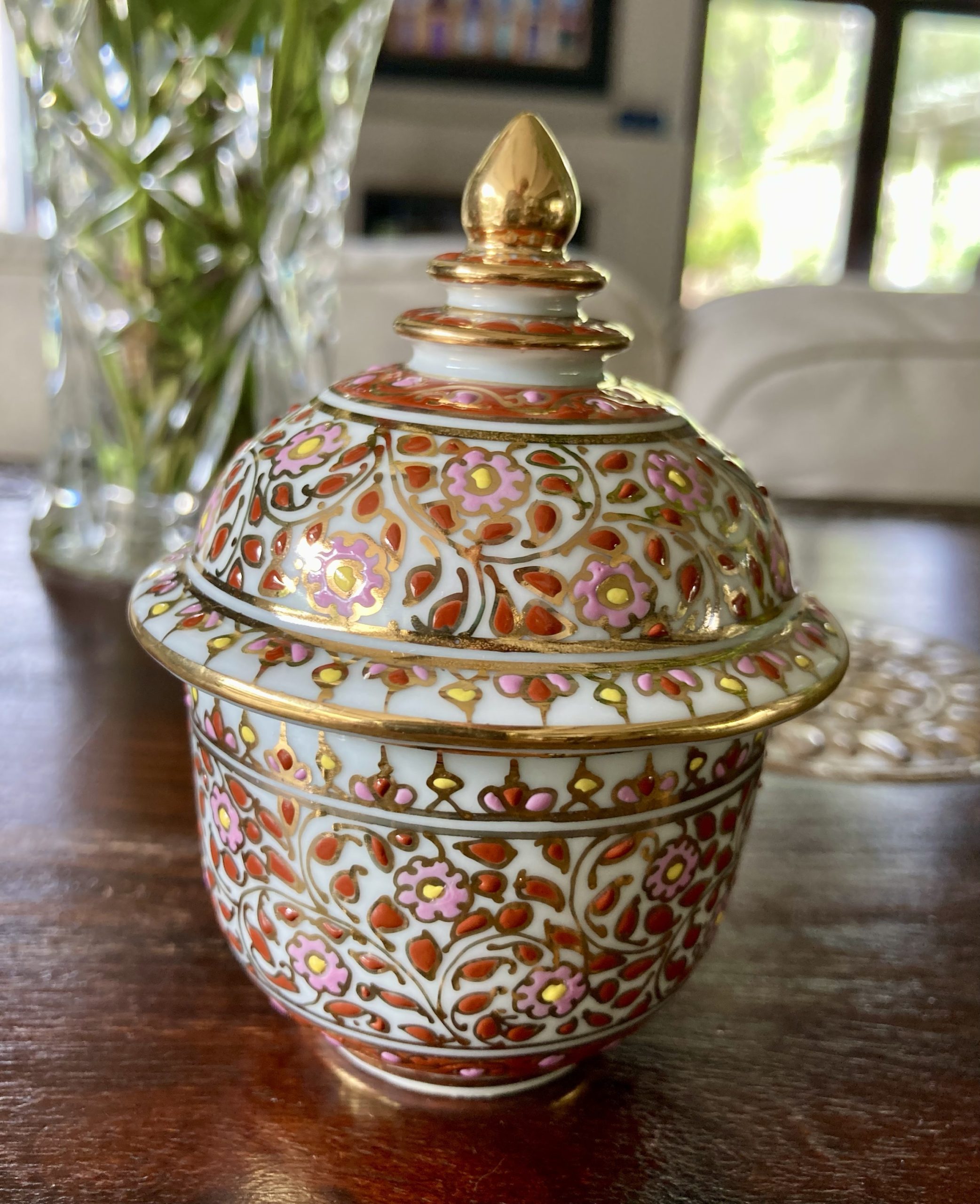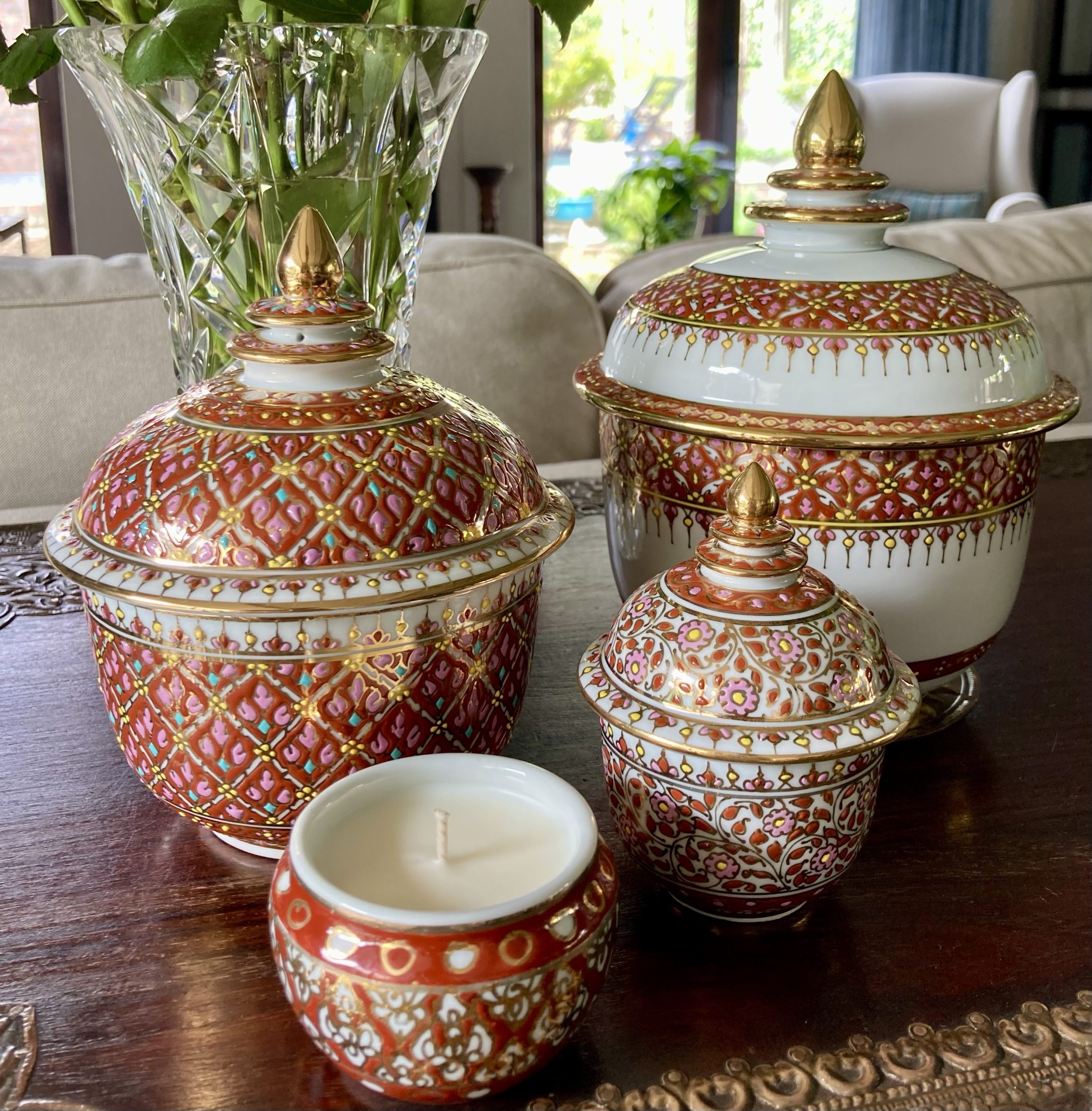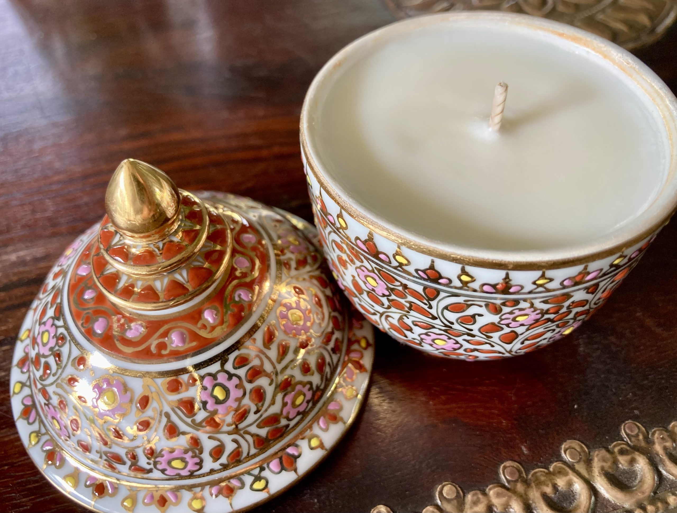 65gms pure soy wax hand poured into one of our exclusive range of handmade ceramics. This little Benjarong pot is white with rust and pink florals and gold accents and is 95mm high and 75mm wide.