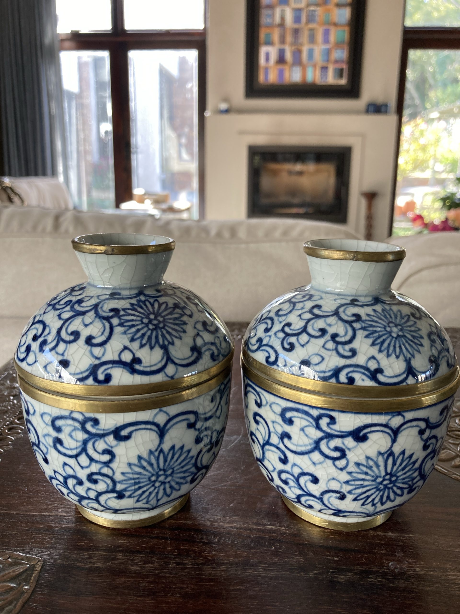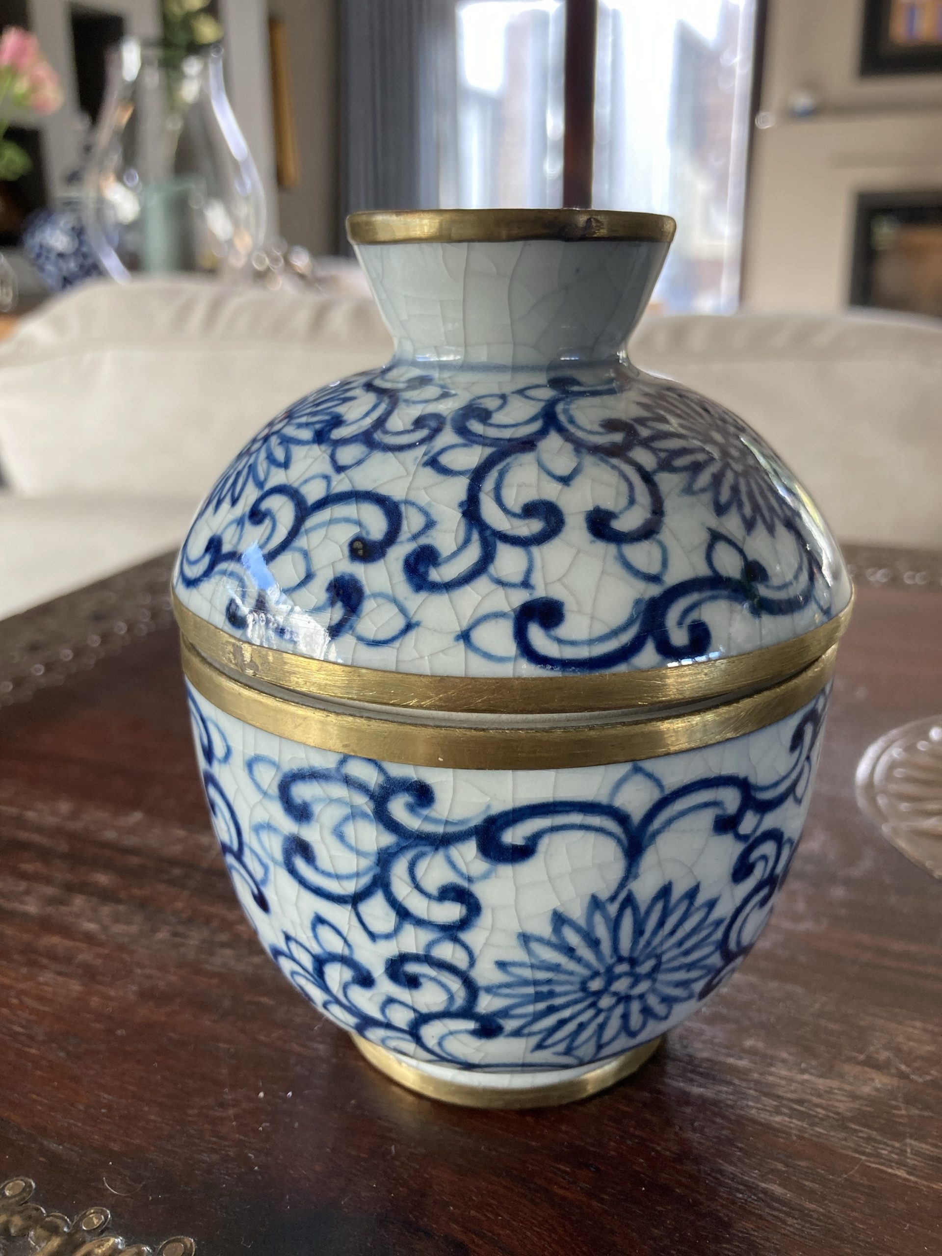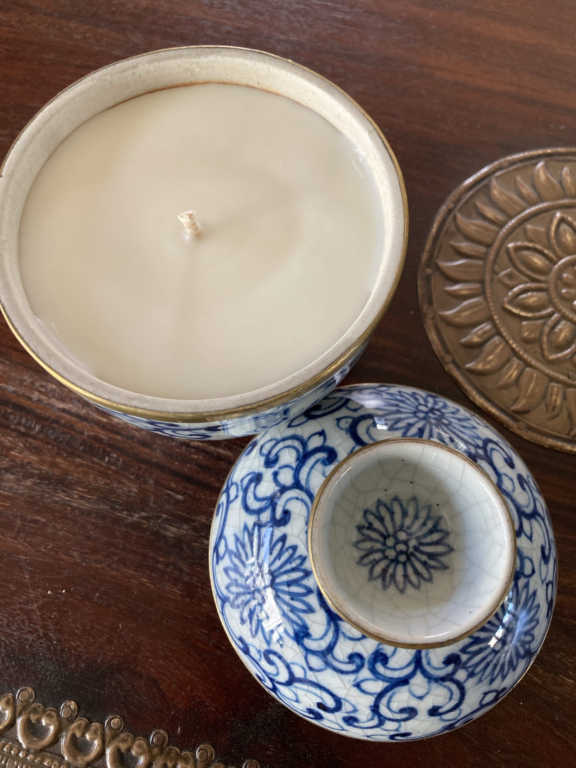 200gms pure soy wax hand poured into one of our exclusive range of handmade ceramics. This jar is blue and white with a metal trim and is 115mm high and 90mm wide.