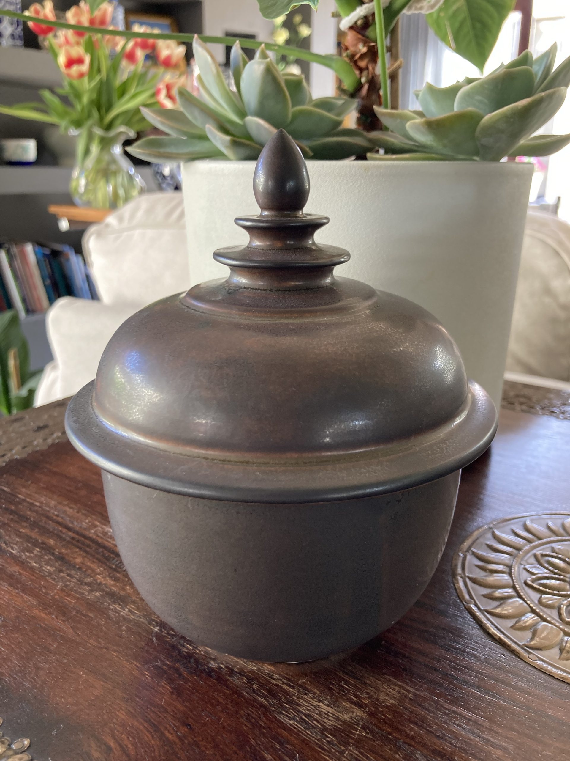 350gms pure soy wax hand poured into one of our exclusive range of handmade ceramics. This stunning pot is matte brown and is 150mm high and 125mm wide.