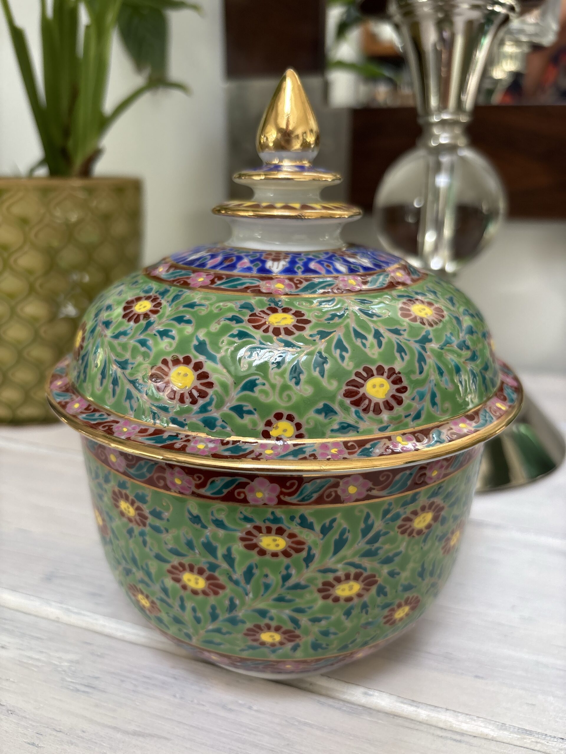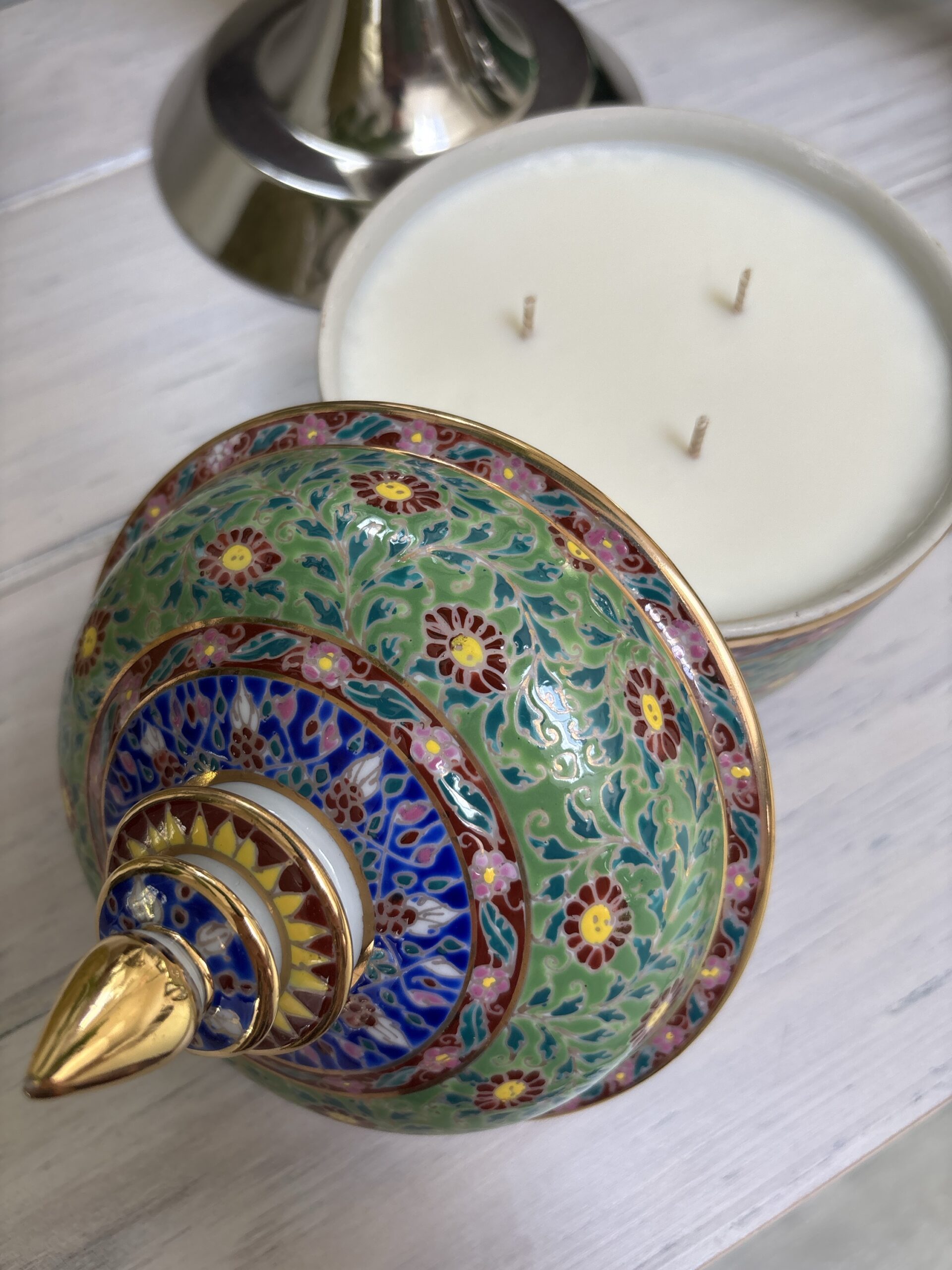 630gms pure soy wax hand poured into one of our exclusive range of handmade ceramics. This Benjarong pot is leaf green with yellow and gold accents and is 180mm high and 145mm wide.