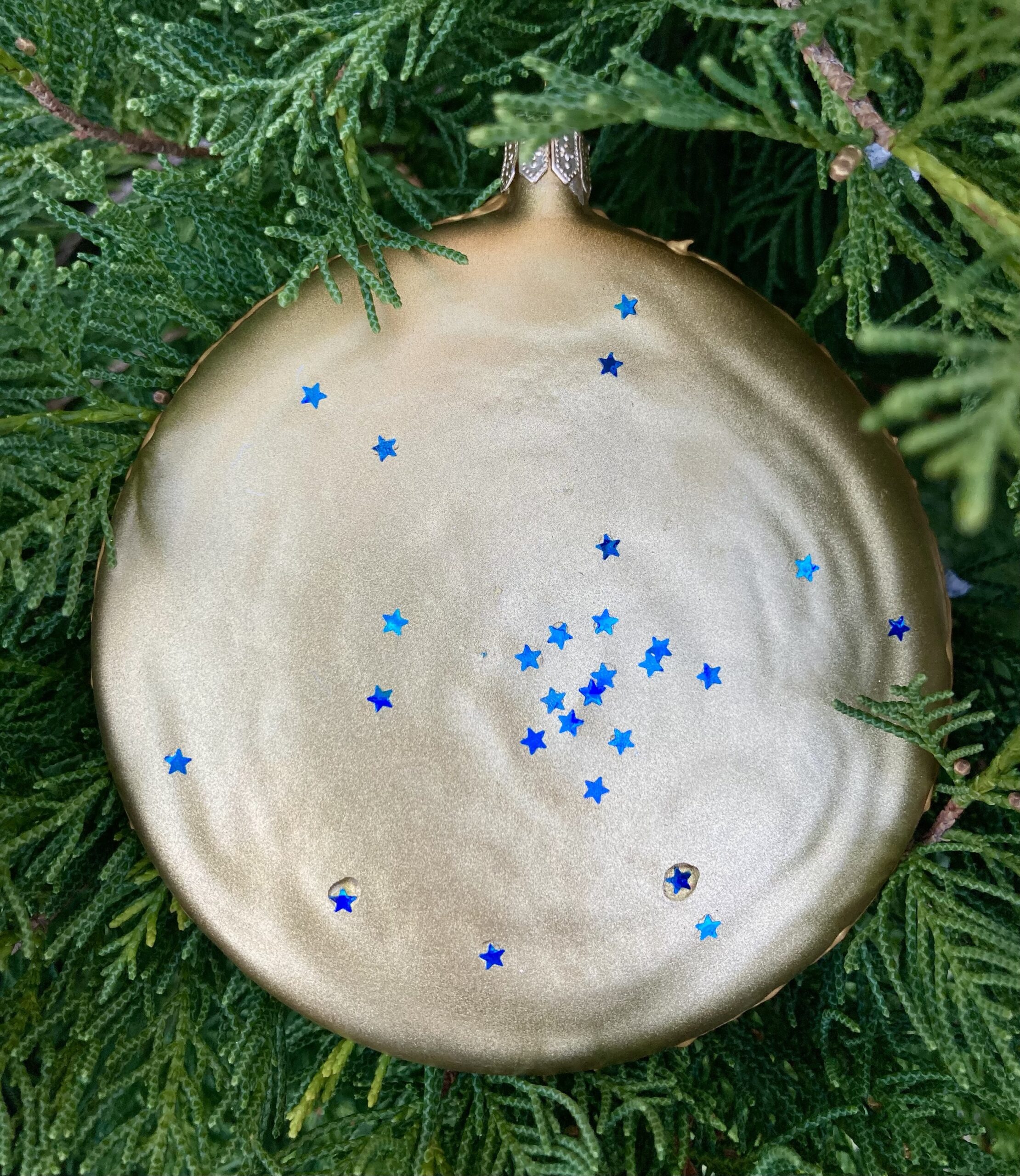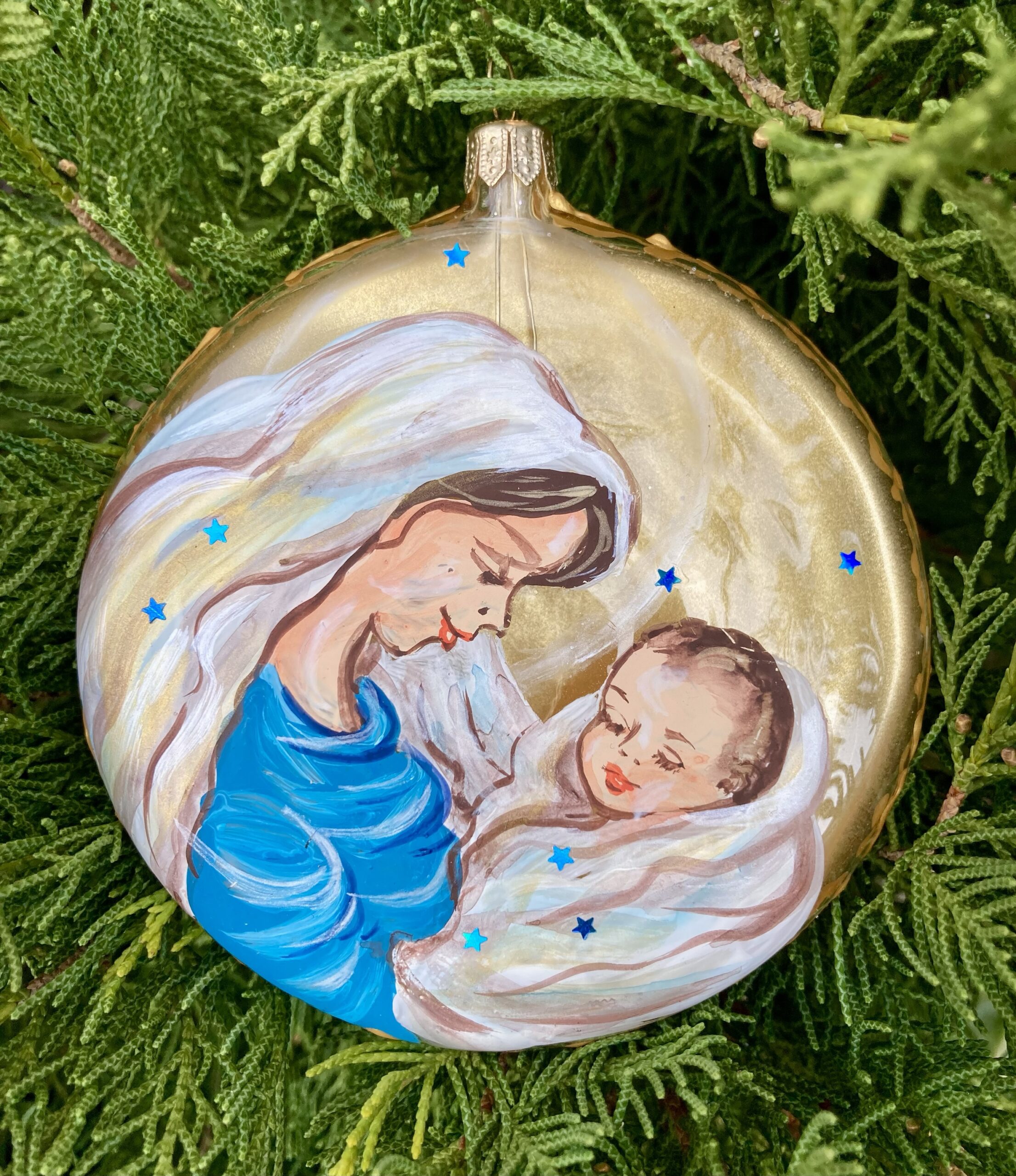 - Moulded glass ornament in the shape of a medallion with a hand painting of Mother Mary holding Baby Jesus