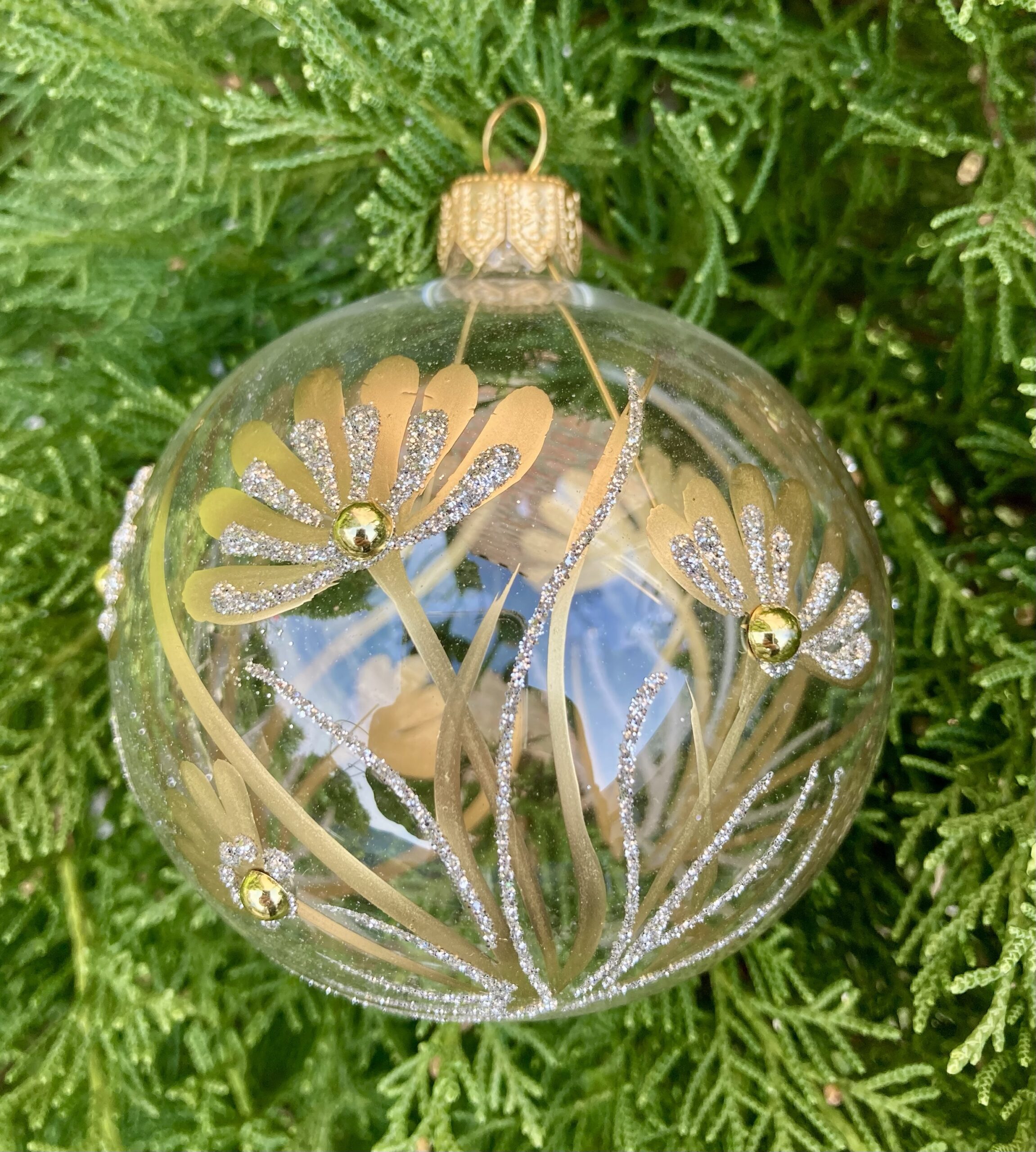 - Transparent mouth blown glass ornament decorated with gold florals and silver glitter