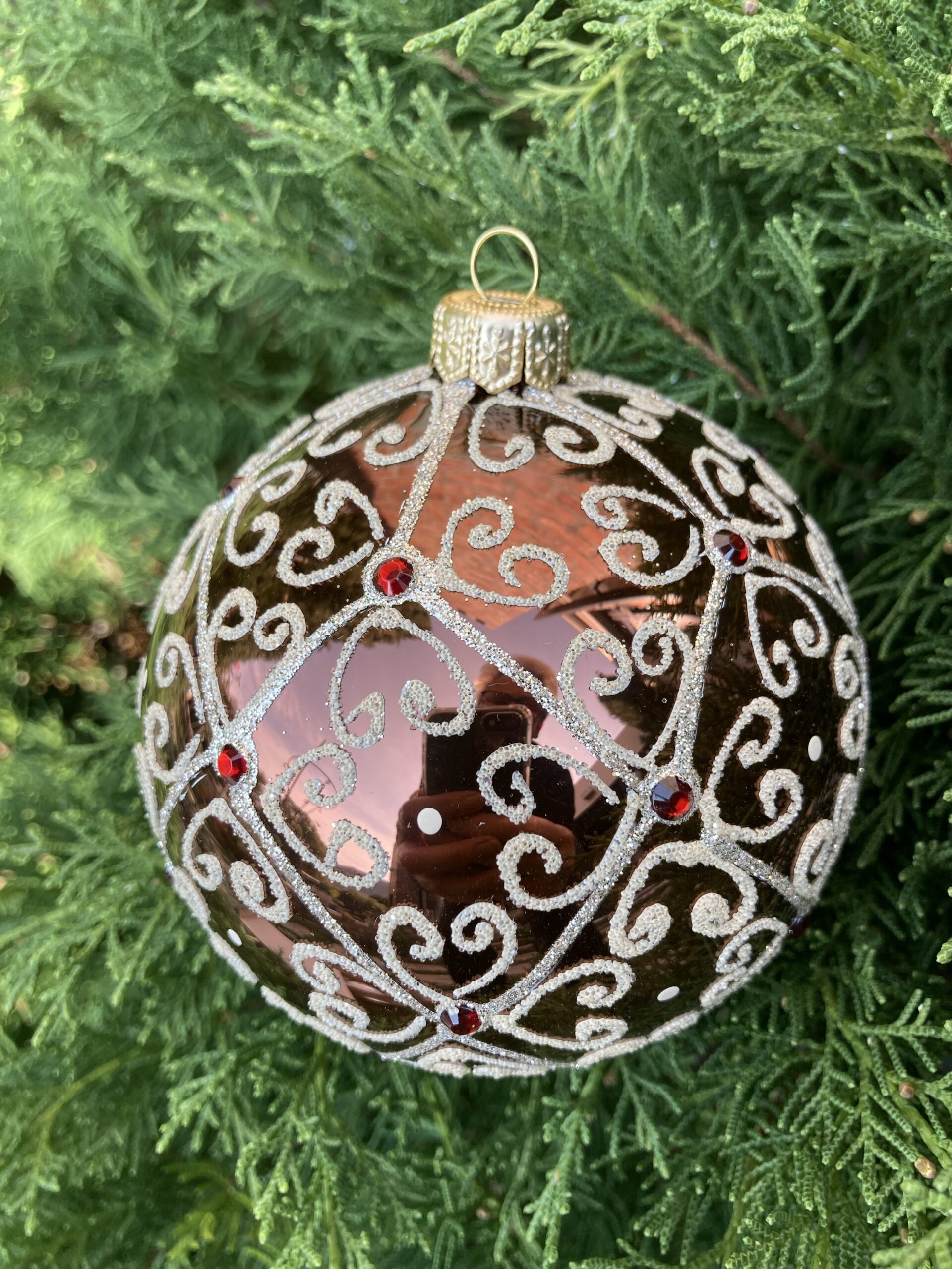 - Bronze mouth blown glass ornament embellished with cream glitter and red crystals