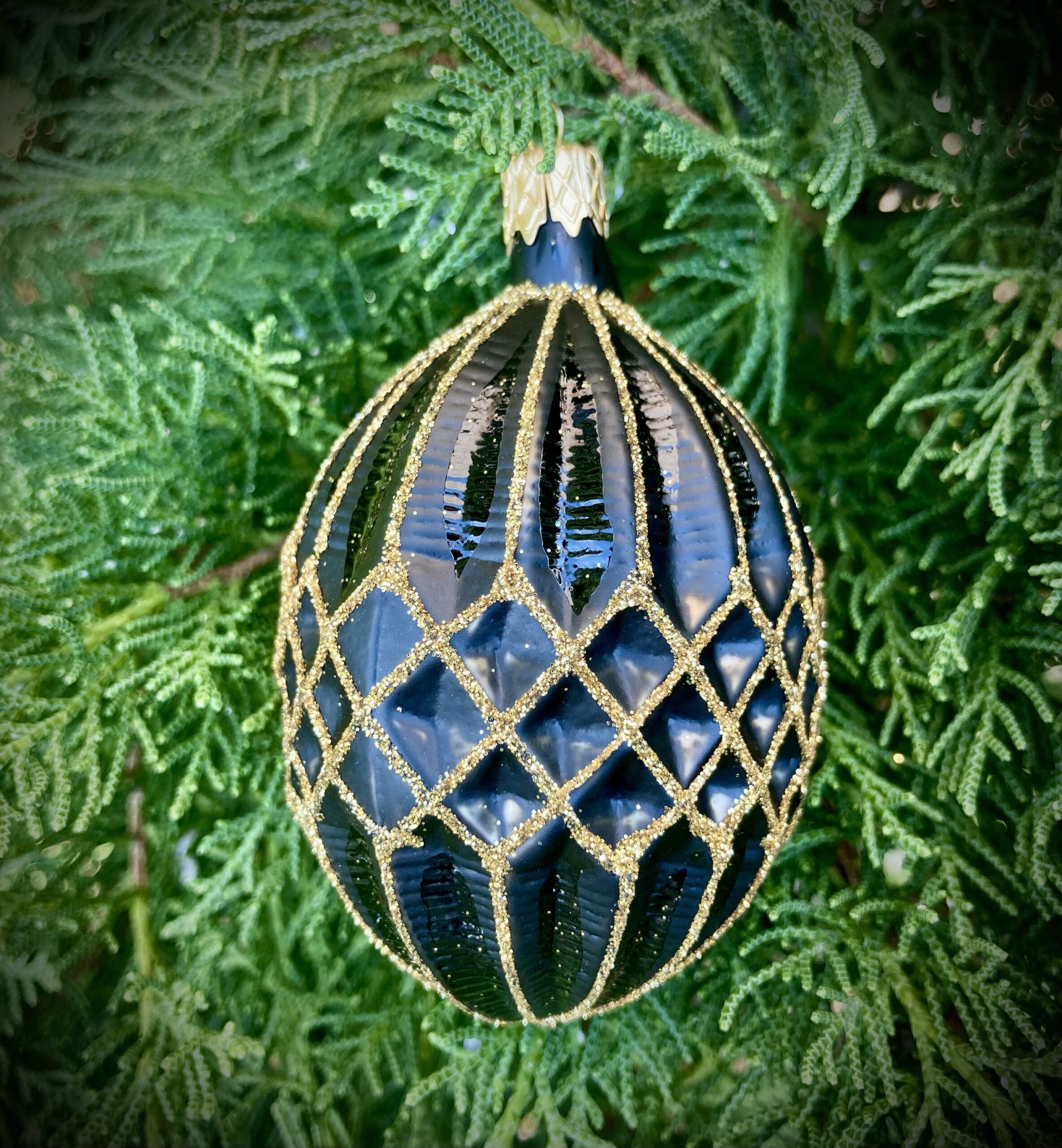 - Matte black moulded glass ornament decorated with gold glitter