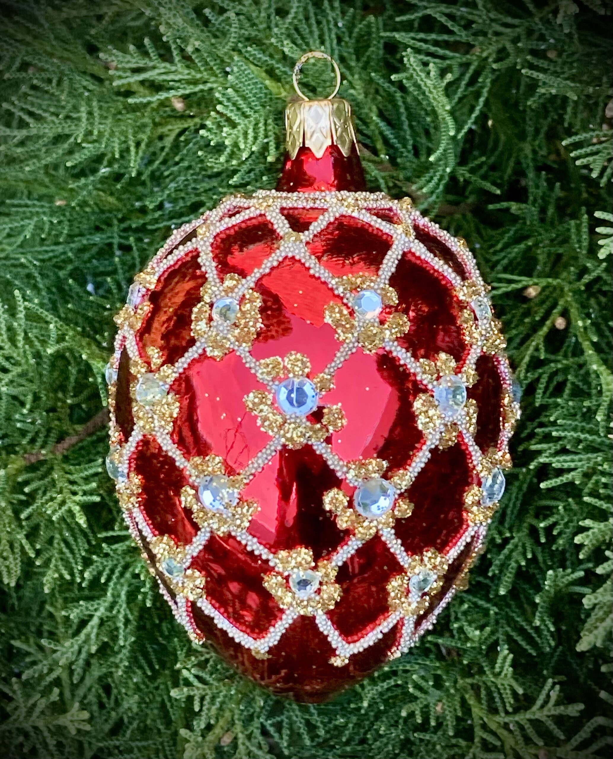 - Magnificent festive red mouth blown glass ornament lavishly decorated with gold glitter and crystals
