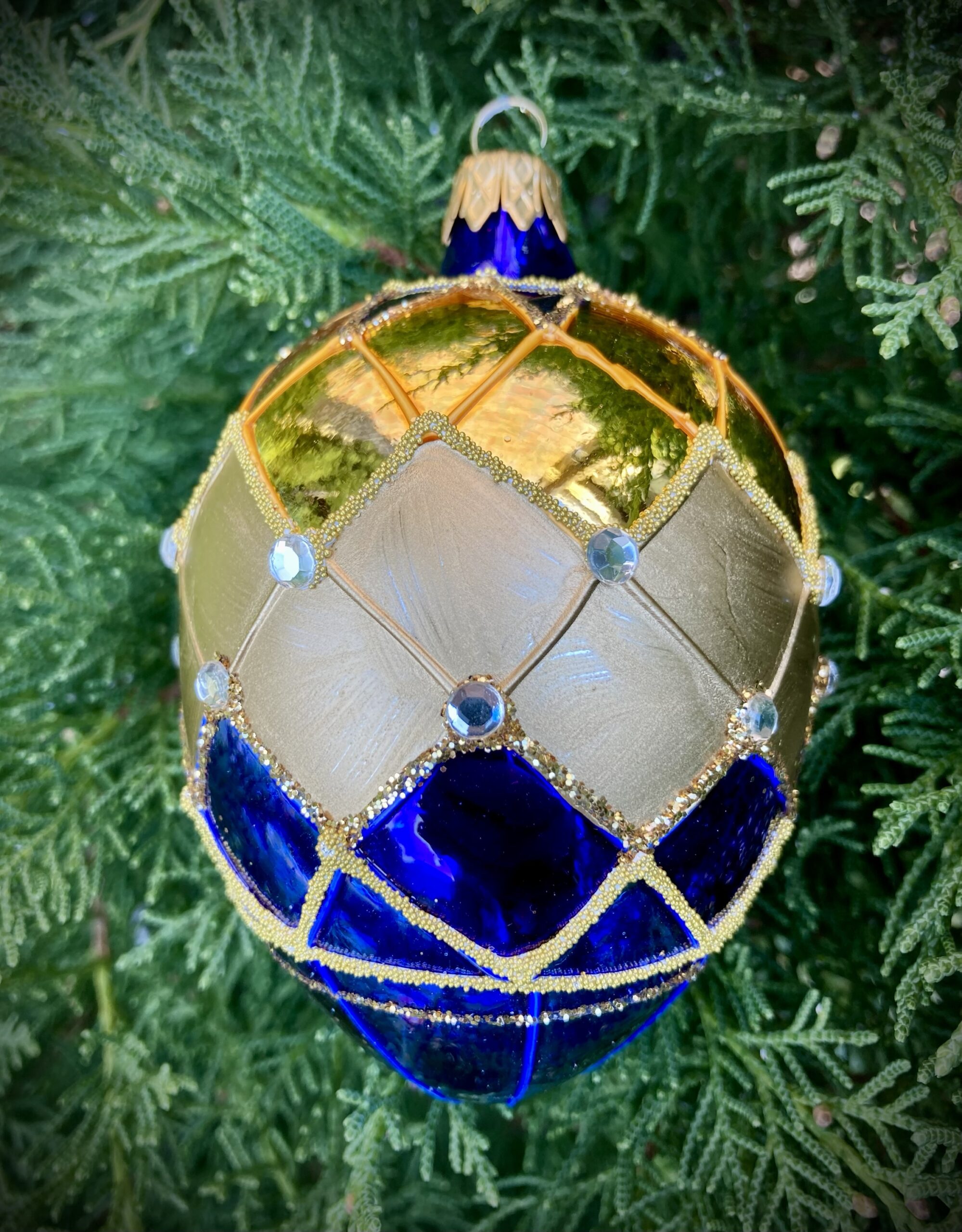 - Magnificent royal blue and gold mouth blown glass ornament decorated with crystals