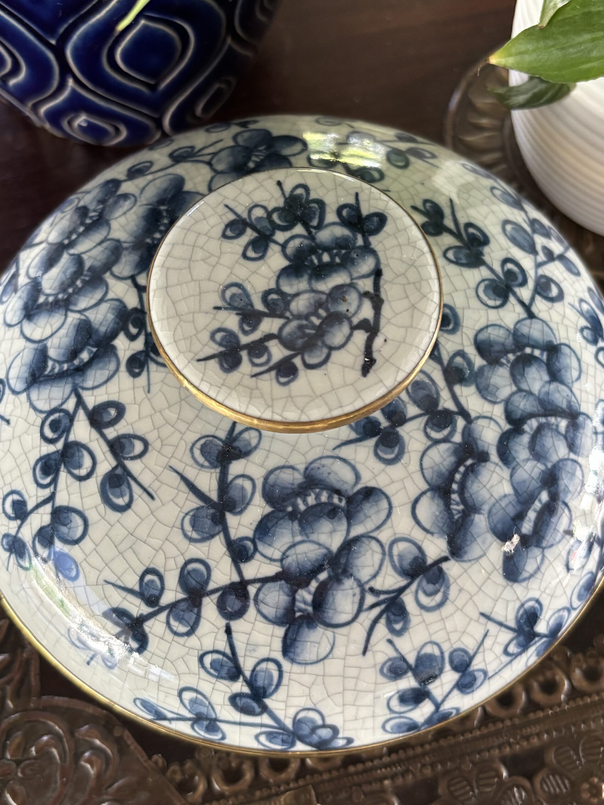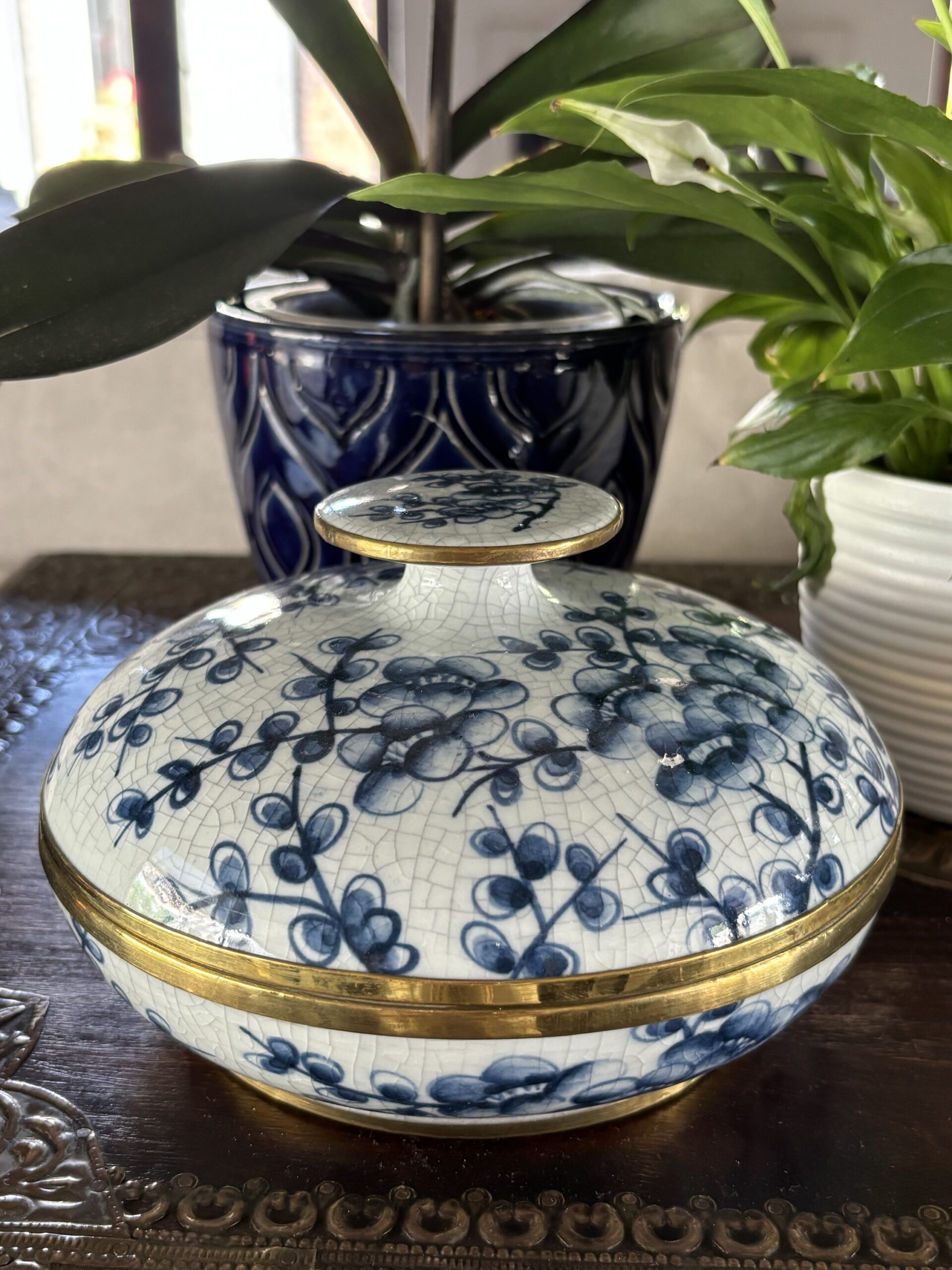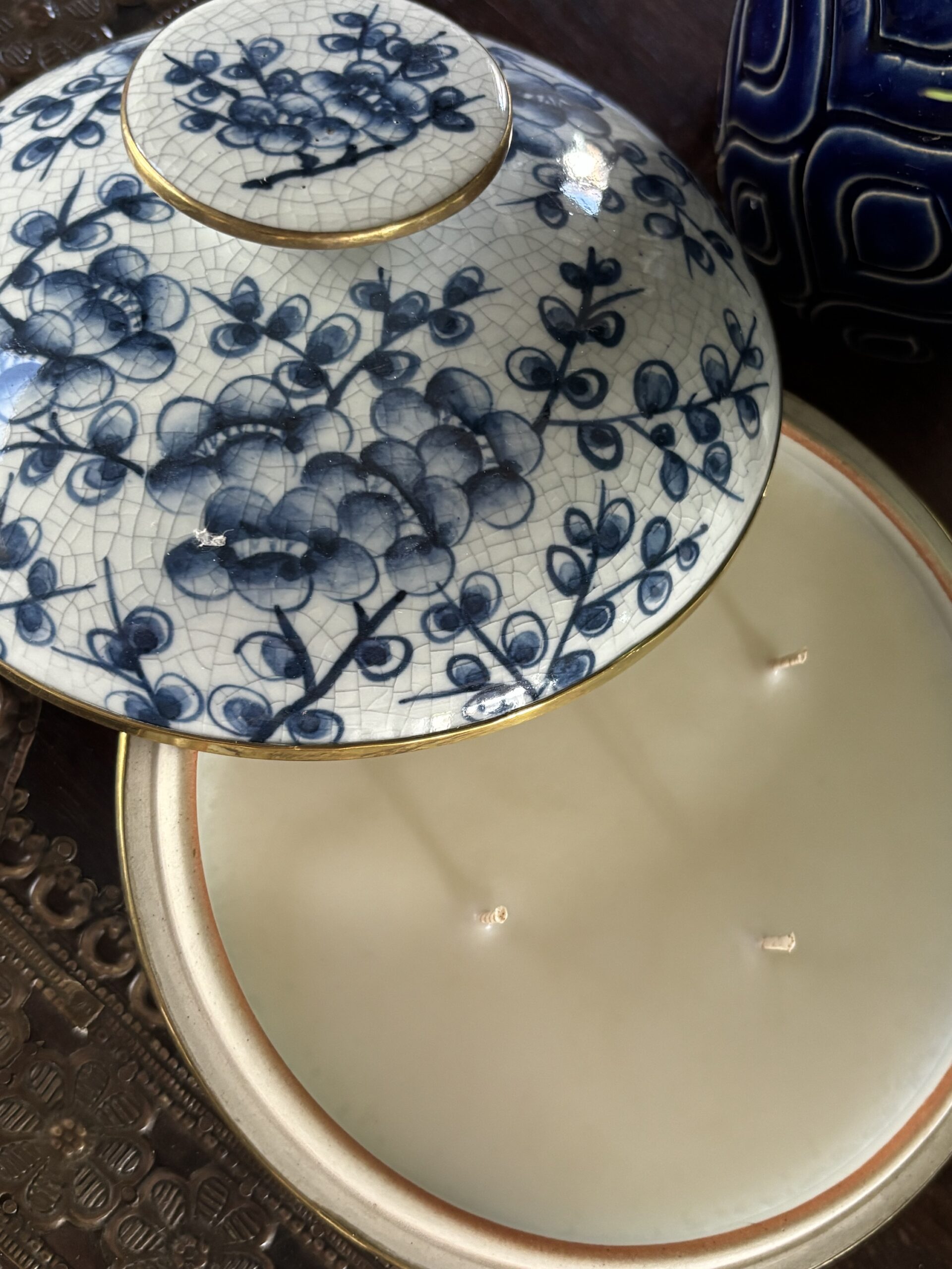 400gms pure soy wax hand poured into one of our exclusive range of handmade ceramics. This stunning round bowl has a blue and white design with metal trim and is 100mm high and 165mm wide.