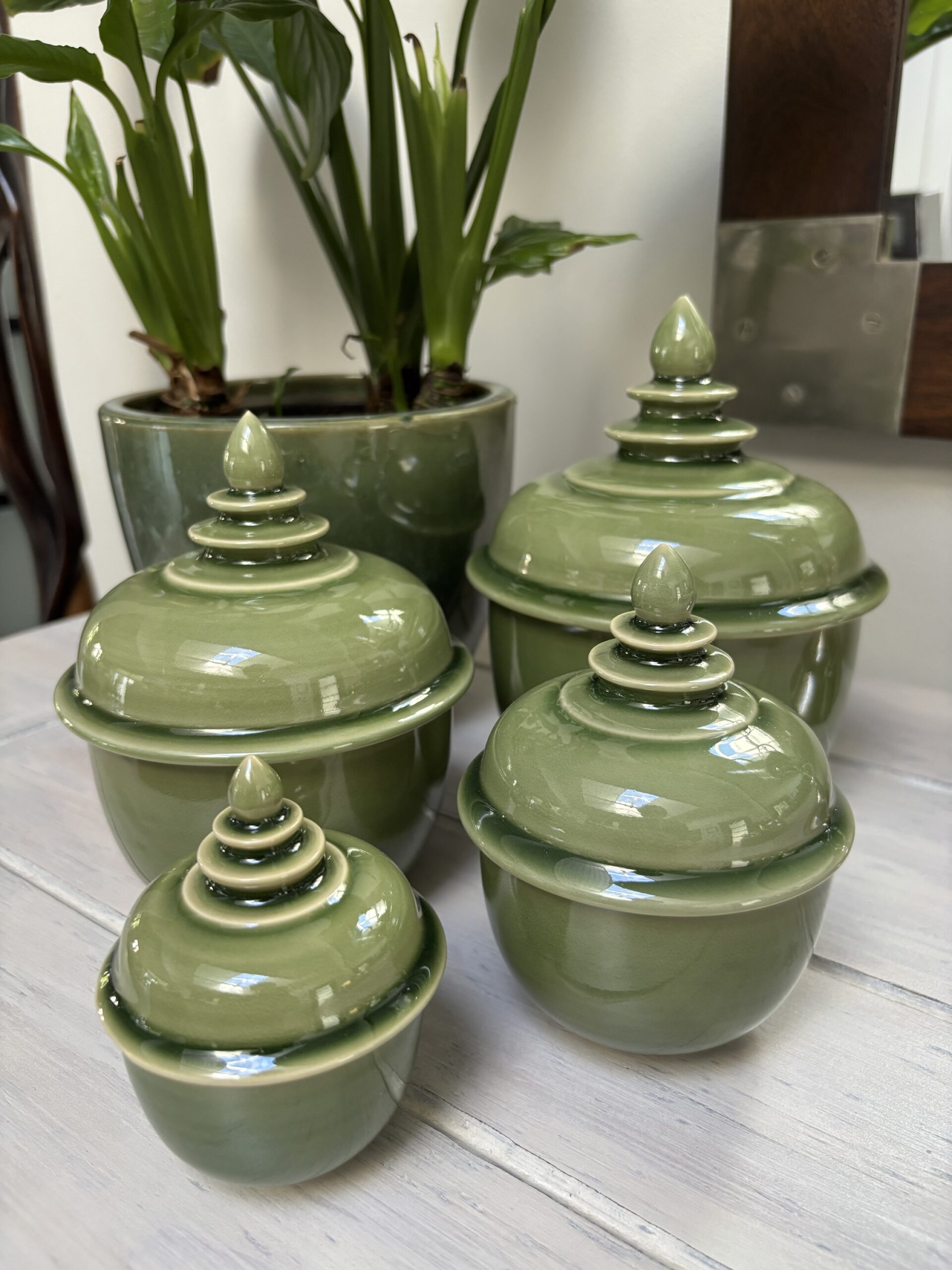 600gms pure soy wax hand poured into one of our exclusive range of handmade ceramics. This stunning pot is glossy celadon green and is 170mm high and 145mm wide.