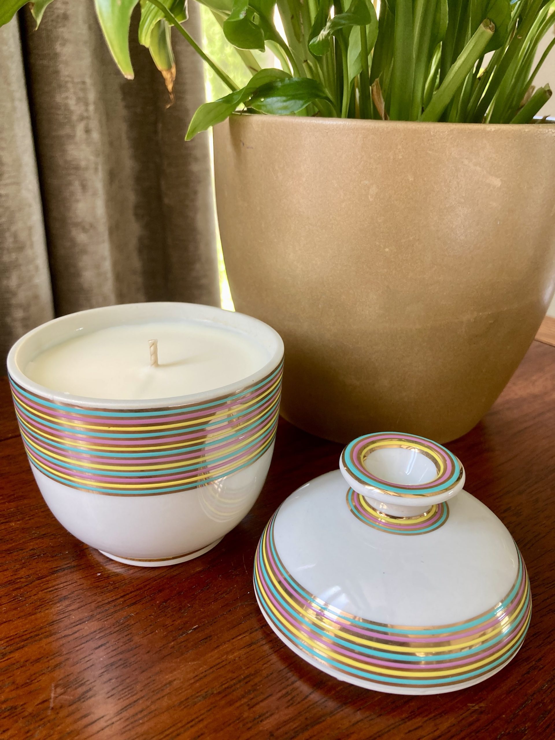 195gms pure soy wax hand poured into one of our exclusive range of handmade ceramics. This stunning Benjarong jar has an aqua, pink and yellow striped design with gold accents and is 110mm high and 85mm wide.