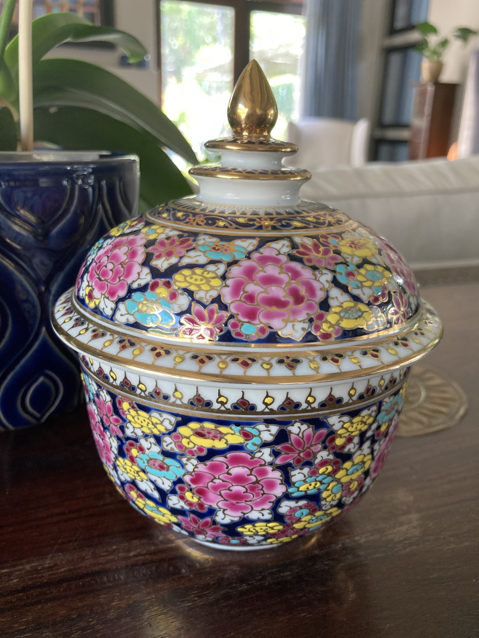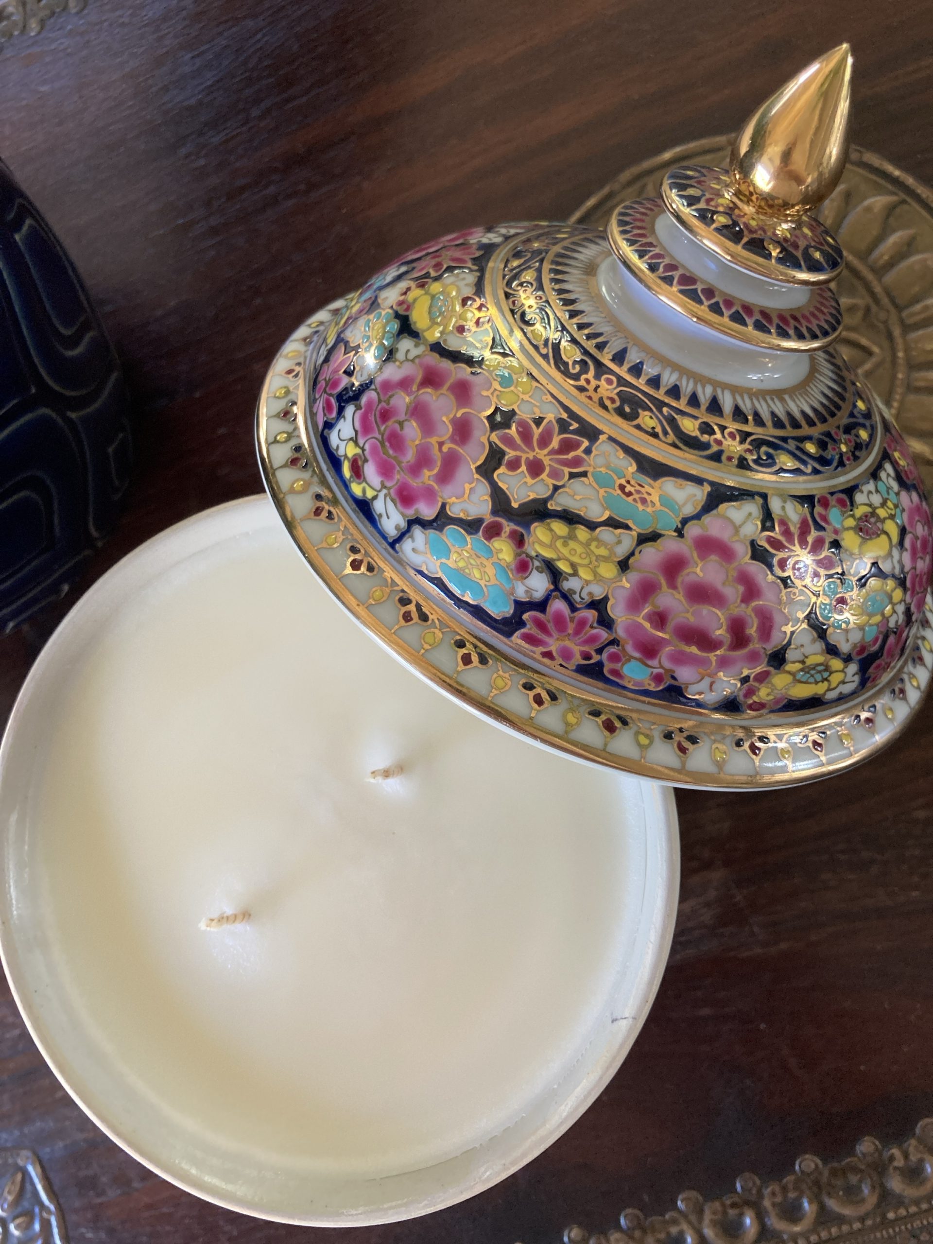 360gms pure soy wax hand poured into one of our exclusive range of handmade ceramics. This Benjarong pot is dark blue with pink, aqua and yellow florals and gold accents and is 155mm high and 125mm wide.