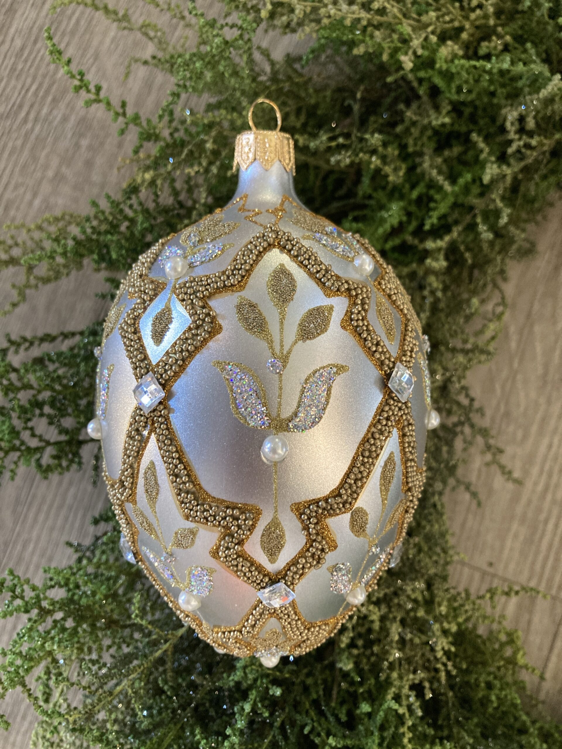 • Moulded glass egg shaped ornament, inspired by P C Faberge