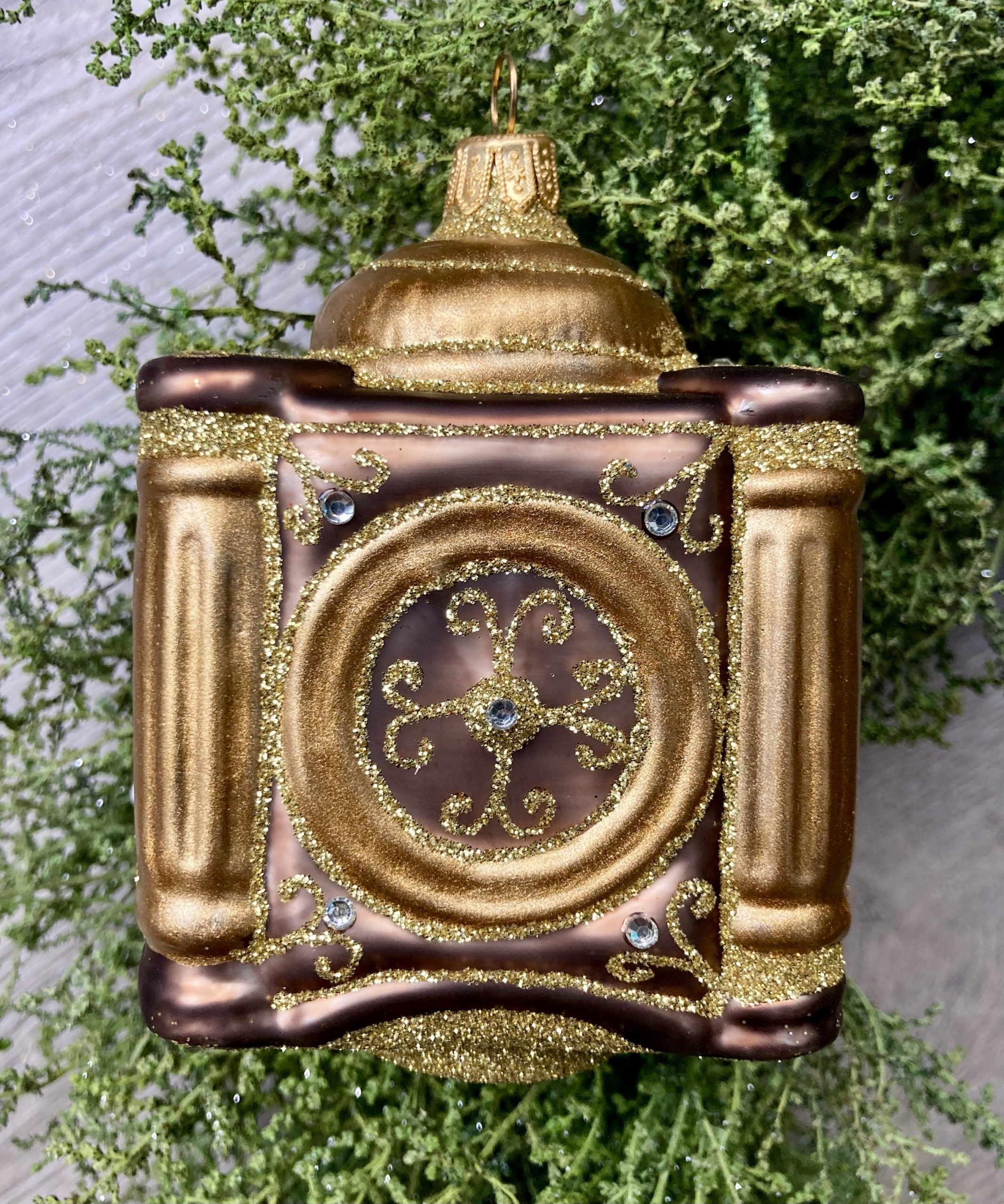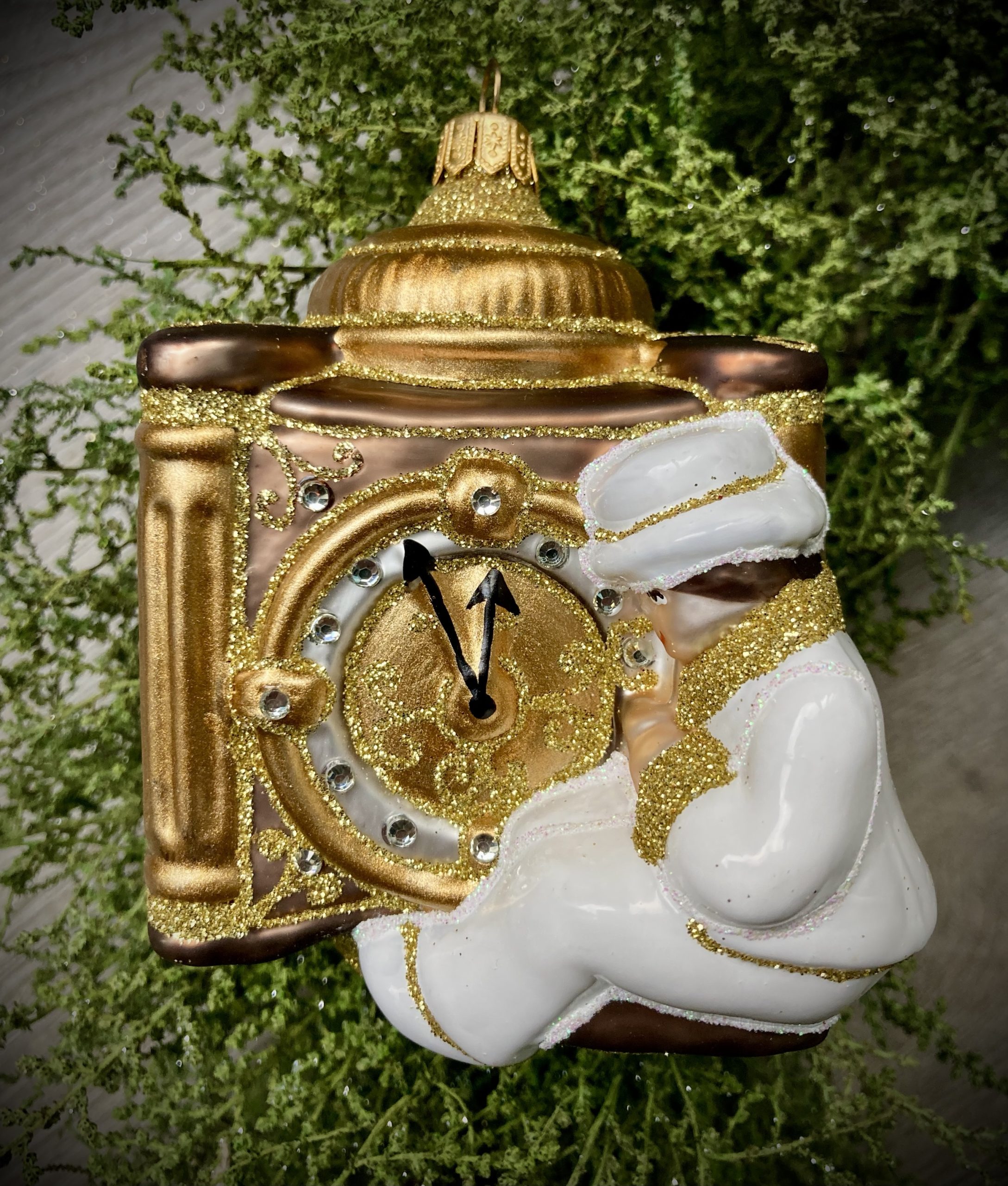 - Moulded glass ornament in the shape of a clock with a small boy waiting for midnight