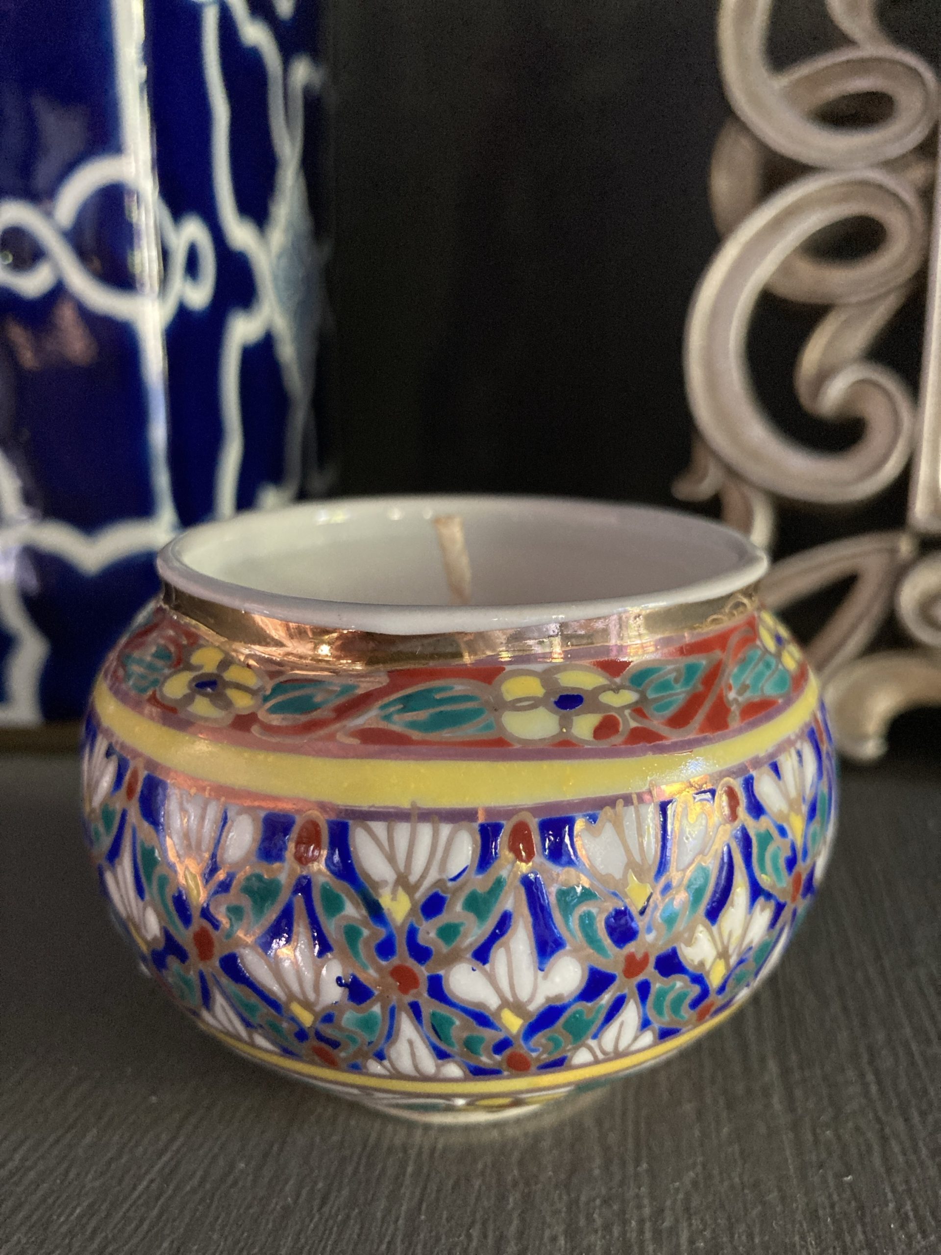 80gms pure soy wax hand poured into one of our exclusive range of handmade ceramics. This gorgeous small trinket bowl is in the Benjarong style.