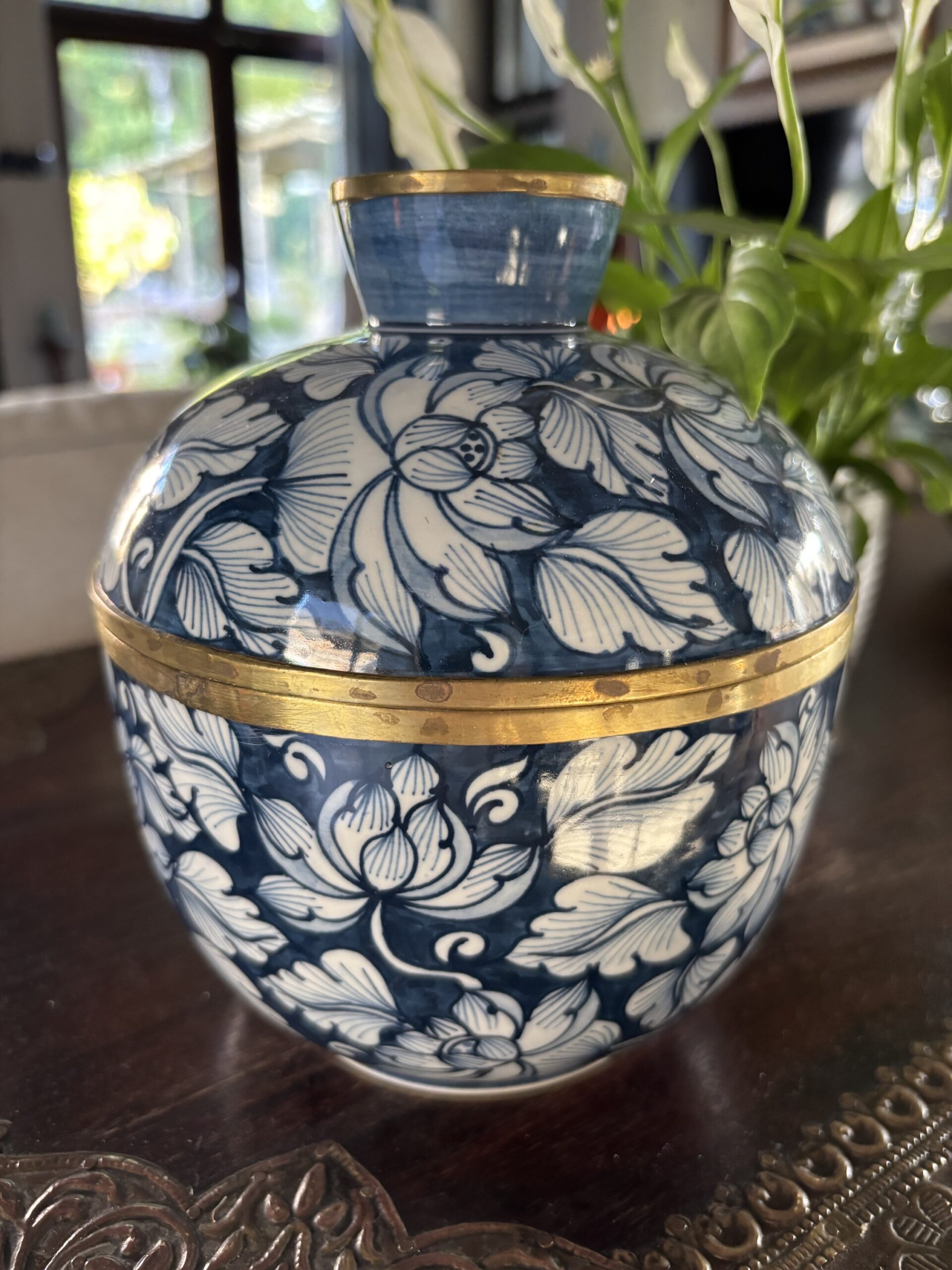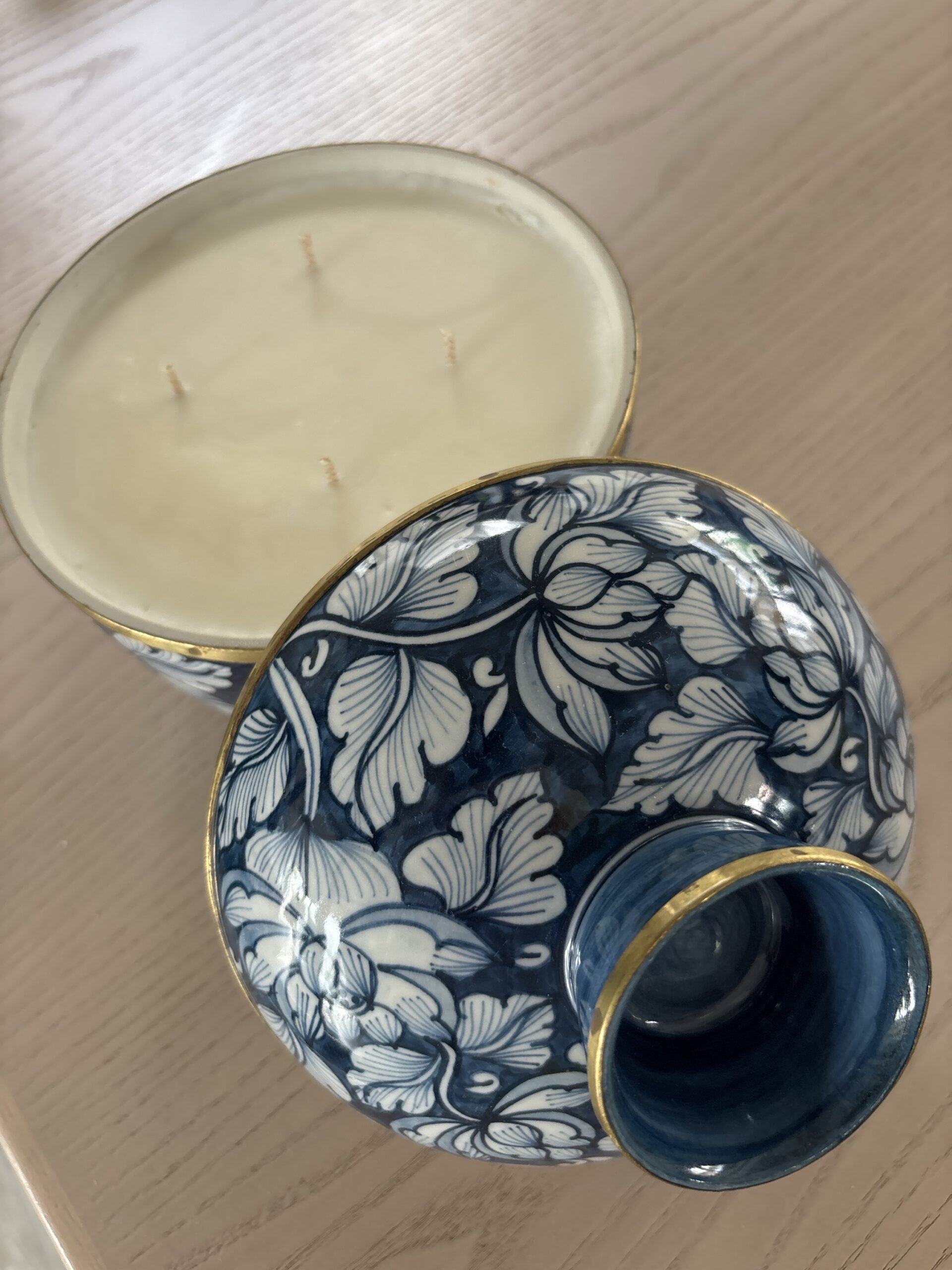 960g pure soy wax hand poured into one of our exclusive range of handmade ceramics. This jar has a blue and white design with a metal trim and is 170mm high and 155mm wide.