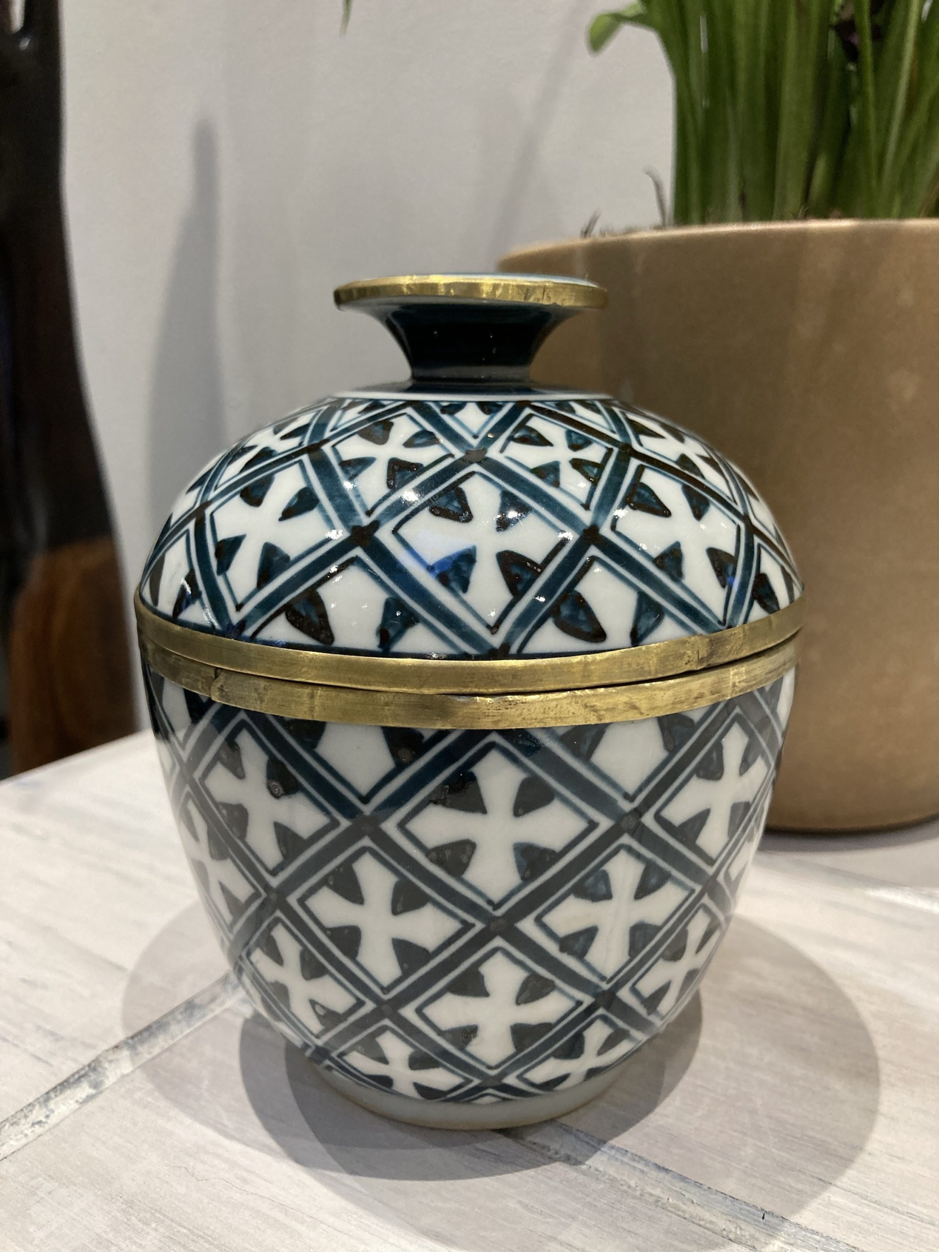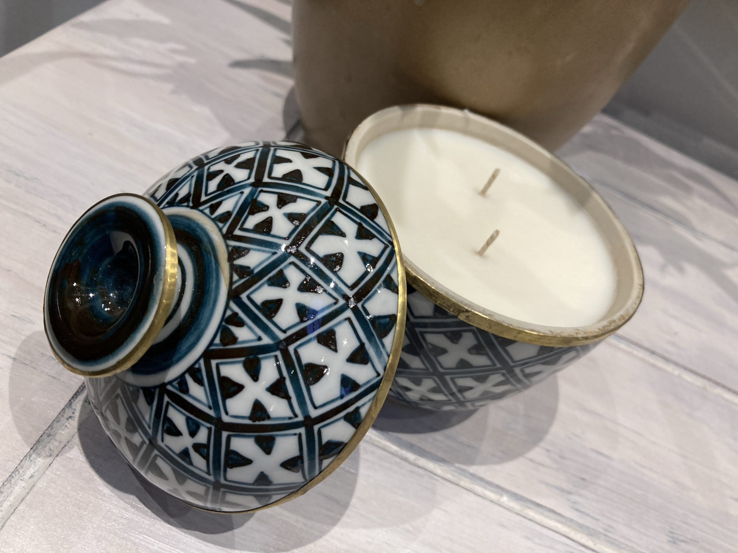 330gms pure soy wax hand poured into one of our exclusive range of handmade ceramics. This jar is dark charcoal green and white with a metal trim and is 125mm high and 105mm wide.