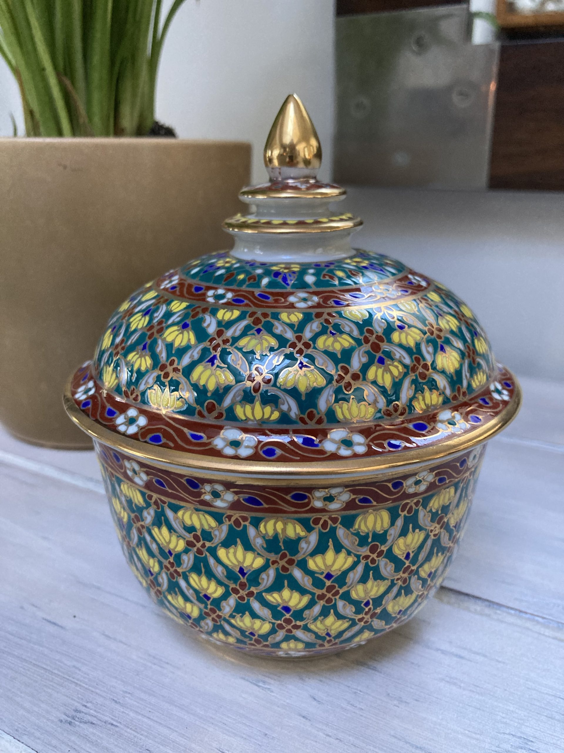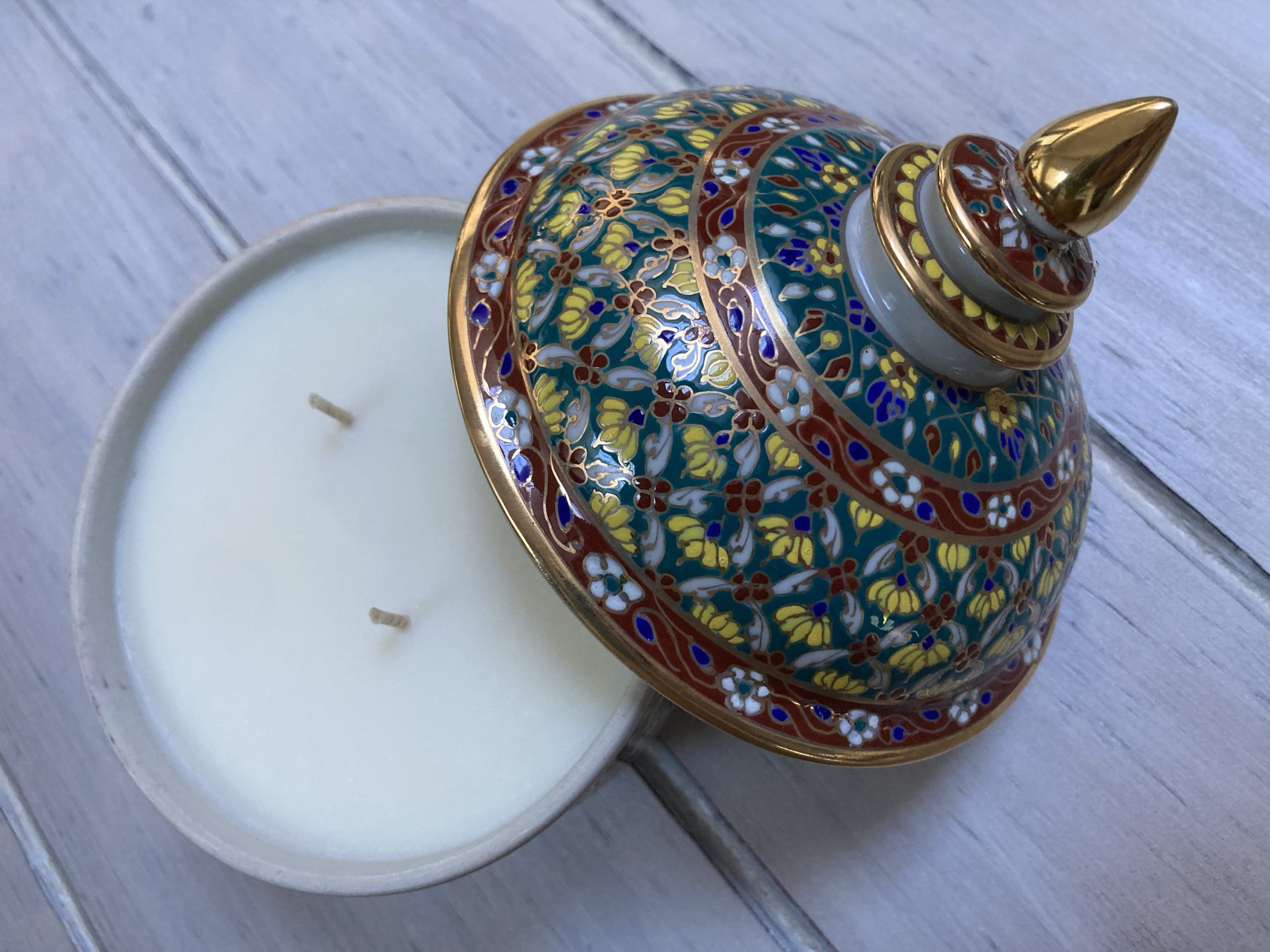 360gms pure soy wax hand poured into one of our exclusive range of handmade ceramics. This Benjarong pot is dark green with yellow, rust and gold accents and is 155mm high and 125mm wide.