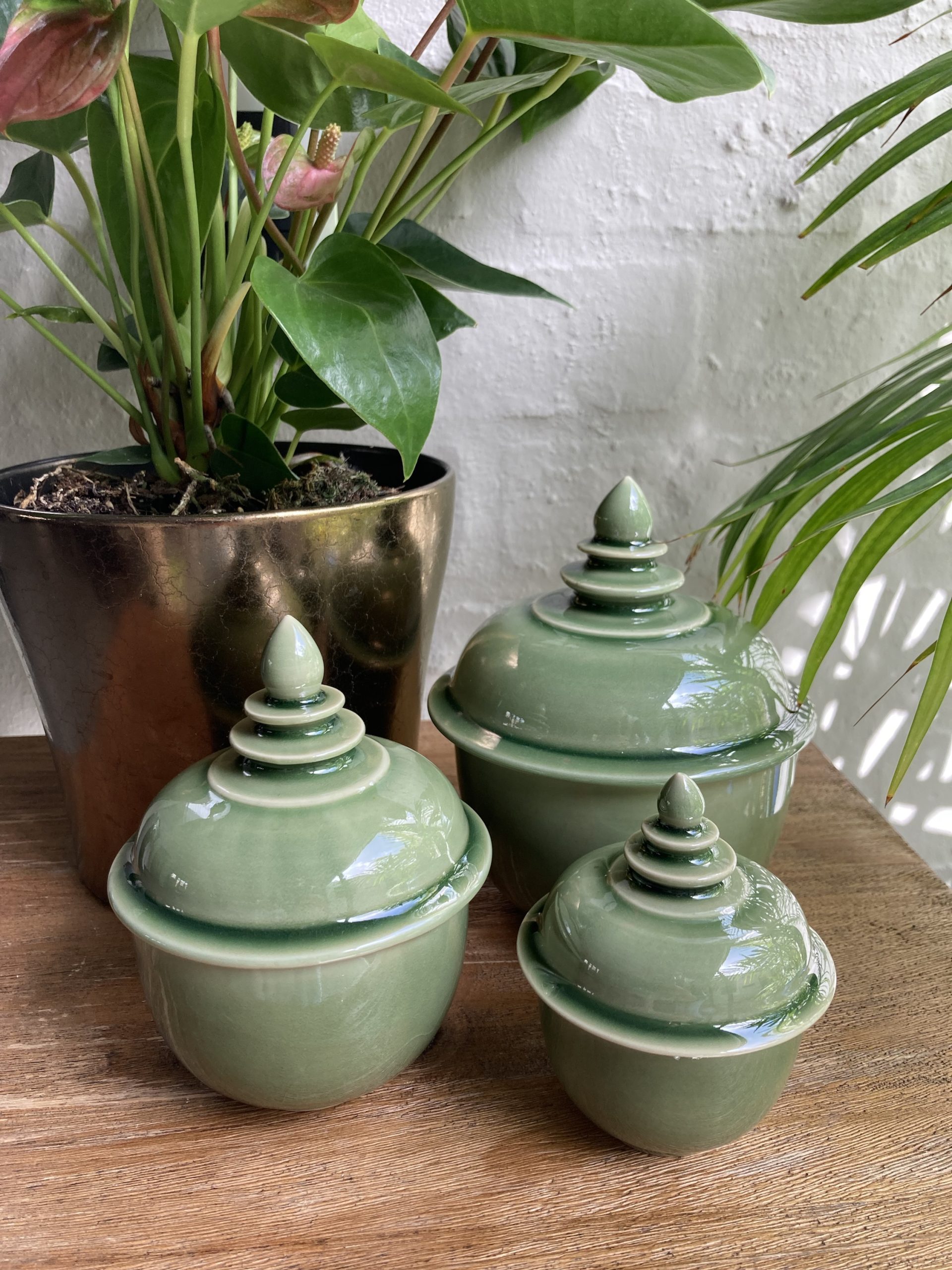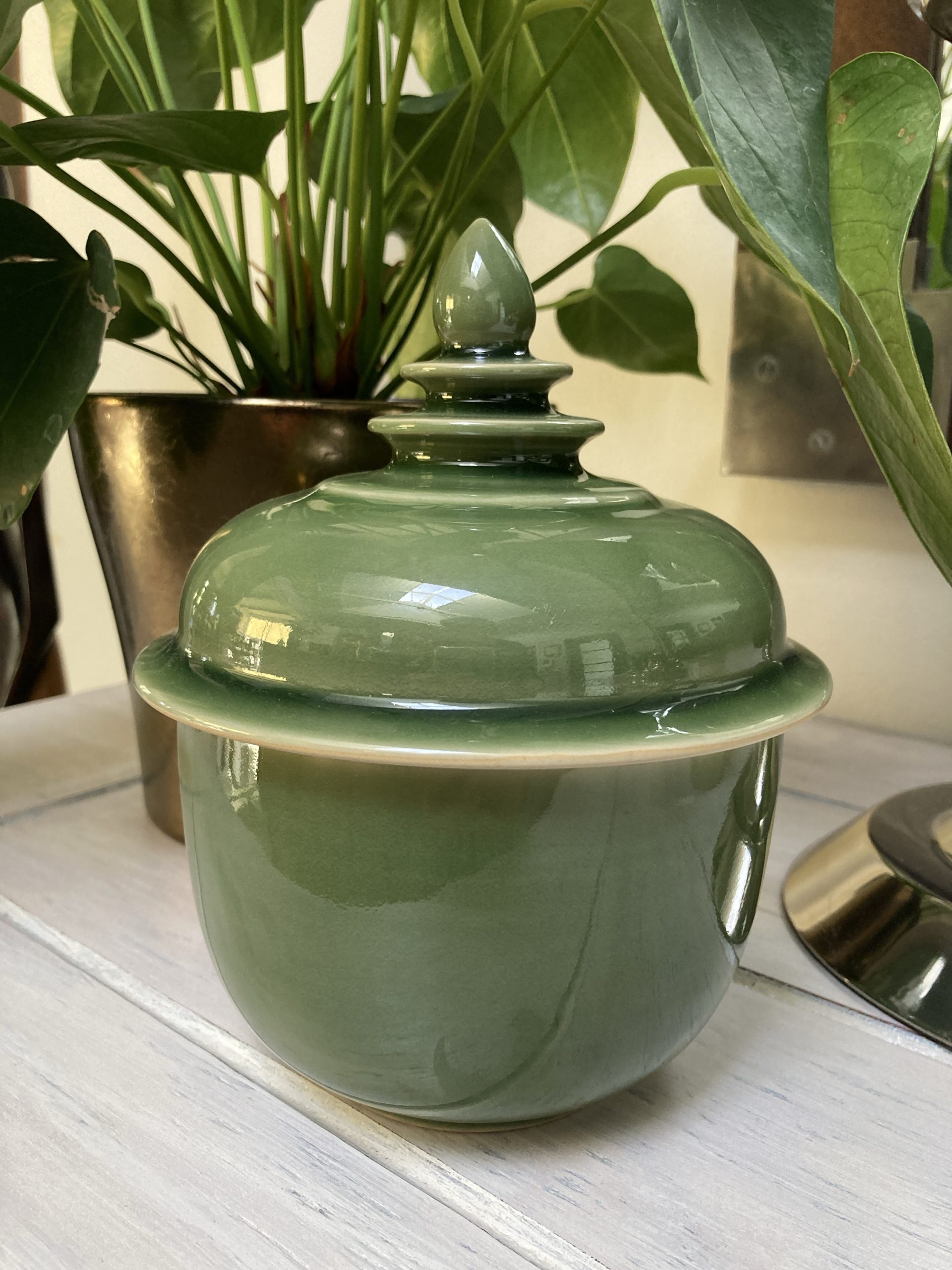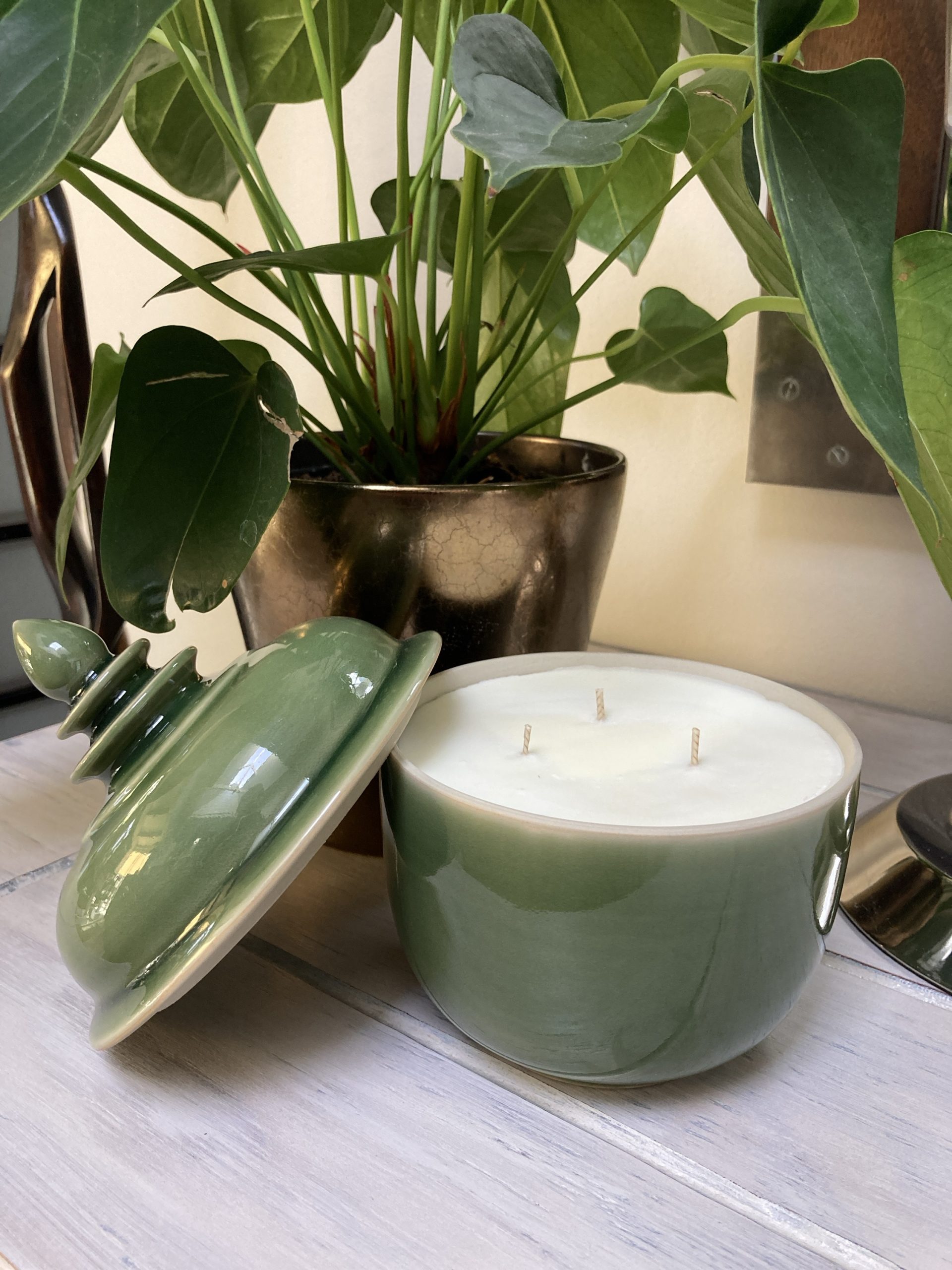 600gms pure soy wax hand poured into one of our exclusive range of handmade ceramics. This stunning pot is glossy celadon green and is 170mm high and 145mm wide.