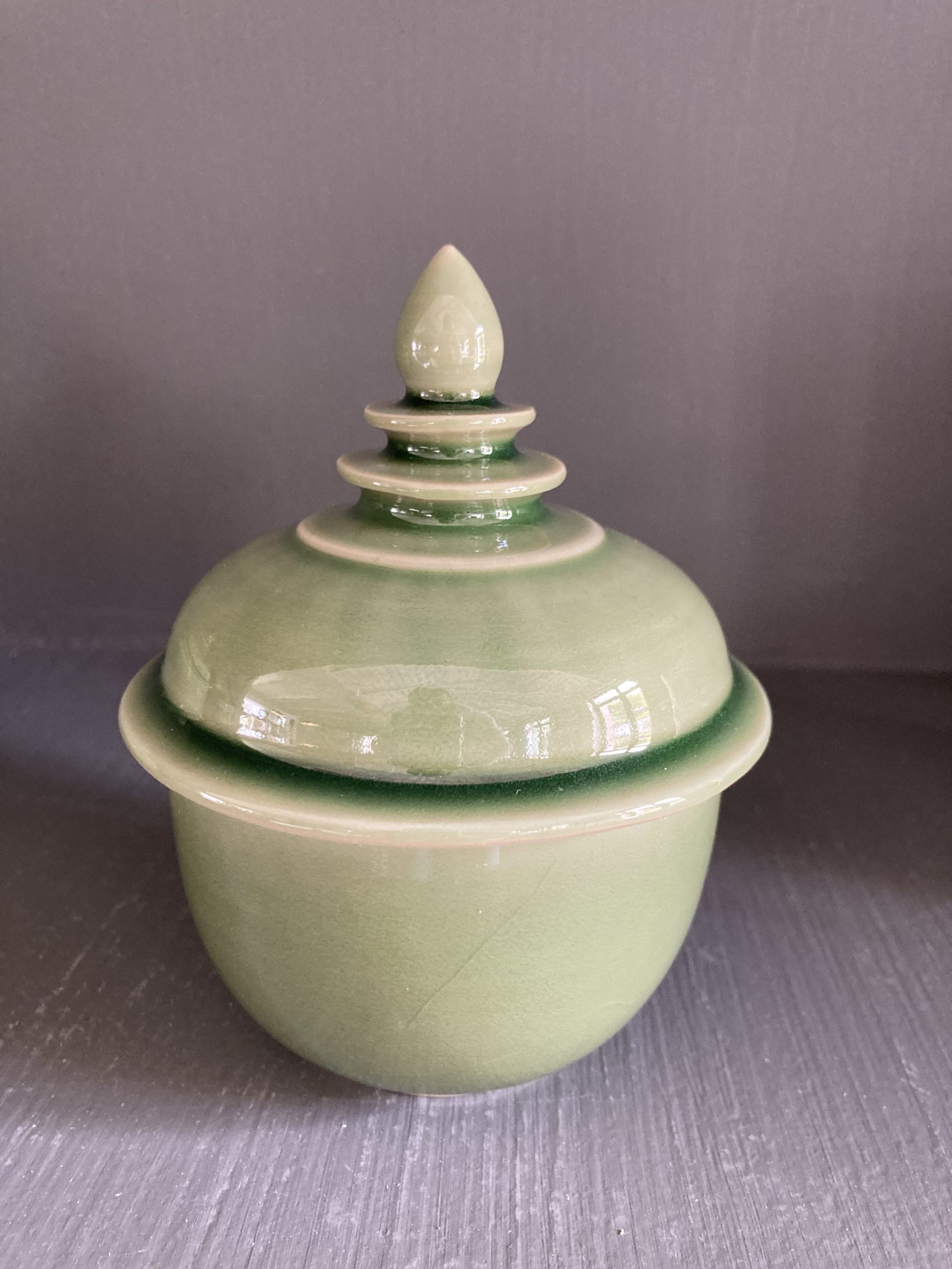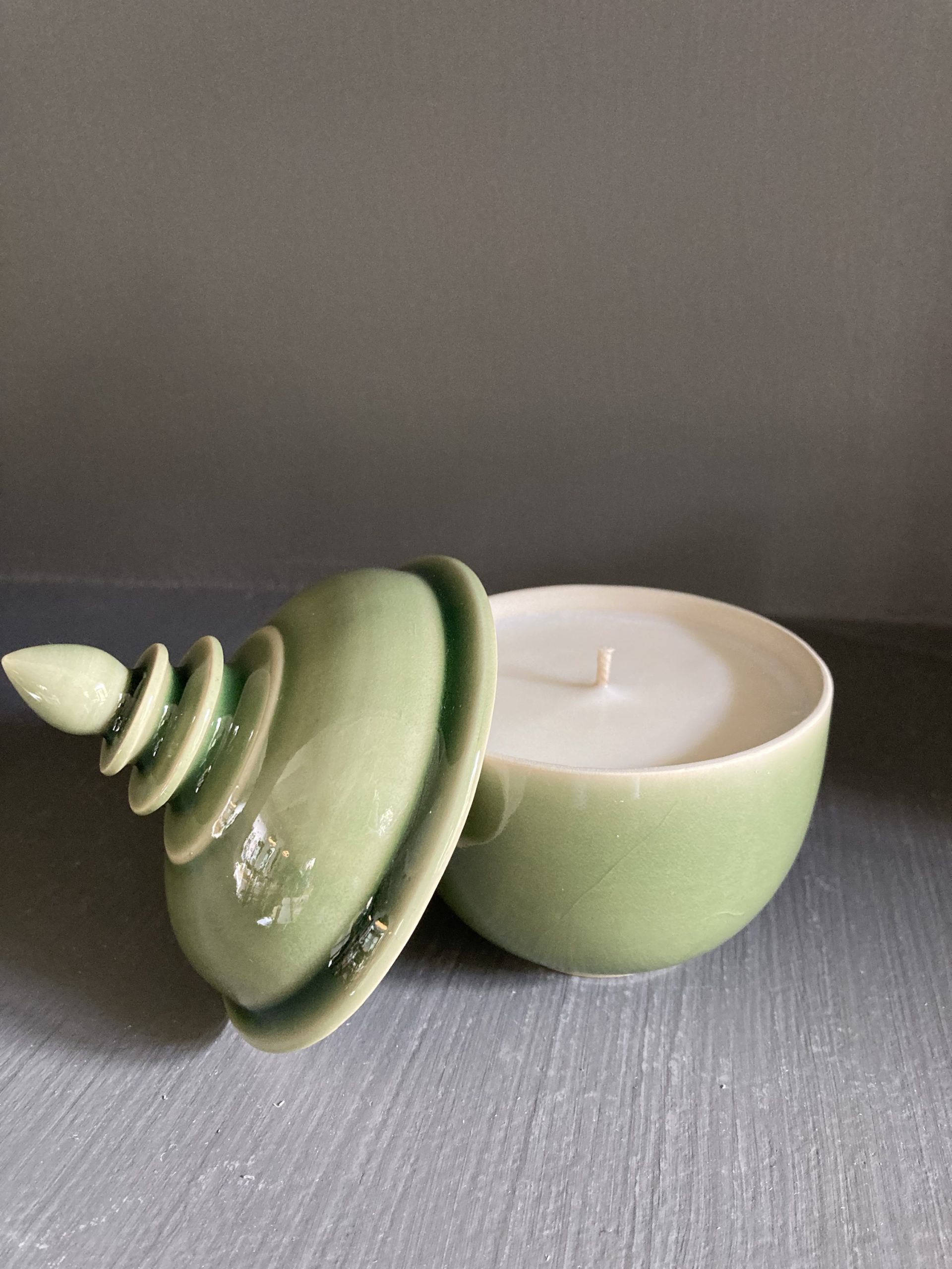 160gms pure soy wax hand poured into one of our exclusive range of handmade ceramics. This stunning pot is glossy celadon green and is 125mm high and 100mm wide.