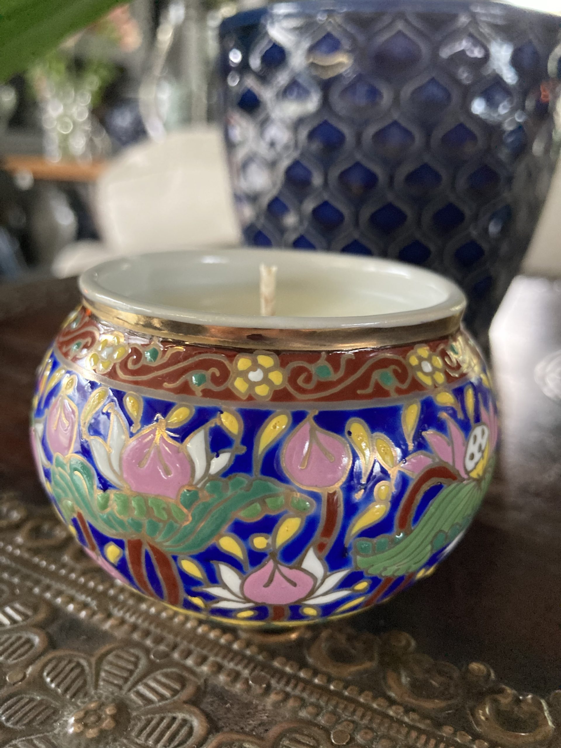 80gms pure soy wax hand poured into one of our exclusive range of handmade ceramics. This gorgeous small trinket bowl is in the Benjarong style.