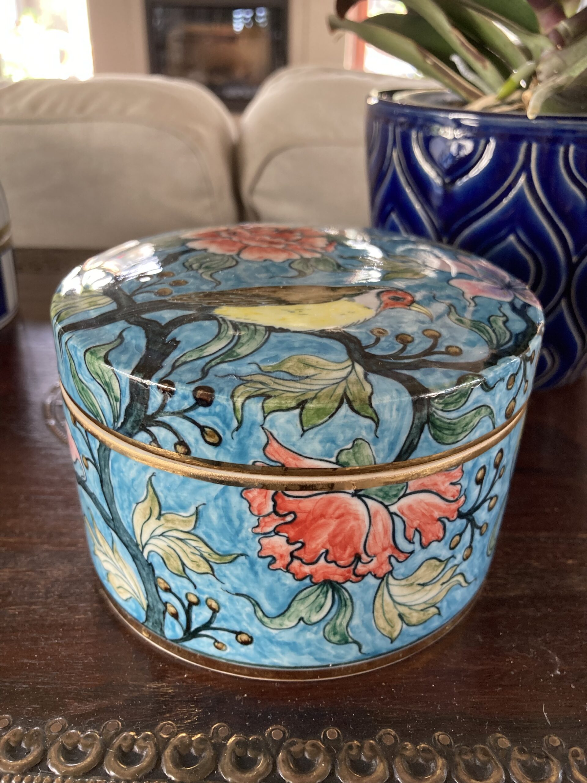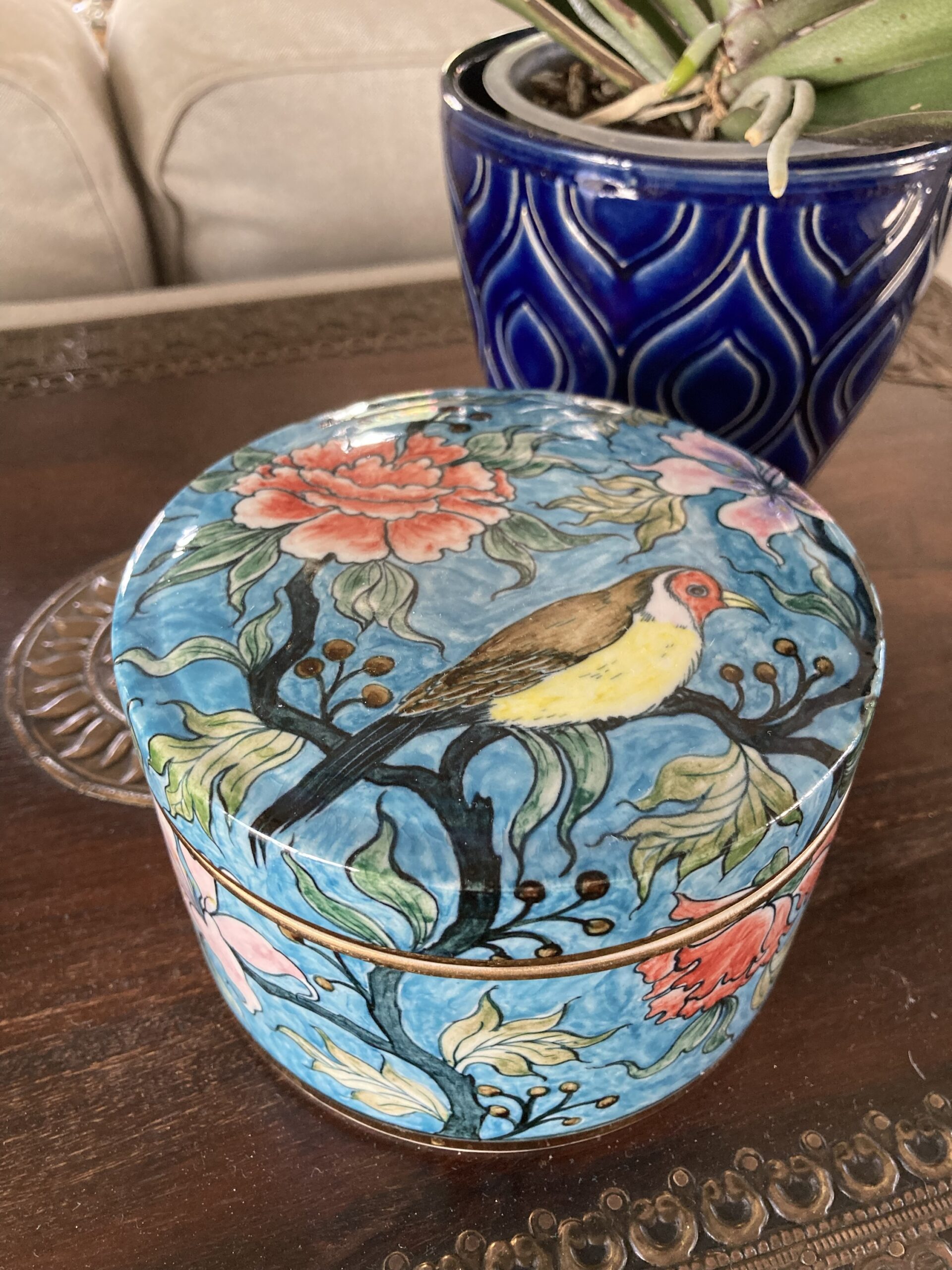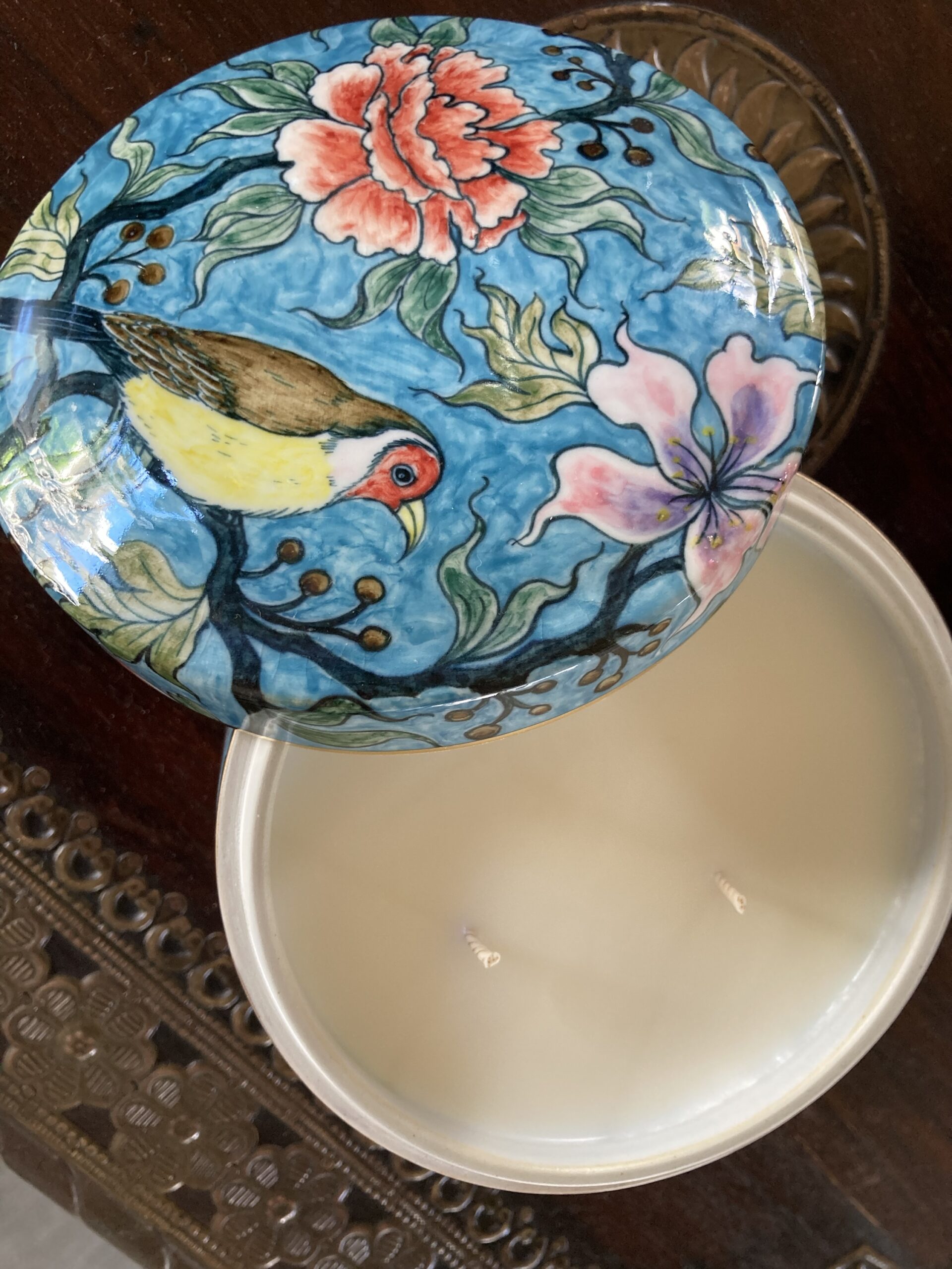400gms pure soy wax hand poured into one of our exclusive range of handmade ceramics. This stunning box is turquoise with a bird and blossoms and is 100mm high and 125mm wide.