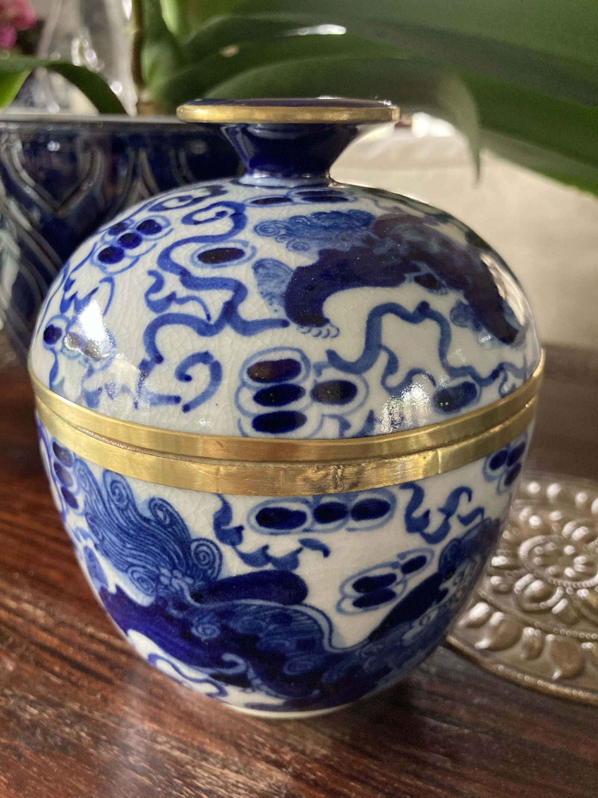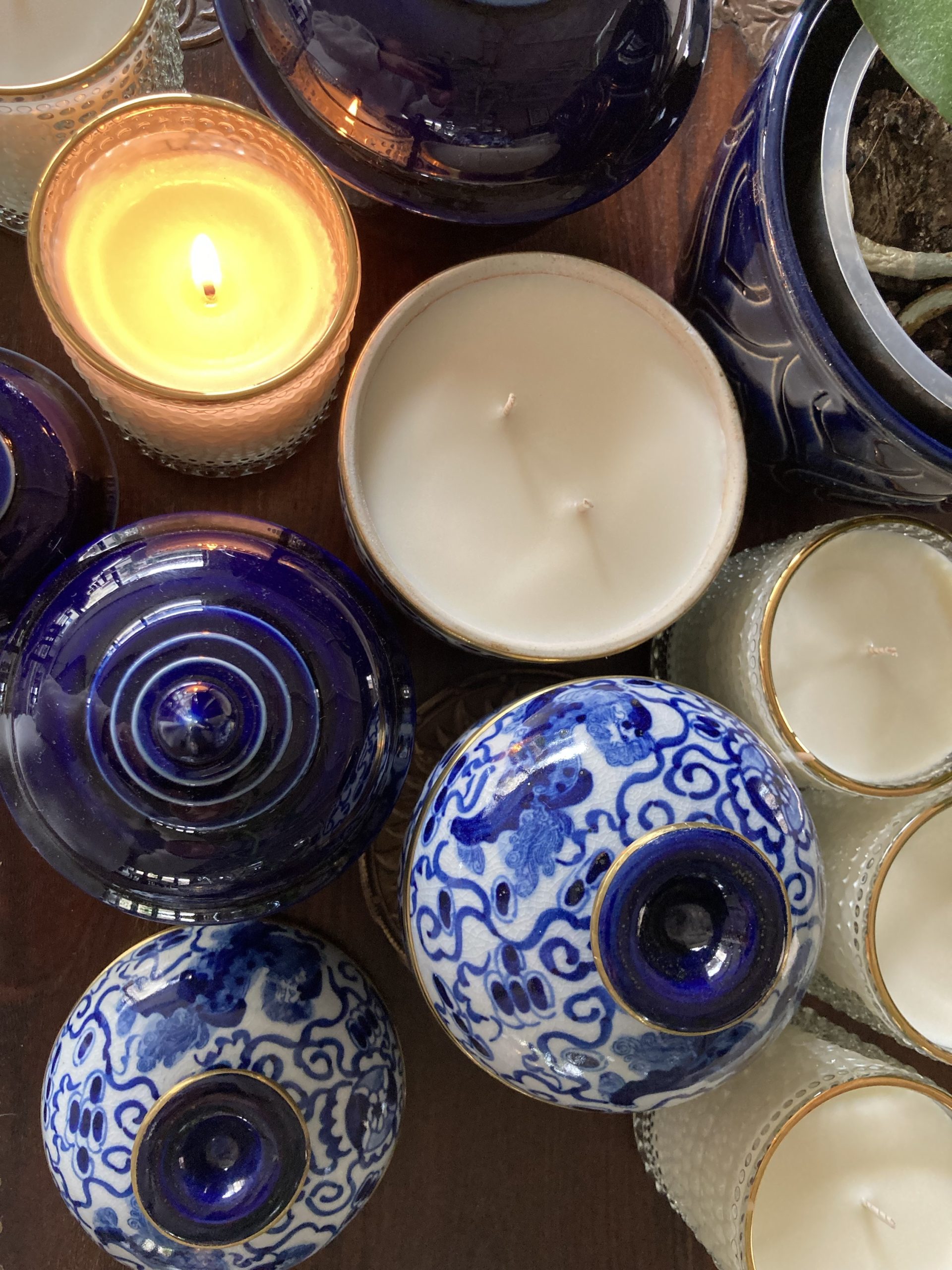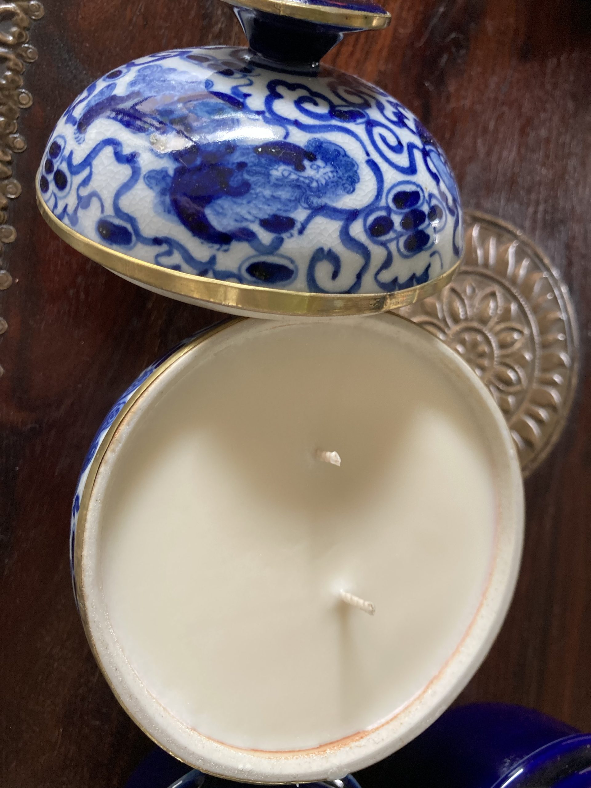 330gms pure soy wax hand poured into one of our exclusive range of handmade ceramics. This jar has a royal blue and white design with metal trim and is 130mm high and 105mm wide