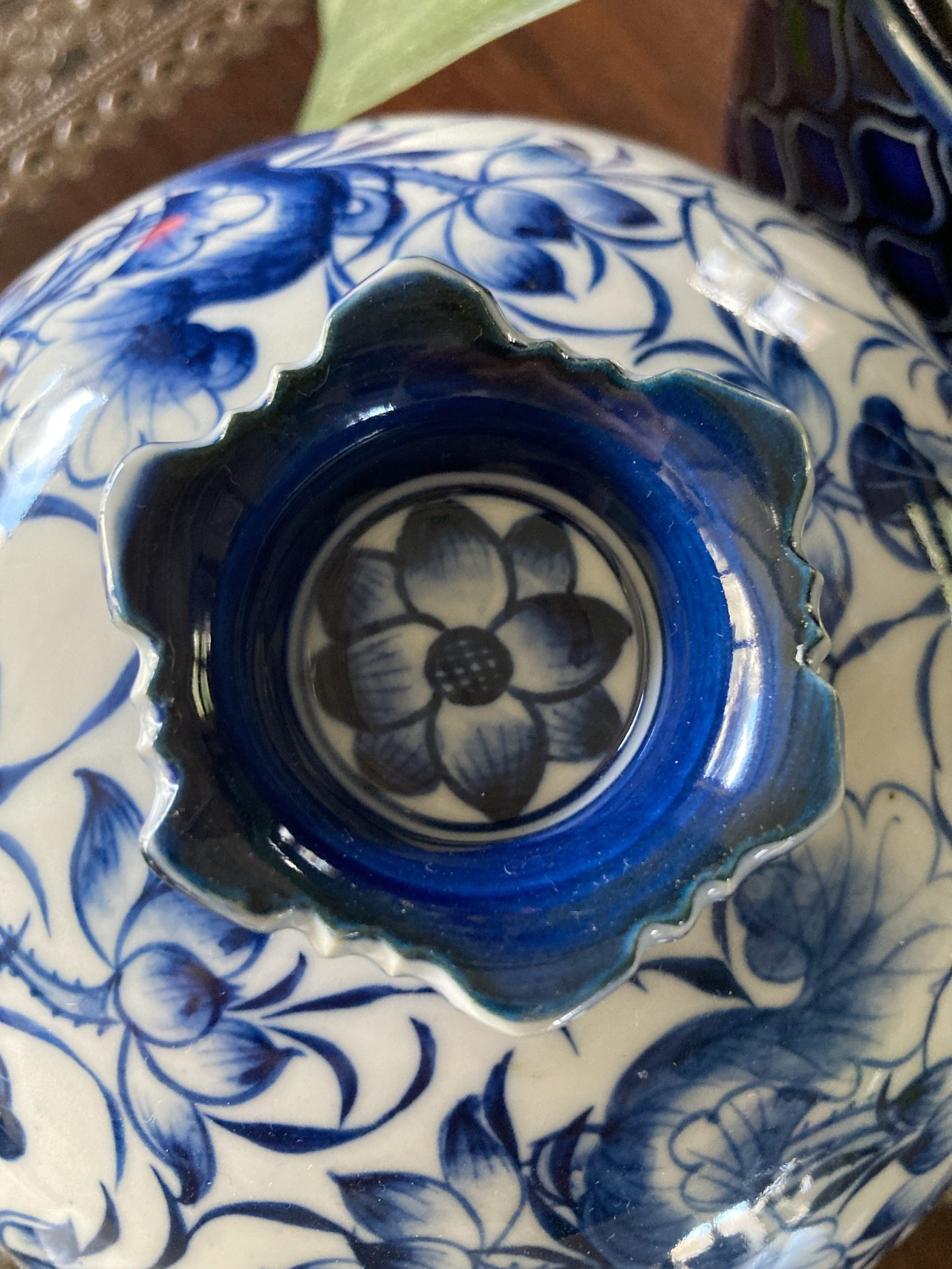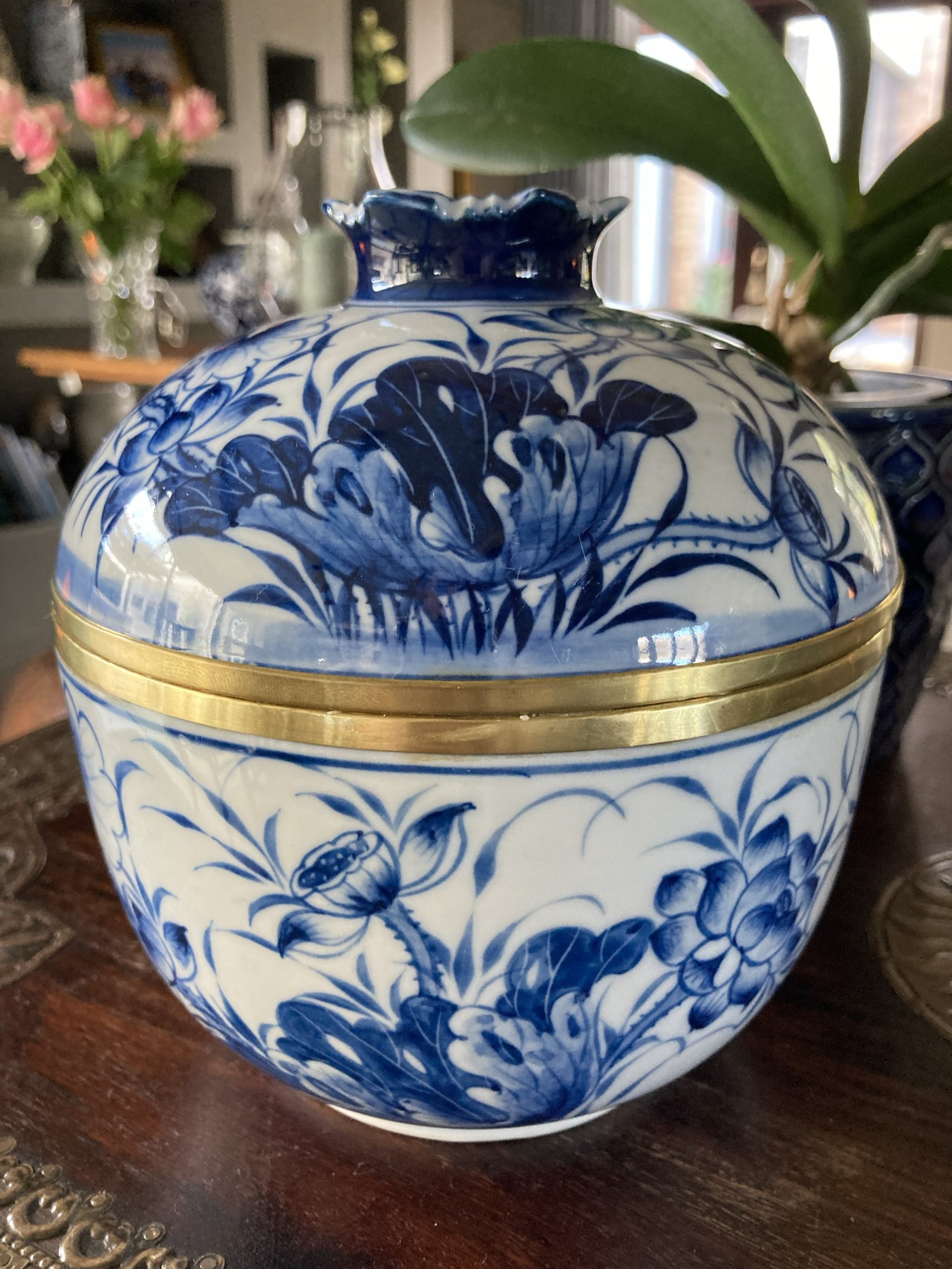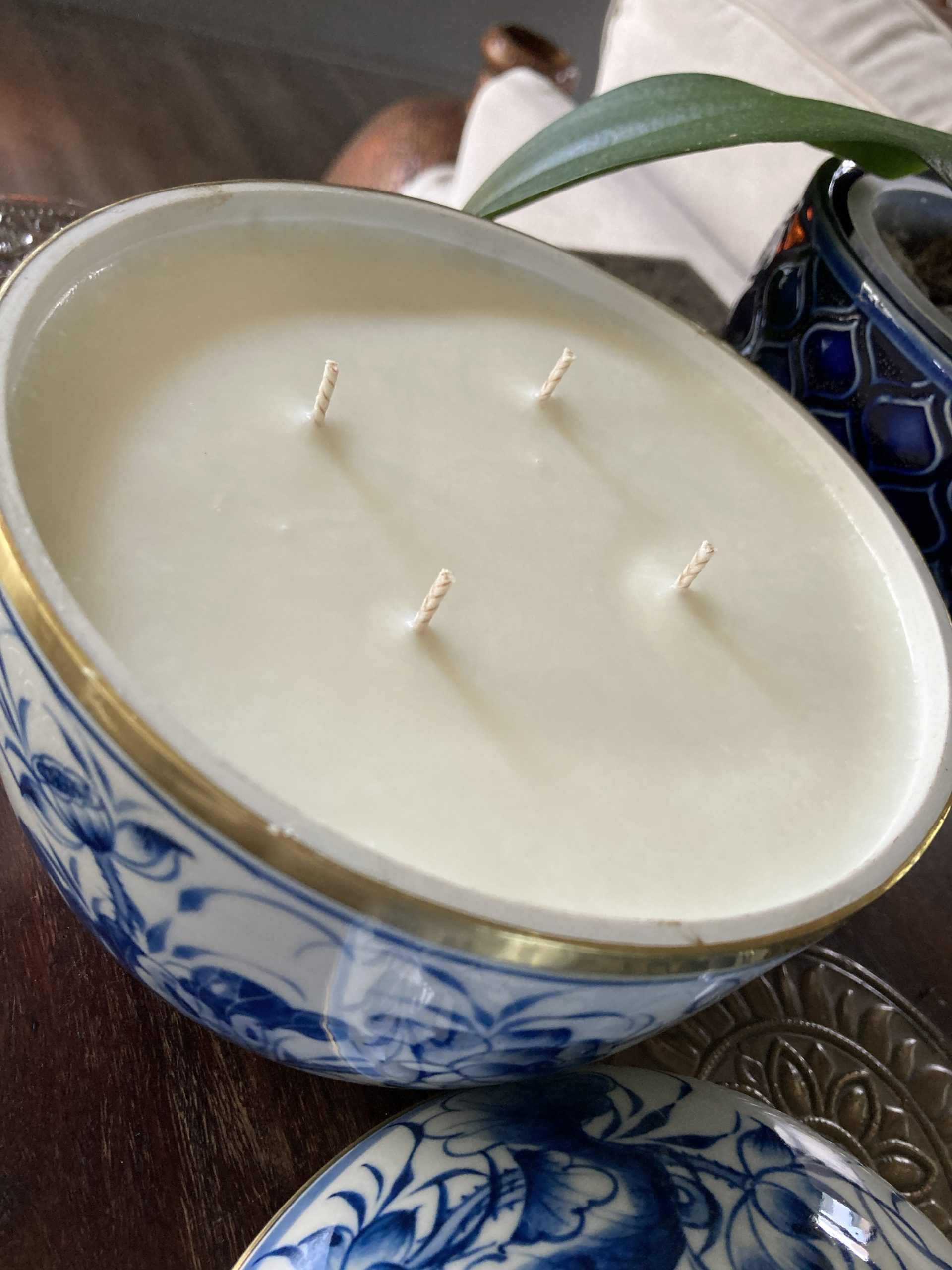 960gms pure soy wax hand poured into one of our exclusive range of handmade ceramics. This elegant jar has a blue and white floral design with a metal trim and is 165mm high and 150mm wide.