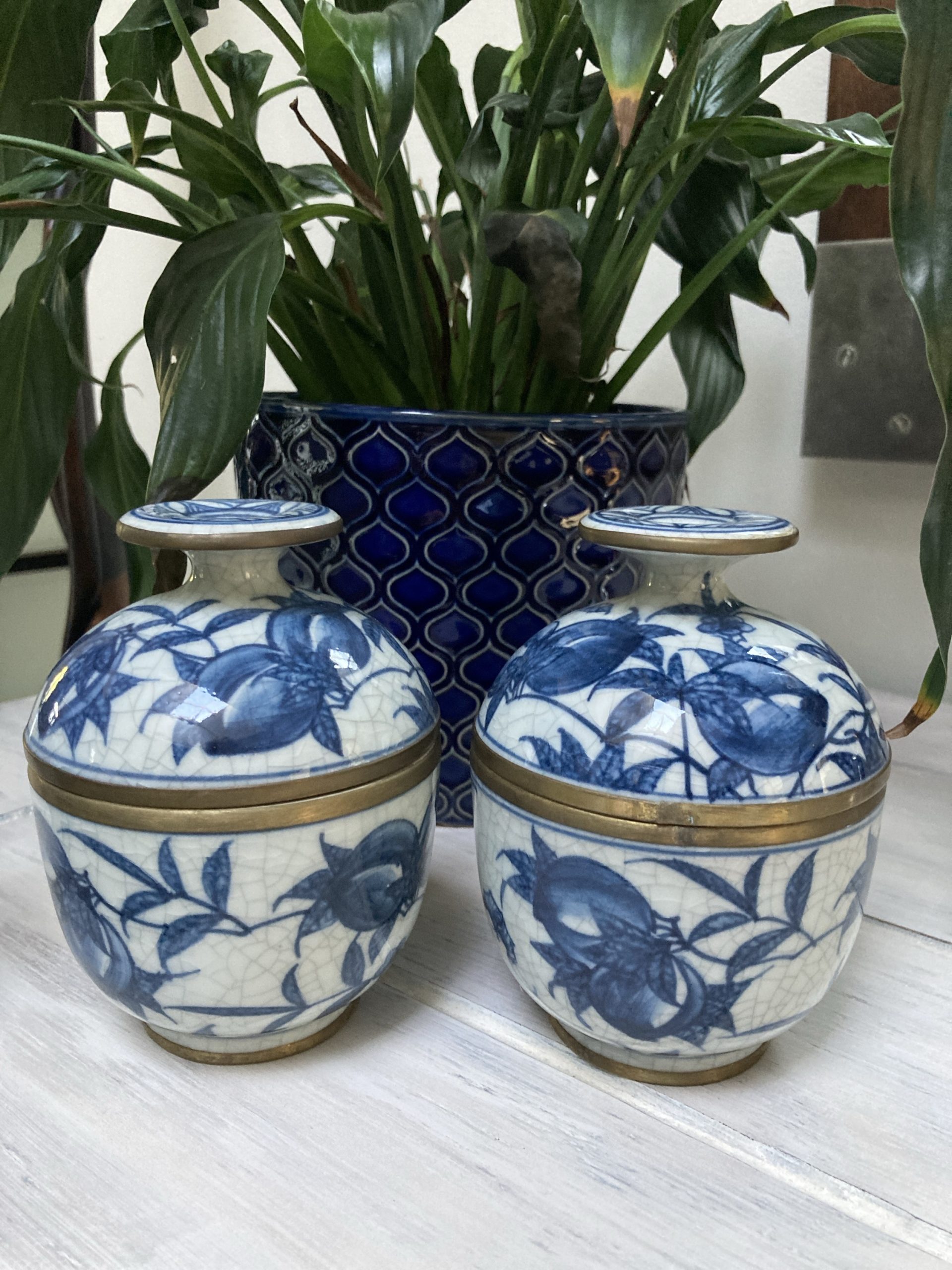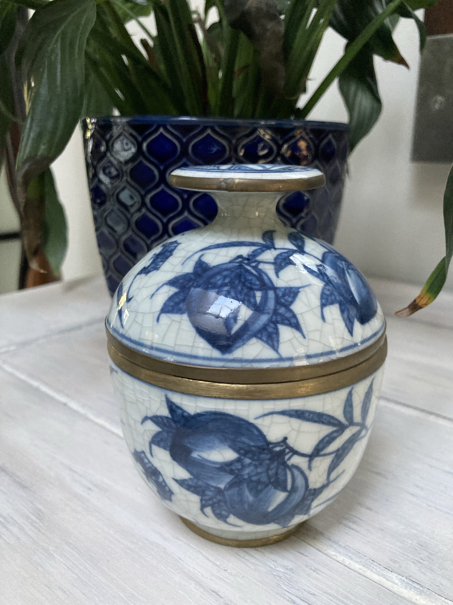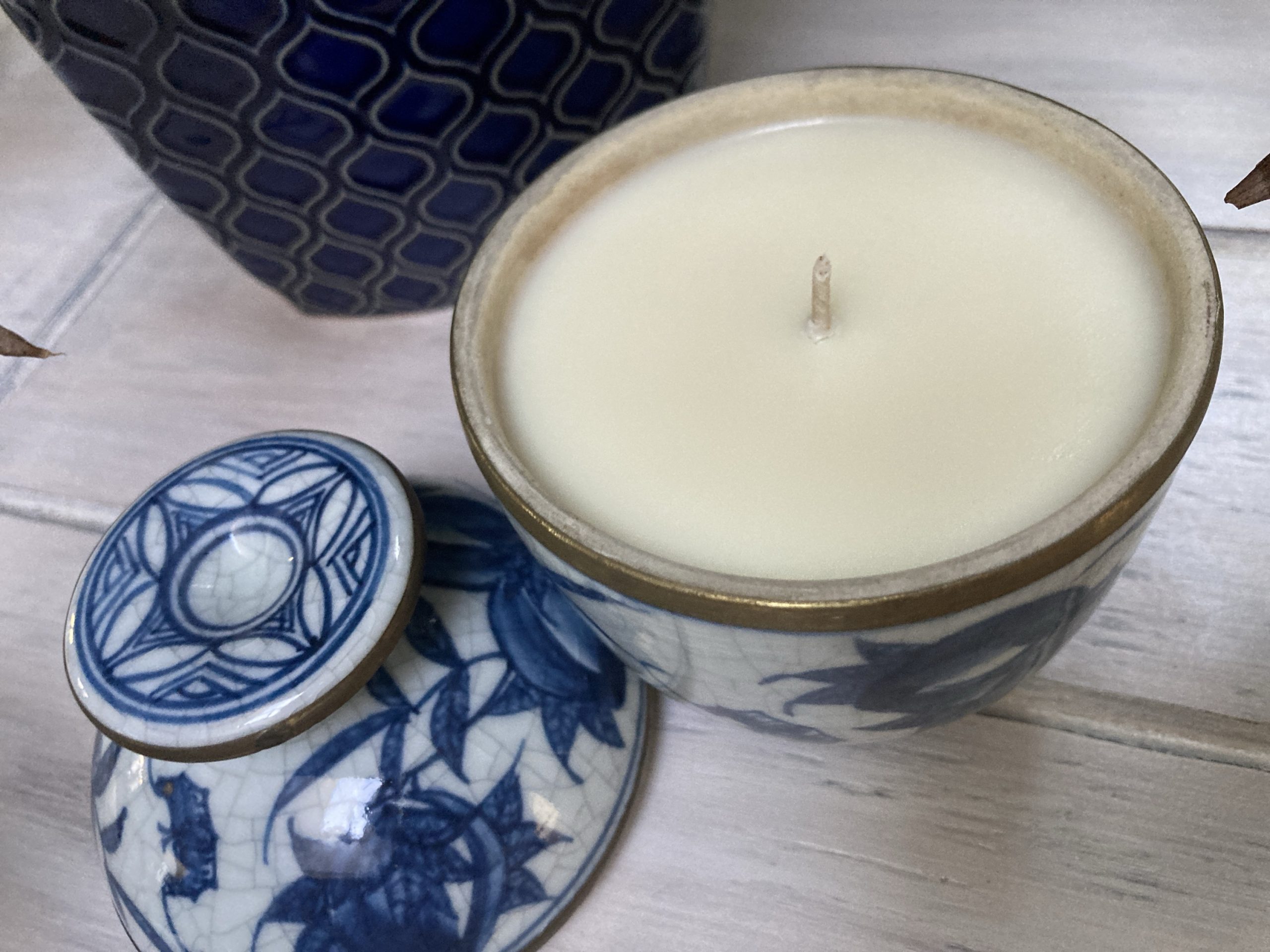 55gms pure soy wax hand poured into one of our exclusive range of handmade ceramics. This jar has a blue and white design with a metal trim and is 80mm high and 65mm wide.