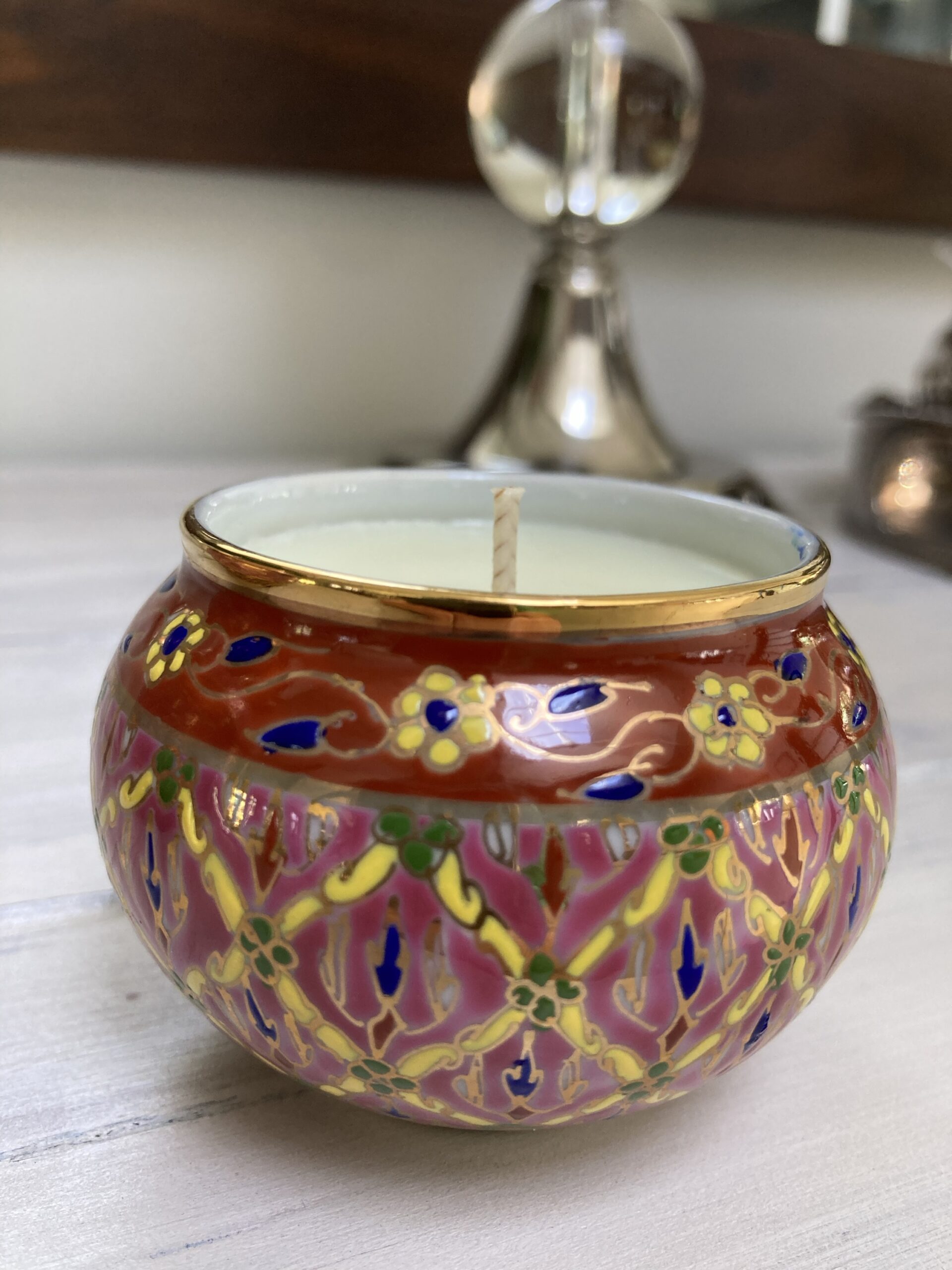 80gms pure soy wax hand poured into one of our exclusive range of handmade ceramics. This gorgeous small trinket bowl is in the Benjarong style.