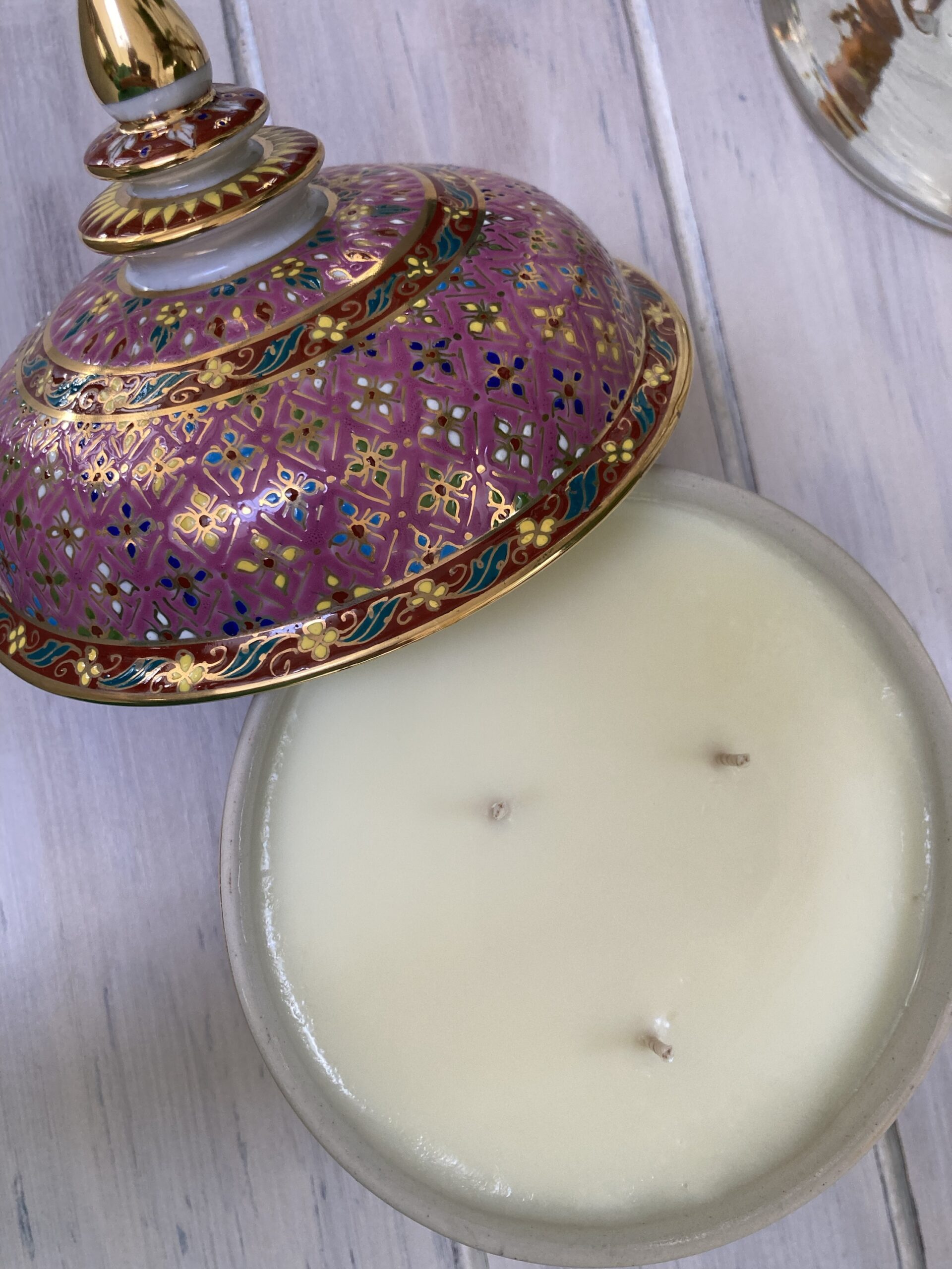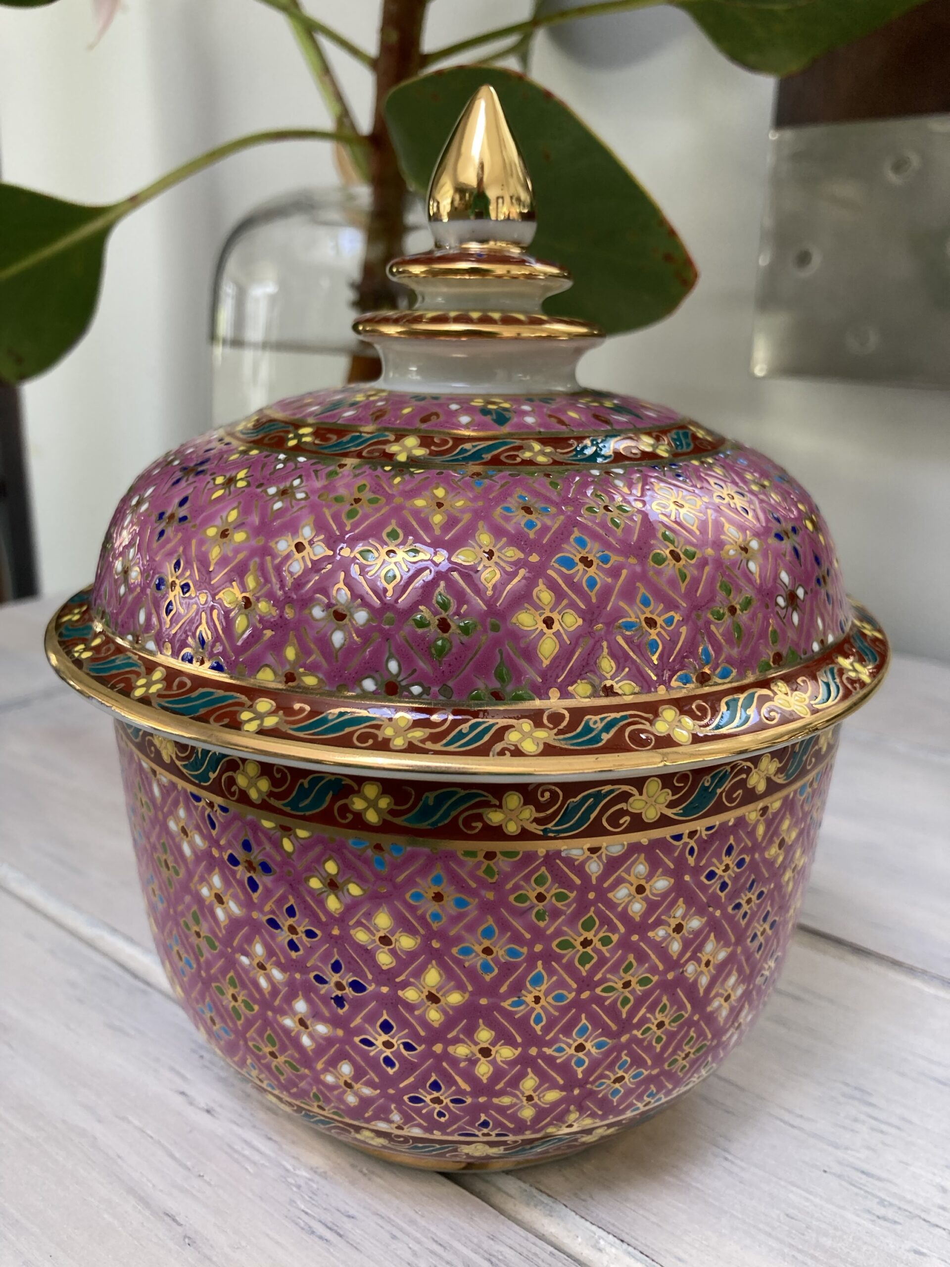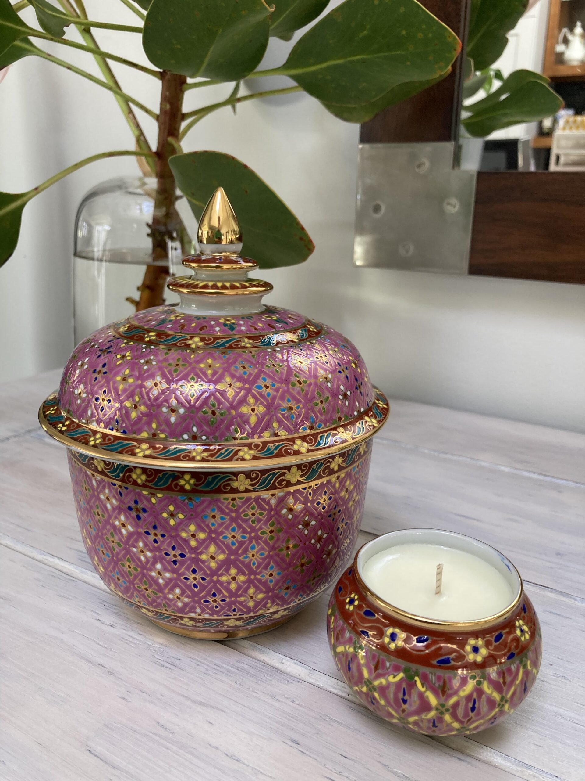 630gms pure soy wax hand poured into one of our exclusive range of handmade ceramics. This Benjarong pot is mauve with rust and gold accents and is 180mm high and 145mm wide.