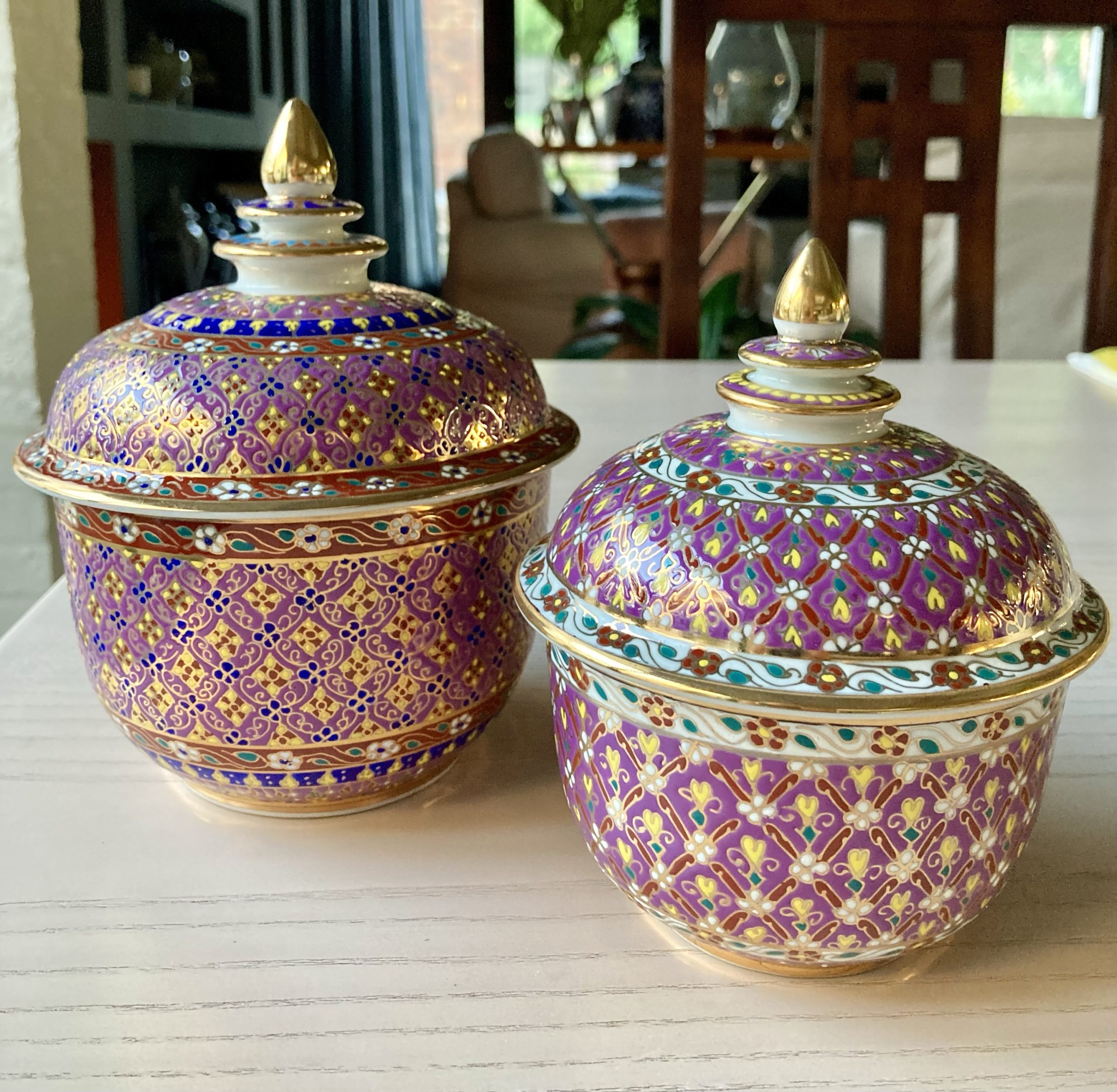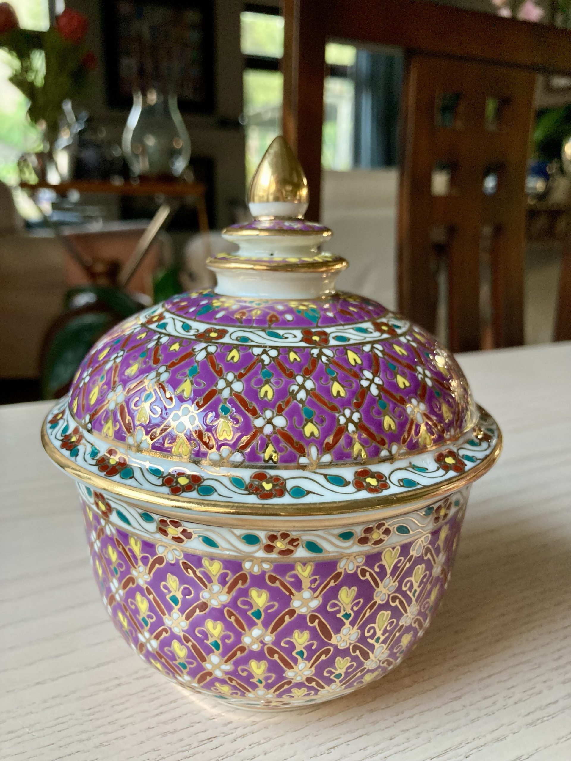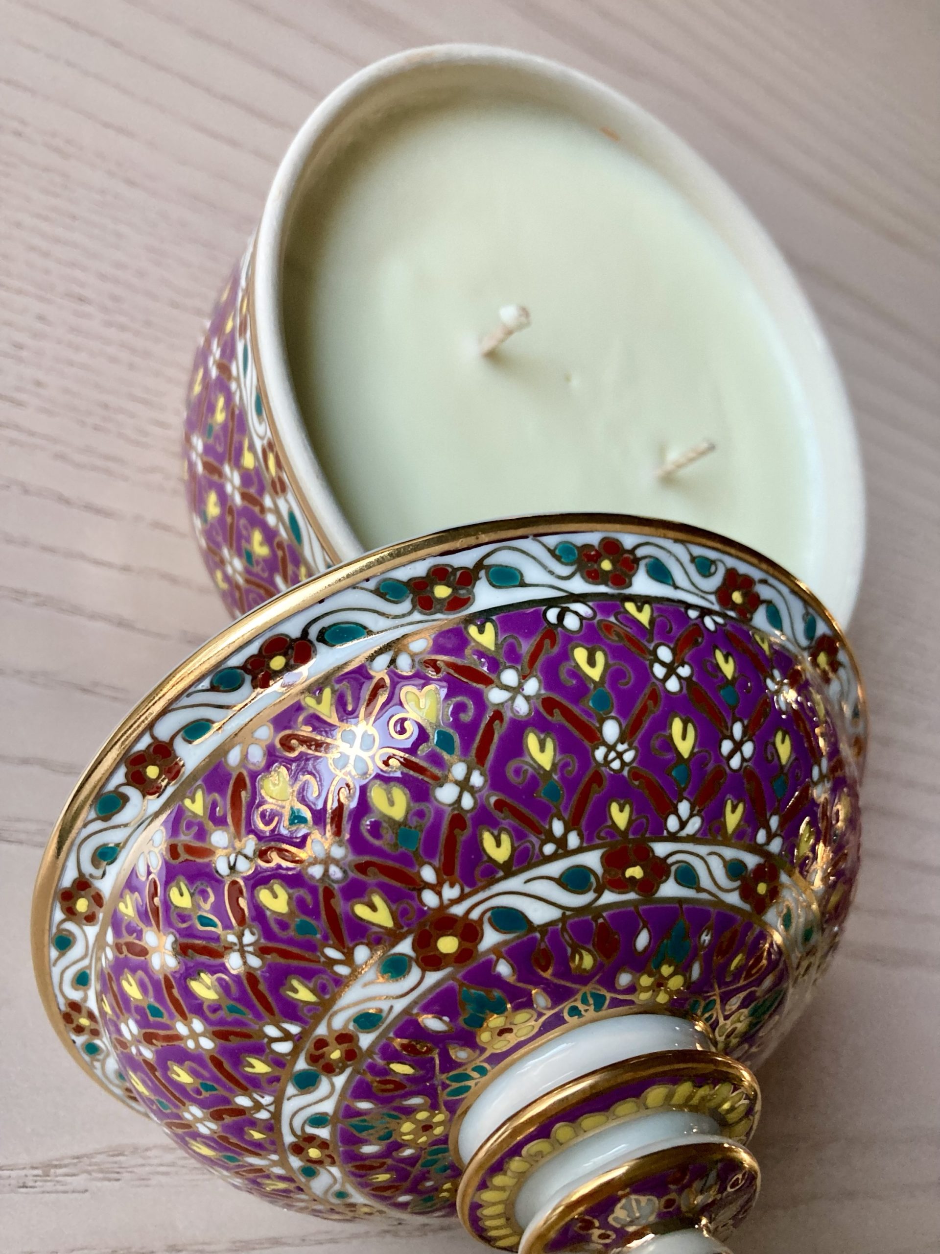 360gms pure soy wax hand poured into one of our exclusive range of handmade ceramics. This Benjarong pot is a soft mulberry colour with gold accents and is 155mm high and 125mm wide.