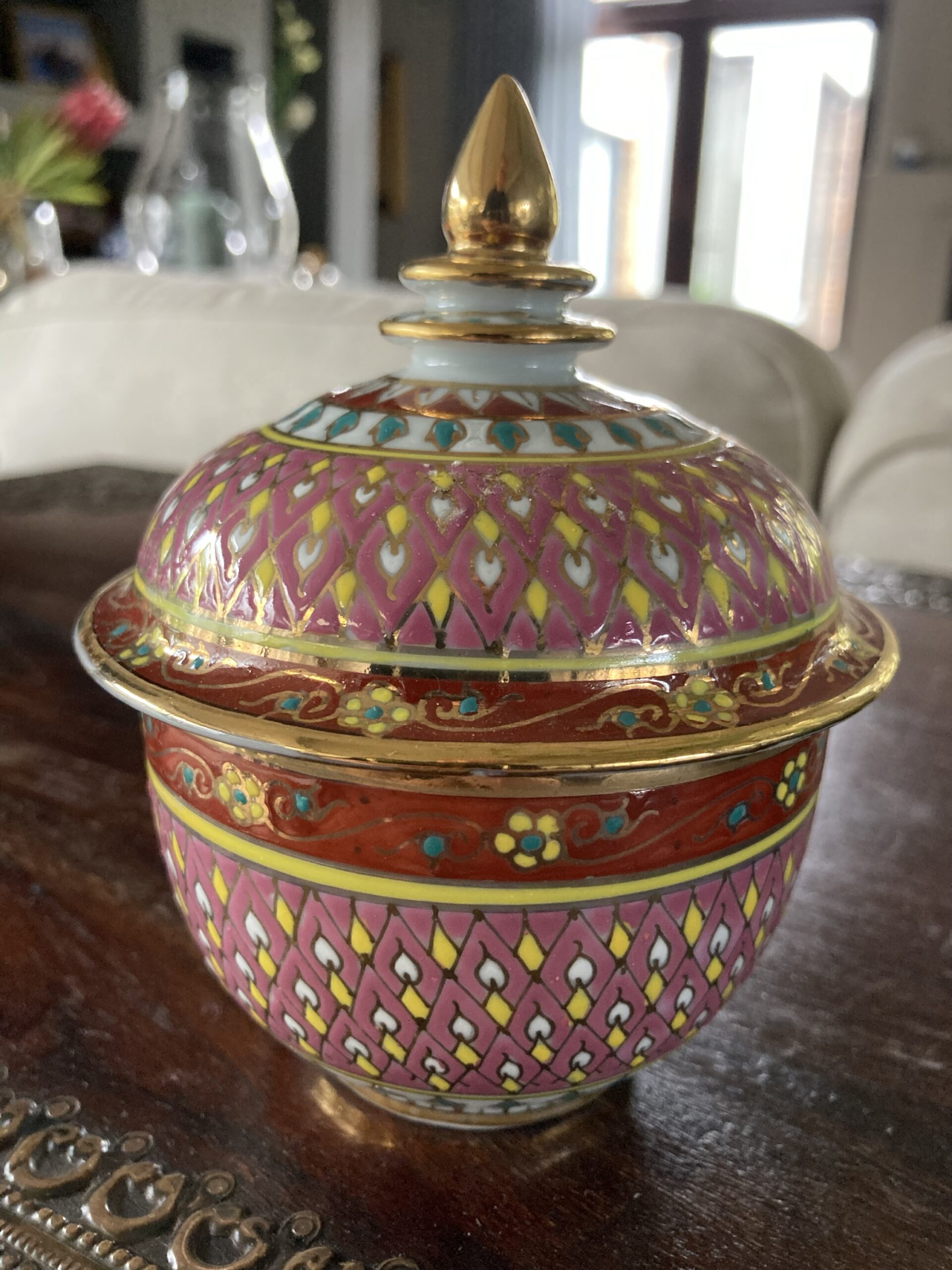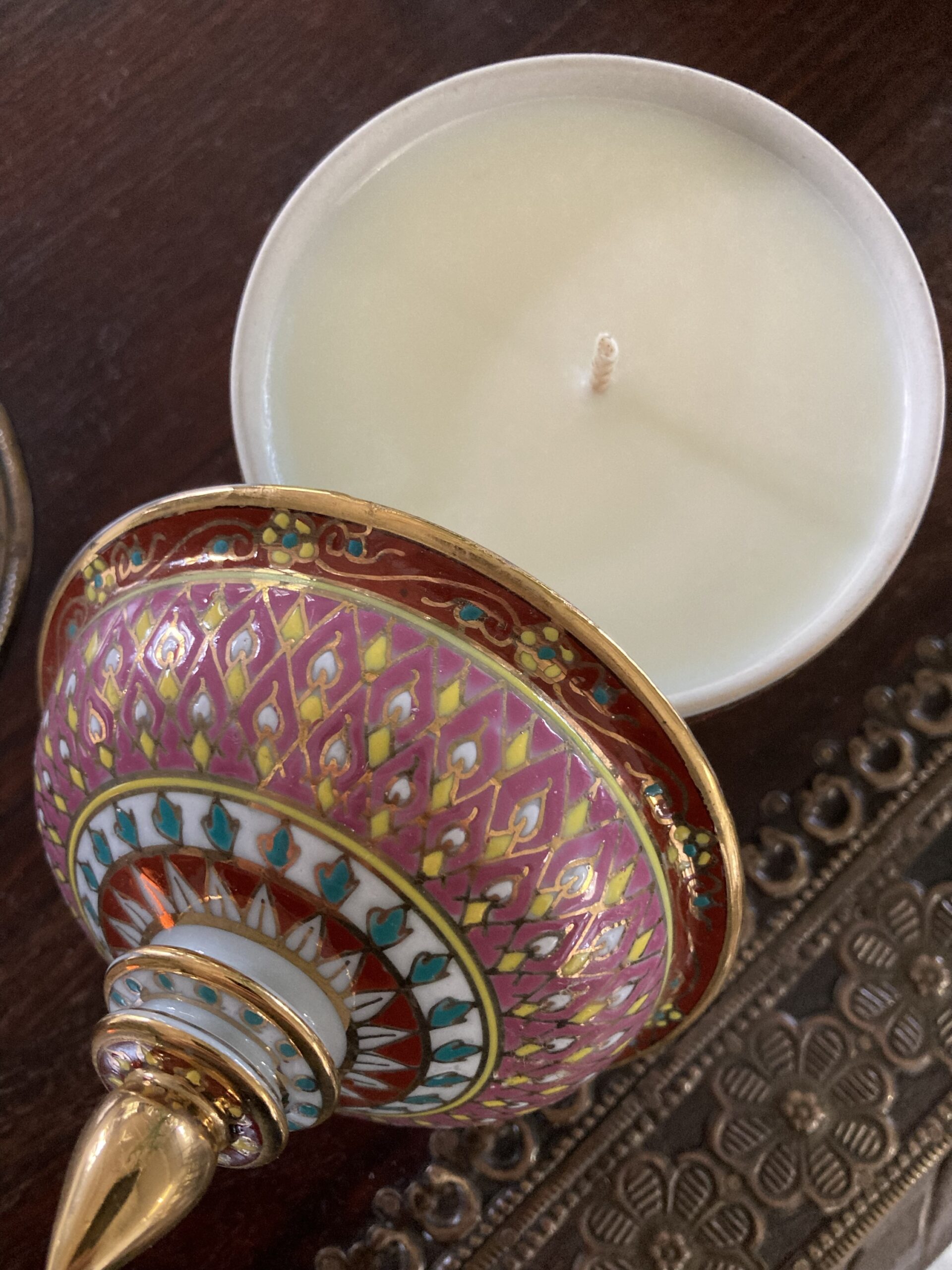 160gms pure soy wax hand poured into one of our exclusive range of handmade ceramics. This Benjarong pot is dusky pink with rust and gold accents and is 155mm high and 125mm wide.