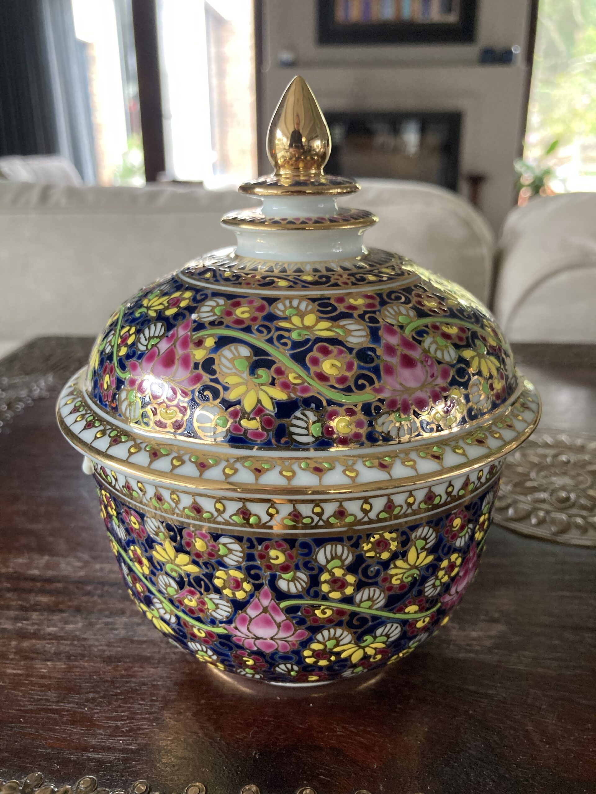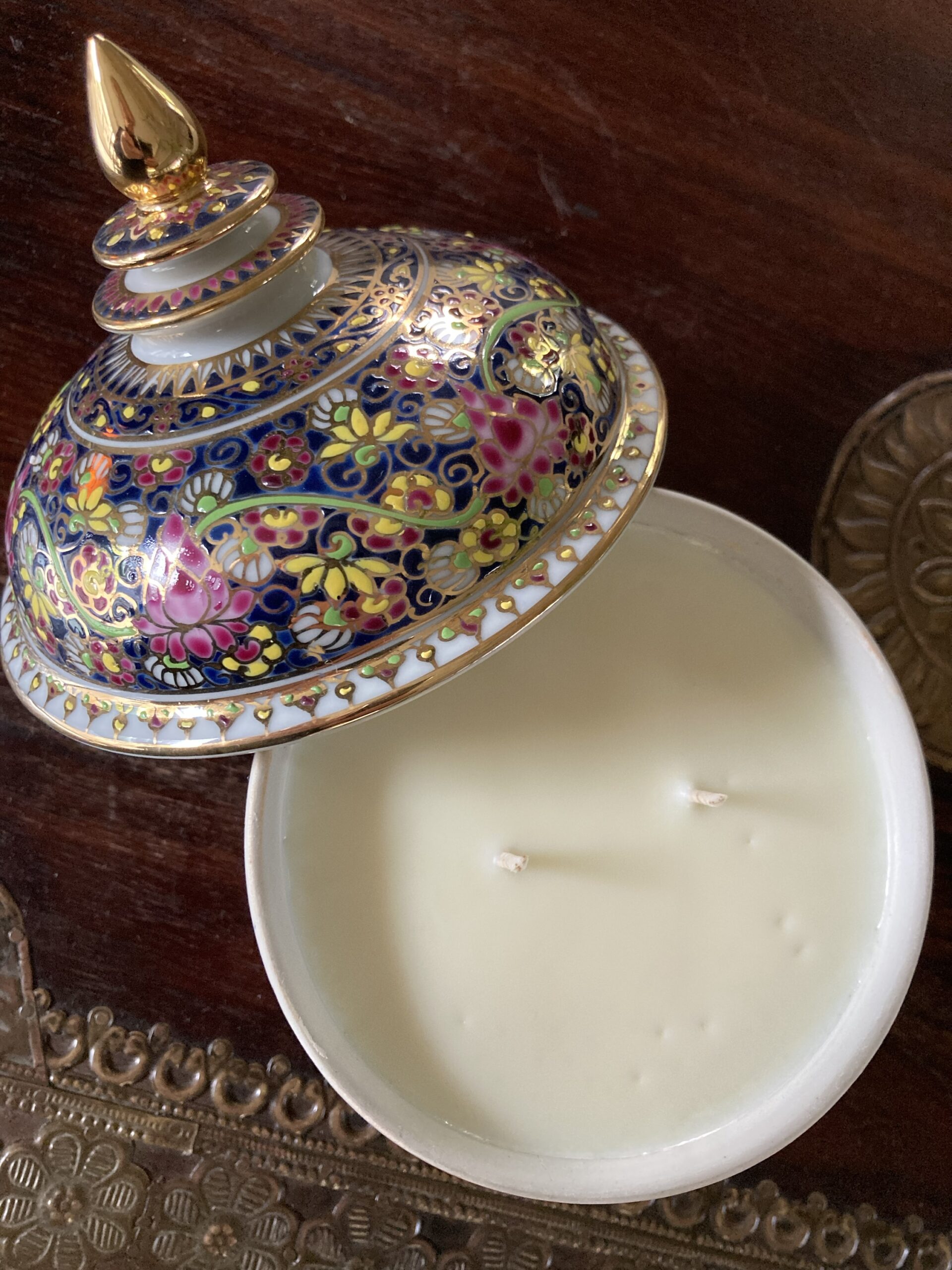 360gms pure soy wax hand poured into one of our exclusive range of handmade ceramics. This Benjarong pot is navy blue with pink, yellow and gold floral accents and is 155mm high and 125mm wide.